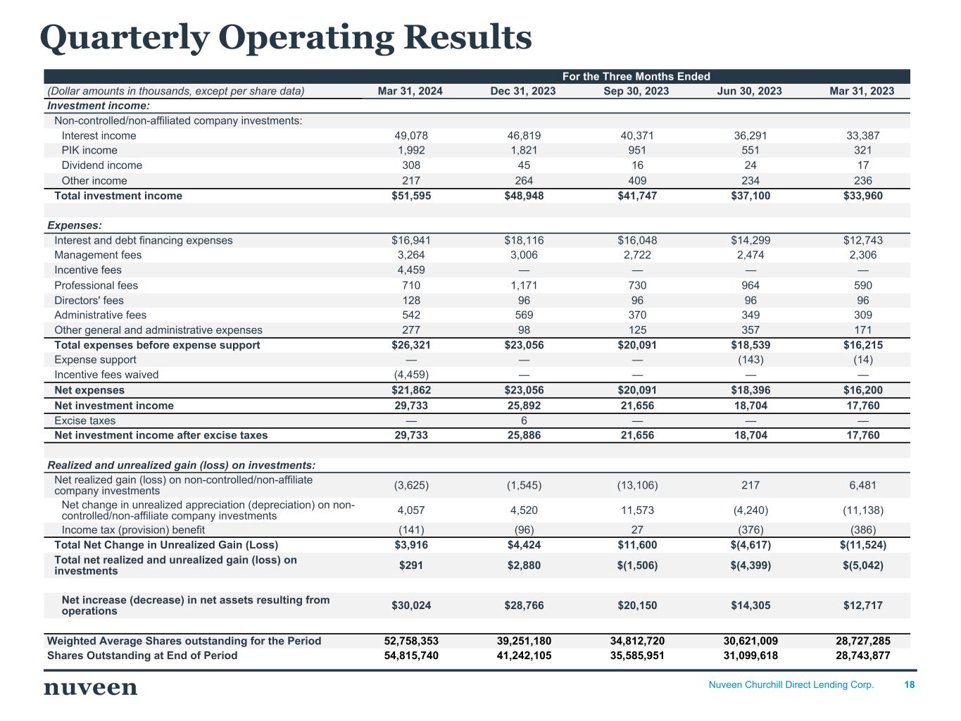 18Nuveen Churchill Direct Lending Corp. For the Three Months Ended (Dollar amounts in thousands, except per share data) Mar 31, 2024 Dec 31, 2023 Sep 30, 2023 Jun 30, 2023 Mar 31, 2023 Investment income: Non-controlled/non-affiliated company investments: Interest income 49,078 46,819 40,371 36,291 33,387 PIK income 1,992 1,821 951 551 321 Dividend income 308 45 16 24 17 Other income 217 264 409 234 236 Total investment income $51,595 $48,948 $41,747 $37,100 $33,960 Expenses: Interest and debt financing expenses $16,941 $18,116 $16,048 $14,299 $12,743 Management fees 3,264 3,006 2,722 2,474 2,306 Incentive fees 4,459 — — — — Professional fees 710 1,171 730 964 590 Directors' fees 128 96 96 96 96 Administrative fees 542 569 370 349 309 Other general and administrative expenses 277 98 125 357 171 Total expenses before expense support $26,321 $23,056 $20,091 $18,539 $16,215 Expense support — — — (143) (14) Incentive fees waived (4,459) — — — — Net expenses $21,862 $23,056 $20,091 $18,396 $16,200 Net investment income 29,733 25,892 21,656 18,704 17,760 Excise taxes — 6 — — — Net investment income after excise taxes 29,733 25,886 21,656 18,704 17,760 Realized and unrealized gain (loss) on investments: Net realized gain (loss) on non-controlled/non-affiliate company investments (3,625) (1,545) (13,106) 217 6,481 Net change in unrealized appreciation (depreciation) on non- controlled/non-affiliate company investments 4,057 4,520 11,573 (4,240) (11,138) Income tax (provision) benefit (141) (96) 27 (376) (386) Total Net Change in Unrealized Gain (Loss) $3,916 $4,424 $11,600 $(4,617) $(11,524) Total net realized and unrealized gain (loss) on investments $291 $2,880 $(1,506) $(4,399) $(5,042) Net increase (decrease) in net assets resulting from operations $30,024 $28,766 $20,150 $14,305 $12,717 Weighted Average Shares outstanding for the Period 52,758,353 39,251,180 34,812,720 30,621,009 28,727,285 Shares Outstanding at End of Period 54,815,740 41,242,105 35,585,951 31,099,618 28,743,877 Quarterly Operating Results