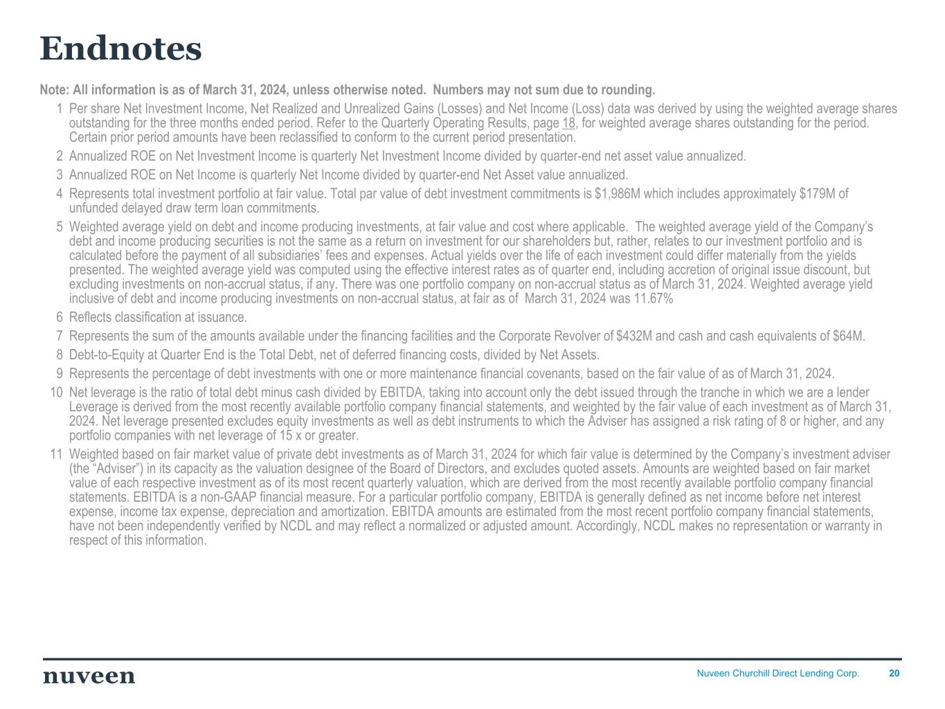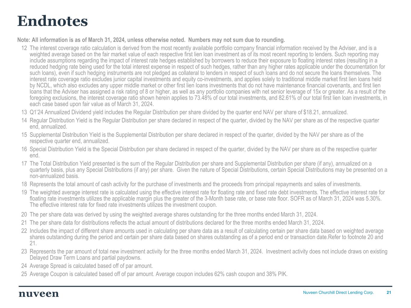 20Nuveen Churchill Direct Lending Corp. Endnotes Note: All information is as of March 31, 2024, unless otherwise noted. Numbers may not sum due to rounding. 1 Per share Net Investment Income, Net Realized and Unrealized Gains (Losses) and Net Income (Loss) data was derived by using the weighted average shares outstanding for the three months ended period. Refer to the Quarterly Operating Results, page 18, for weighted average shares outstanding for the period. Certain prior period amounts have been reclassified to conform to the current period presentation. 2 Annualized ROE on Net Investment Income is quarterly Net Investment Income divided by quarter-end net asset value annualized. 3 Annualized ROE on Net Income is quarterly Net Income divided by quarter-end Net Asset value annualized. 4 Represents total investment portfolio at fair value. Total par value of debt investment commitments is $1,986M which includes approximately $179M of unfunded delayed draw term loan commitments. 5 Weighted average yield on debt and income producing investments, at fair value and cost where applicable. The weighted average yield of the Company’s debt and income producing securities is not the same as a return on investment for our shareholders but, rather, relates to our investment portfolio and is calculated before the payment of all subsidiaries’ fees and expenses. Actual yields over the life of each investment could differ materially from the yields presented. The weighted average yield was computed using the effective interest rates as of quarter end, including accretion of original issue discount, but excluding investments on non-accrual status, if any. There was one portfolio company on non-accrual status as of March 31, 2024. Weighted average yield inclusive of debt and income producing investments on non-accrual status, at fair as of March 31, 2024 was 11.67% 6 Reflects classification at issuance. 7 Represents the sum of the amounts available under the financing facilities and the Corporate Revolver of $432M and cash and cash equivalents of $64M. 8 Debt-to-Equity at Quarter End is the Total Debt, net of deferred financing costs, divided by Net Assets. 9 Represents the percentage of debt investments with one or more maintenance financial covenants, based on the fair value of as of March 31, 2024. 10 Net leverage is the ratio of total debt minus cash divided by EBITDA, taking into account only the debt issued through the tranche in which we are a lender Leverage is derived from the most recently available portfolio company financial statements, and weighted by the fair value of each investment as of March 31, 2024. Net leverage presented excludes equity investments as well as debt instruments to which the Adviser has assigned a risk rating of 8 or higher, and any portfolio companies with net leverage of 15 x or greater. 11 Weighted based on fair market value of private debt investments as of March 31, 2024 for which fair value is determined by the Company’s investment adviser (the “Adviser”) in its capacity as the valuation designee of the Board of Directors, and excludes quoted assets. Amounts are weighted based on fair market value of each respective investment as of its most recent quarterly valuation, which are derived from the most recently available portfolio company financial statements. EBITDA is a non-GAAP financial measure. For a particular portfolio company, EBITDA is generally defined as net income before net interest expense, income tax expense, depreciation and amortization. EBITDA amounts are estimated from the most recent portfolio company financial statements, have not been independently verified by NCDL and may reflect a normalized or adjusted amount. Accordingly, NCDL makes no representation or warranty in respect of this information.