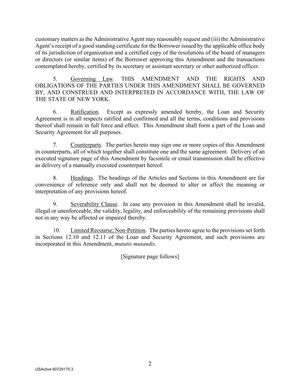 2 USActive 60729175.3 customary matters as the Administrative Agent may reasonably request and (iii) the Administrative Agent’s receipt of a good standing certificate for the Borrower issued by the applicable office body of its jurisdiction of organization and a certified copy of the resolutions of the board of managers or directors (or similar items) of the Borrower approving this Amendment and the transactions contemplated hereby, certified by its secretary or assistant secretary or other authorized officer. Governing Law. THIS AMENDMENT AND THE RIGHTS AND OBLIGATIONS OF THE PARTIES UNDER THIS AMENDMENT SHALL BE GOVERNED BY, AND CONSTRUED AND INTERPRETED IN ACCORDANCE WITH, THE LAW OF THE STATE OF NEW YORK. Ratification. Except as expressly amended hereby, the Loan and Security Agreement is in all respects ratified and confirmed and all the terms, conditions and provisions thereof shall remain in full force and effect. This Amendment shall form a part of the Loan and Security Agreement for all purposes. Counterparts. The parties hereto may sign one or more copies of this Amendment in counterparts, all of which together shall constitute one and the same agreement. Delivery of an executed signature page of this Amendment by facsimile or email transmission shall be effective as delivery of a manually executed counterpart hereof. Headings. The headings of the Articles and Sections in this Amendment are for convenience of reference only and shall not be deemed to alter or affect the meaning or interpretation of any provisions hereof. Severability Clause. In case any provision in this Amendment shall be invalid, illegal or unenforceable, the validity, legality, and enforceability of the remaining provisions shall not in any way be affected or impaired thereby. Limited Recourse; Non-Petition. The parties hereto agree to the provisions set forth in Sections 12.10 and 12.11 of the Loan and Security Agreement, and such provisions are incorporated in this Amendment, mutatis mutandis. [Signature page follows]