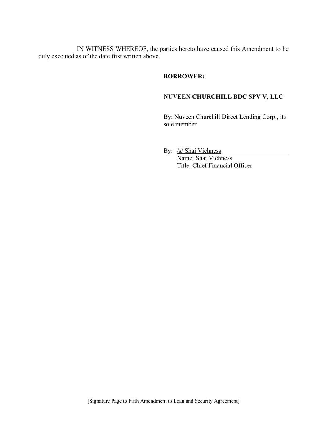 [Signature Page to Fifth Amendment to Loan and Security Agreement] IN WITNESS WHEREOF, the parties hereto have caused this Amendment to be duly executed as of the date first written above. BORROWER: NUVEEN CHURCHILL BDC SPV V, LLC By: Nuveen Churchill Direct Lending Corp., its sole member By: /s/ Shai Vichness _____________________ Name: Shai Vichness Title: Chief Financial Officer