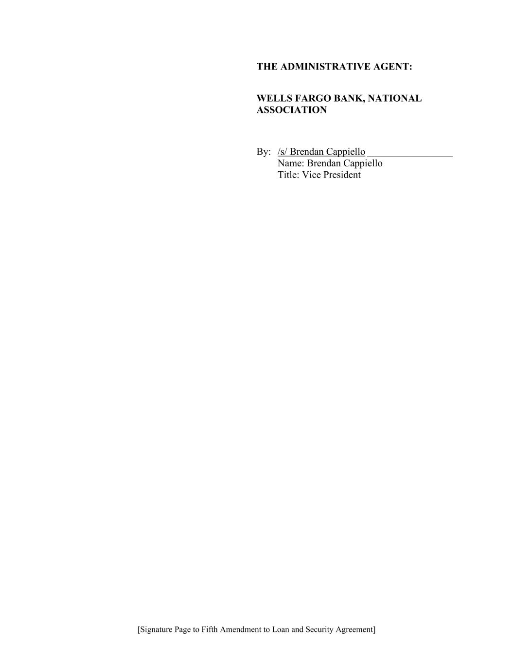 [Signature Page to Fifth Amendment to Loan and Security Agreement] THE ADMINISTRATIVE AGENT: WELLS FARGO BANK, NATIONAL ASSOCIATION By: /s/ Brendan Cappiello _________________ Name: Brendan Cappiello Title: Vice President
