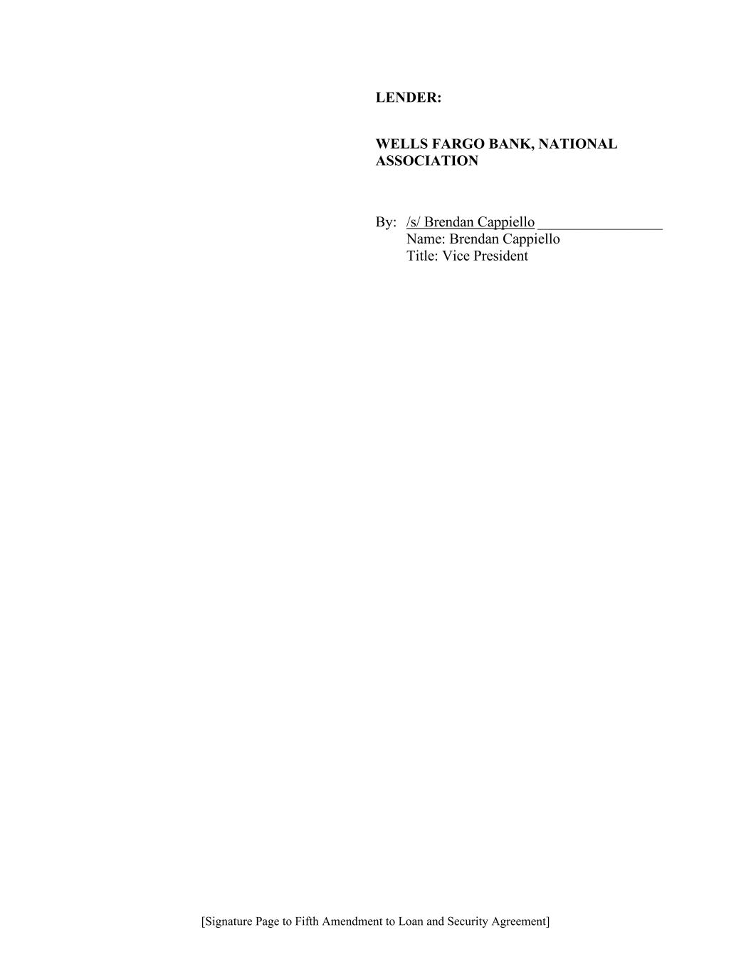 [Signature Page to Fifth Amendment to Loan and Security Agreement] LENDER: WELLS FARGO BANK, NATIONAL ASSOCIATION By: /s/ Brendan Cappiello _________________ Name: Brendan Cappiello Title: Vice President