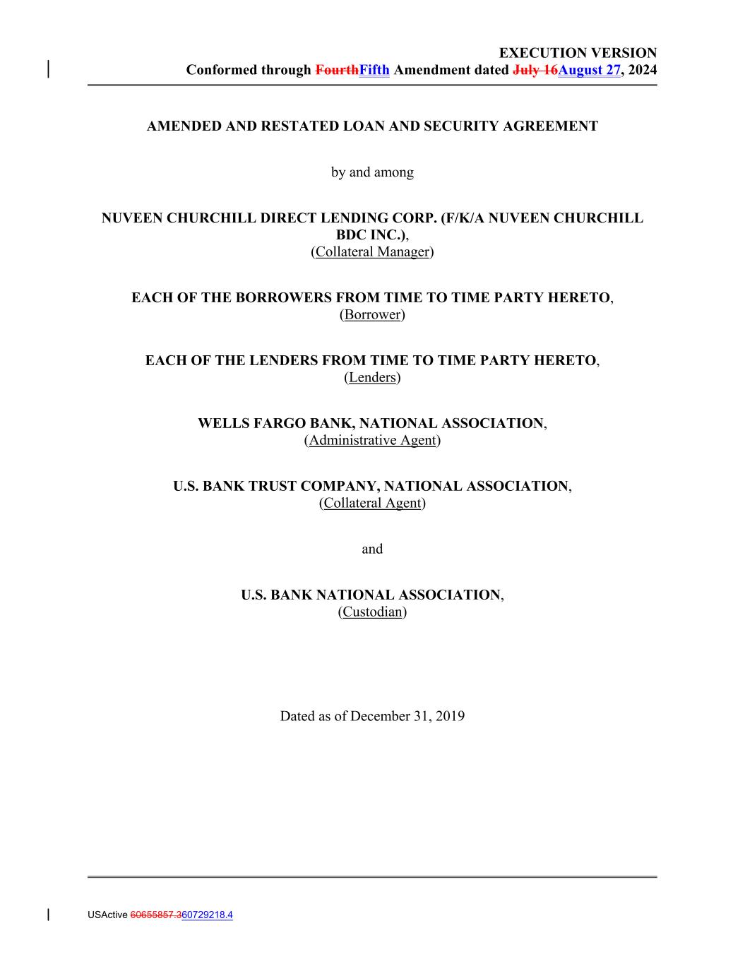 EXECUTION VERSION Conformed through FourthFifth Amendment dated July 16August 27, 2024 AMENDED AND RESTATED LOAN AND SECURITY AGREEMENT by and among NUVEEN CHURCHILL DIRECT LENDING CORP. (F/K/A NUVEEN CHURCHILL BDC INC.), (Collateral Manager) EACH OF THE BORROWERS FROM TIME TO TIME PARTY HERETO, (Borrower) EACH OF THE LENDERS FROM TIME TO TIME PARTY HERETO, (Lenders) WELLS FARGO BANK, NATIONAL ASSOCIATION, (Administrative Agent) U.S. BANK TRUST COMPANY, NATIONAL ASSOCIATION, (Collateral Agent) and U.S. BANK NATIONAL ASSOCIATION, (Custodian) Dated as of December 31, 2019 USActive 60655857.360729218.4
