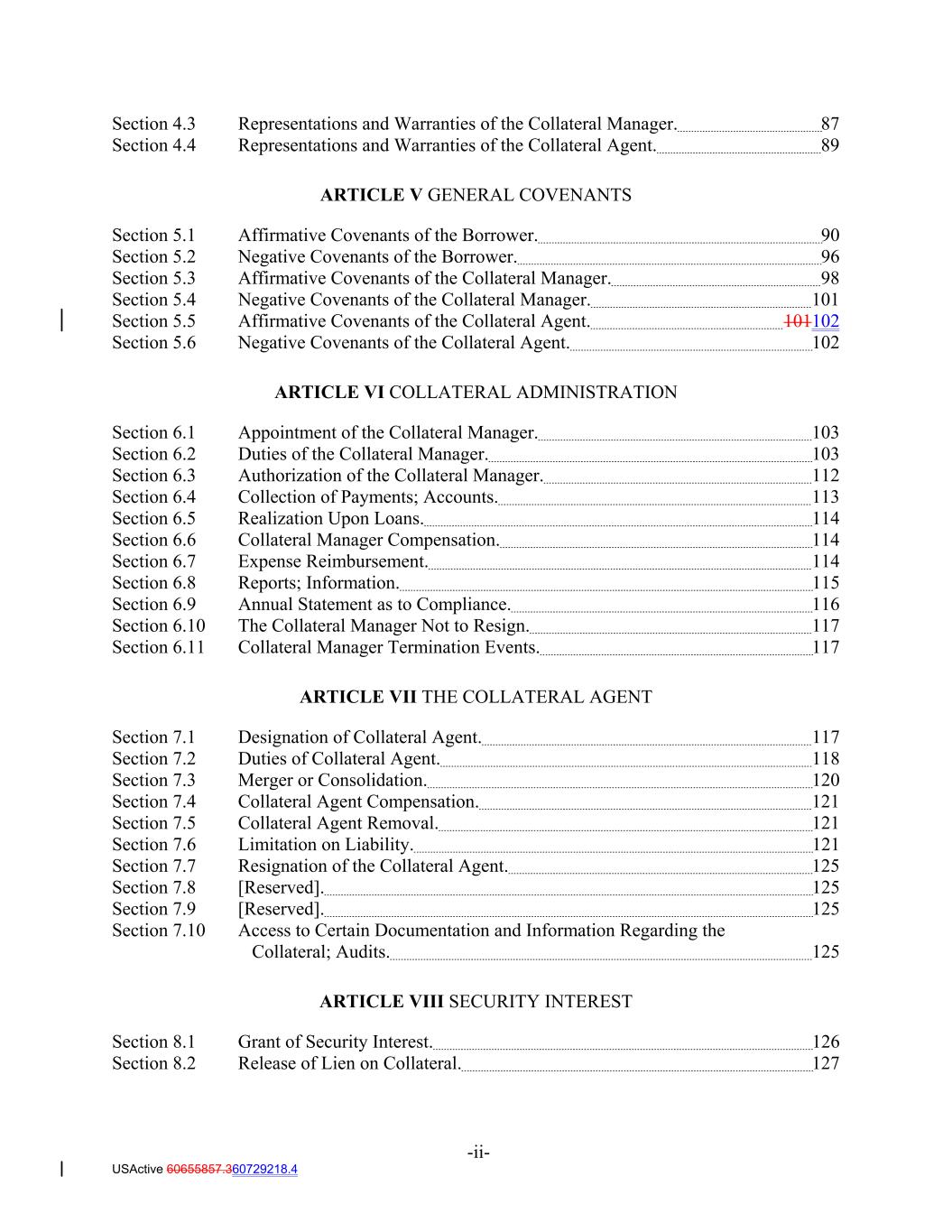 Section 4.3 Representations and Warranties of the Collateral Manager. 87 Section 4.4 Representations and Warranties of the Collateral Agent. 89 ARTICLE V GENERAL COVENANTS Section 5.1 Affirmative Covenants of the Borrower. 90 Section 5.2 Negative Covenants of the Borrower. 96 Section 5.3 Affirmative Covenants of the Collateral Manager. 98 Section 5.4 Negative Covenants of the Collateral Manager. 101 Section 5.5 Affirmative Covenants of the Collateral Agent. 101102 Section 5.6 Negative Covenants of the Collateral Agent. 102 ARTICLE VI COLLATERAL ADMINISTRATION Section 6.1 Appointment of the Collateral Manager. 103 Section 6.2 Duties of the Collateral Manager. 103 Section 6.3 Authorization of the Collateral Manager. 112 Section 6.4 Collection of Payments; Accounts. 113 Section 6.5 Realization Upon Loans. 114 Section 6.6 Collateral Manager Compensation. 114 Section 6.7 Expense Reimbursement. 114 Section 6.8 Reports; Information. 115 Section 6.9 Annual Statement as to Compliance. 116 Section 6.10 The Collateral Manager Not to Resign. 117 Section 6.11 Collateral Manager Termination Events. 117 ARTICLE VII THE COLLATERAL AGENT Section 7.1 Designation of Collateral Agent. 117 Section 7.2 Duties of Collateral Agent. 118 Section 7.3 Merger or Consolidation. 120 Section 7.4 Collateral Agent Compensation. 121 Section 7.5 Collateral Agent Removal. 121 Section 7.6 Limitation on Liability. 121 Section 7.7 Resignation of the Collateral Agent. 125 Section 7.8 [Reserved]. 125 Section 7.9 [Reserved]. 125 Section 7.10 Access to Certain Documentation and Information Regarding the Collateral; Audits. 125 ARTICLE VIII SECURITY INTEREST Section 8.1 Grant of Security Interest. 126 Section 8.2 Release of Lien on Collateral. 127 -ii- USActive 60655857.360729218.4