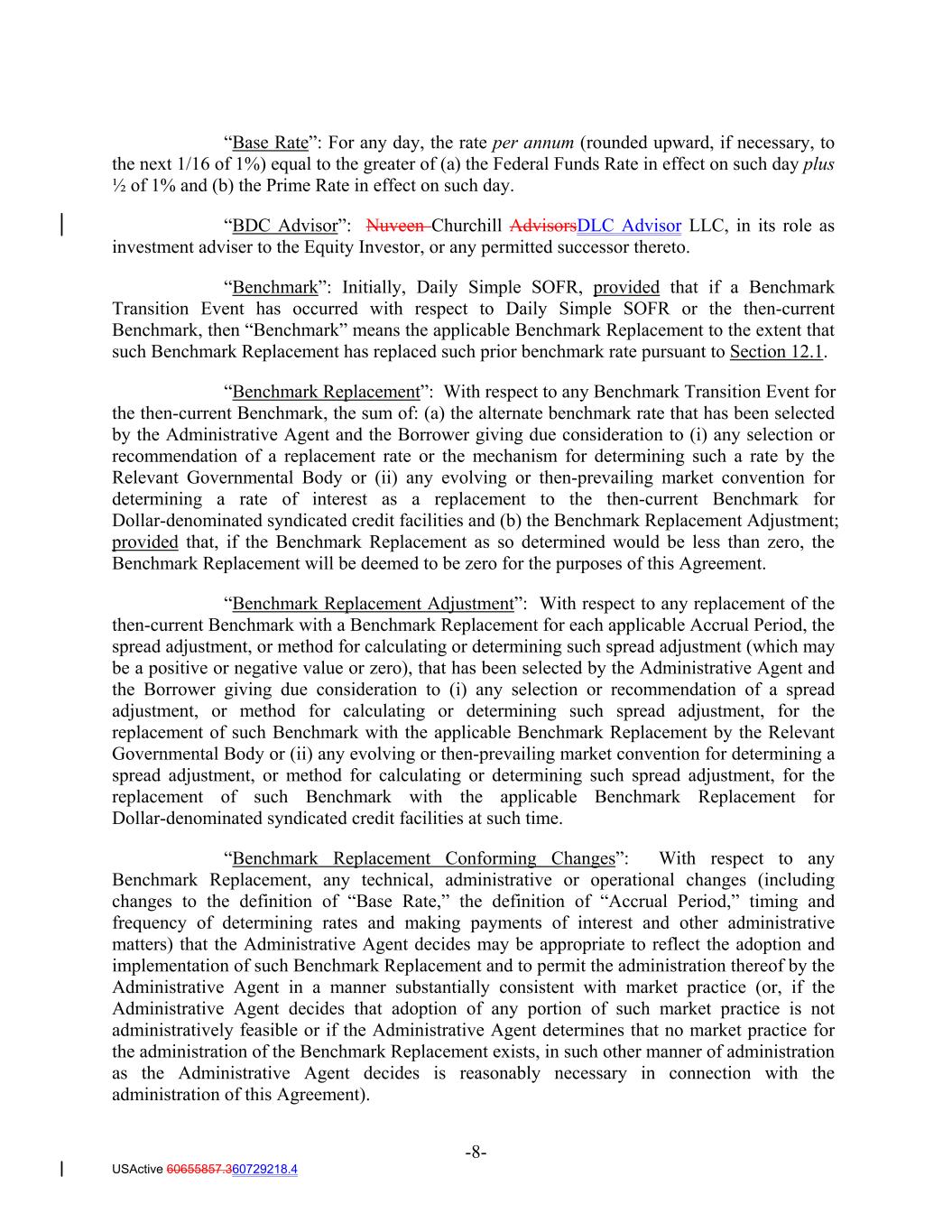 “Base Rate”: For any day, the rate per annum (rounded upward, if necessary, to the next 1/16 of 1%) equal to the greater of (a) the Federal Funds Rate in effect on such day plus ½ of 1% and (b) the Prime Rate in effect on such day. “BDC Advisor”: Nuveen Churchill AdvisorsDLC Advisor LLC, in its role as investment adviser to the Equity Investor, or any permitted successor thereto. “Benchmark”: Initially, Daily Simple SOFR, provided that if a Benchmark Transition Event has occurred with respect to Daily Simple SOFR or the then-current Benchmark, then “Benchmark” means the applicable Benchmark Replacement to the extent that such Benchmark Replacement has replaced such prior benchmark rate pursuant to Section 12.1. “Benchmark Replacement”: With respect to any Benchmark Transition Event for the then-current Benchmark, the sum of: (a) the alternate benchmark rate that has been selected by the Administrative Agent and the Borrower giving due consideration to (i) any selection or recommendation of a replacement rate or the mechanism for determining such a rate by the Relevant Governmental Body or (ii) any evolving or then-prevailing market convention for determining a rate of interest as a replacement to the then-current Benchmark for Dollar-denominated syndicated credit facilities and (b) the Benchmark Replacement Adjustment; provided that, if the Benchmark Replacement as so determined would be less than zero, the Benchmark Replacement will be deemed to be zero for the purposes of this Agreement. “Benchmark Replacement Adjustment”: With respect to any replacement of the then-current Benchmark with a Benchmark Replacement for each applicable Accrual Period, the spread adjustment, or method for calculating or determining such spread adjustment (which may be a positive or negative value or zero), that has been selected by the Administrative Agent and the Borrower giving due consideration to (i) any selection or recommendation of a spread adjustment, or method for calculating or determining such spread adjustment, for the replacement of such Benchmark with the applicable Benchmark Replacement by the Relevant Governmental Body or (ii) any evolving or then-prevailing market convention for determining a spread adjustment, or method for calculating or determining such spread adjustment, for the replacement of such Benchmark with the applicable Benchmark Replacement for Dollar-denominated syndicated credit facilities at such time. “Benchmark Replacement Conforming Changes”: With respect to any Benchmark Replacement, any technical, administrative or operational changes (including changes to the definition of “Base Rate,” the definition of “Accrual Period,” timing and frequency of determining rates and making payments of interest and other administrative matters) that the Administrative Agent decides may be appropriate to reflect the adoption and implementation of such Benchmark Replacement and to permit the administration thereof by the Administrative Agent in a manner substantially consistent with market practice (or, if the Administrative Agent decides that adoption of any portion of such market practice is not administratively feasible or if the Administrative Agent determines that no market practice for the administration of the Benchmark Replacement exists, in such other manner of administration as the Administrative Agent decides is reasonably necessary in connection with the administration of this Agreement). -8- USActive 60655857.360729218.4