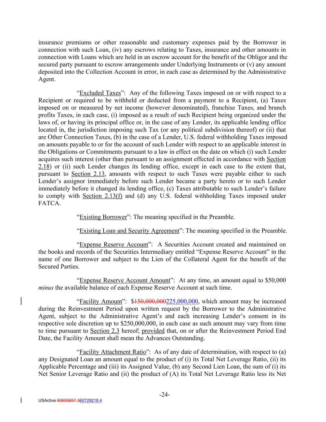 insurance premiums or other reasonable and customary expenses paid by the Borrower in connection with such Loan, (iv) any escrows relating to Taxes, insurance and other amounts in connection with Loans which are held in an escrow account for the benefit of the Obligor and the secured party pursuant to escrow arrangements under Underlying Instruments or (v) any amount deposited into the Collection Account in error, in each case as determined by the Administrative Agent. “Excluded Taxes”: Any of the following Taxes imposed on or with respect to a Recipient or required to be withheld or deducted from a payment to a Recipient, (a) Taxes imposed on or measured by net income (however denominated), franchise Taxes, and branch profits Taxes, in each case, (i) imposed as a result of such Recipient being organized under the laws of, or having its principal office or, in the case of any Lender, its applicable lending office located in, the jurisdiction imposing such Tax (or any political subdivision thereof) or (ii) that are Other Connection Taxes, (b) in the case of a Lender, U.S. federal withholding Taxes imposed on amounts payable to or for the account of such Lender with respect to an applicable interest in the Obligations or Commitments pursuant to a law in effect on the date on which (i) such Lender acquires such interest (other than pursuant to an assignment effected in accordance with Section 2.18) or (ii) such Lender changes its lending office, except in each case to the extent that, pursuant to Section 2.13, amounts with respect to such Taxes were payable either to such Lender’s assignor immediately before such Lender became a party hereto or to such Lender immediately before it changed its lending office, (c) Taxes attributable to such Lender’s failure to comply with Section 2.13(f) and (d) any U.S. federal withholding Taxes imposed under FATCA. “Existing Borrower”: The meaning specified in the Preamble. “Existing Loan and Security Agreement”: The meaning specified in the Preamble. “Expense Reserve Account”: A Securities Account created and maintained on the books and records of the Securities Intermediary entitled “Expense Reserve Account” in the name of one Borrower and subject to the Lien of the Collateral Agent for the benefit of the Secured Parties. “Expense Reserve Account Amount”: At any time, an amount equal to $50,000 minus the available balance of each Expense Reserve Account at such time. “Facility Amount”: $150,000,000225,000,000, which amount may be increased during the Reinvestment Period upon written request by the Borrower to the Administrative Agent, subject to the Administrative Agent’s and each increasing Lender’s consent in its respective sole discretion up to $250,000,000, in each case as such amount may vary from time to time pursuant to Section 2.3 hereof; provided that, on or after the Reinvestment Period End Date, the Facility Amount shall mean the Advances Outstanding. “Facility Attachment Ratio”: As of any date of determination, with respect to (a) any Designated Loan an amount equal to the product of (i) its Total Net Leverage Ratio, (ii) its Applicable Percentage and (iii) its Assigned Value, (b) any Second Lien Loan, the sum of (i) its Net Senior Leverage Ratio and (ii) the product of (A) its Total Net Leverage Ratio less its Net -24- USActive 60655857.360729218.4