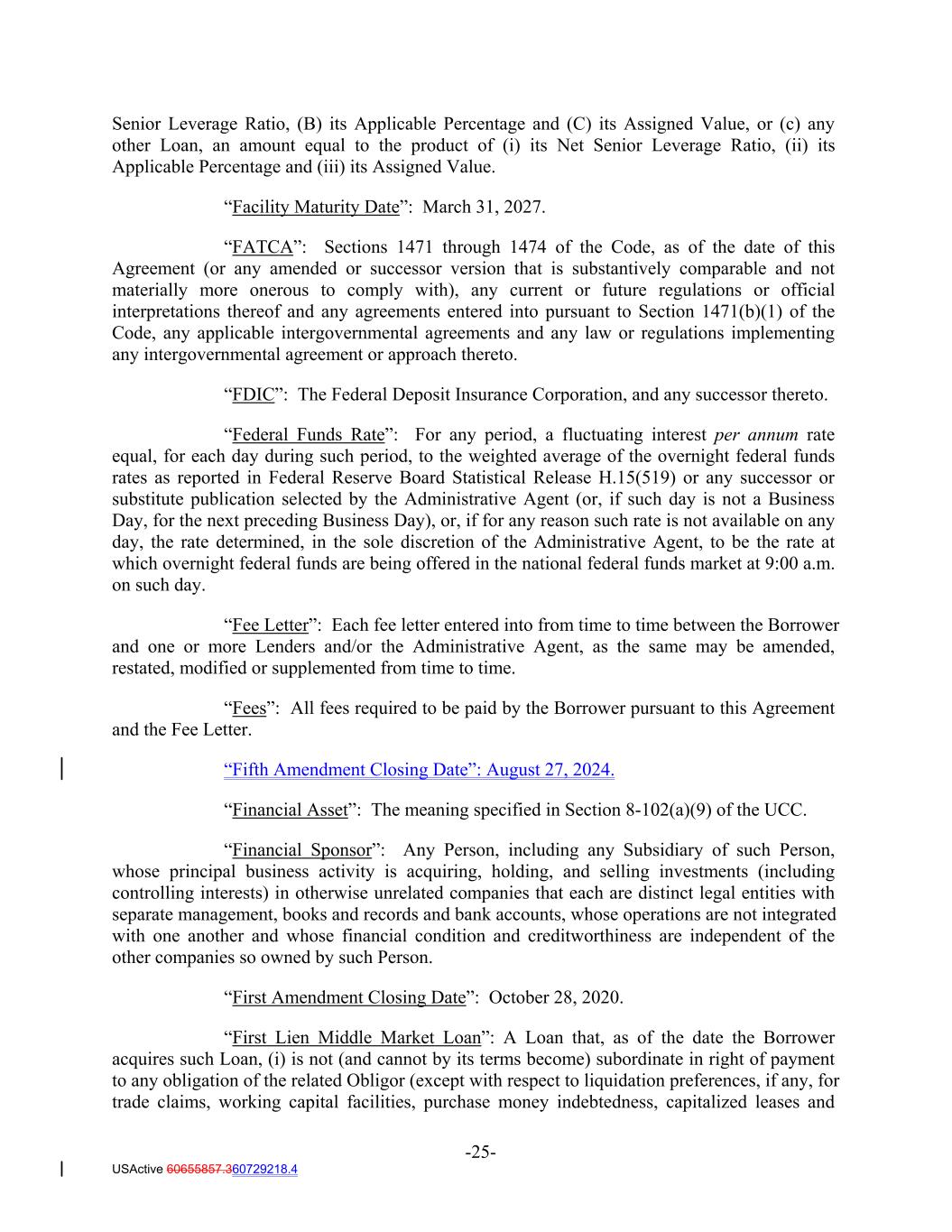 Senior Leverage Ratio, (B) its Applicable Percentage and (C) its Assigned Value, or (c) any other Loan, an amount equal to the product of (i) its Net Senior Leverage Ratio, (ii) its Applicable Percentage and (iii) its Assigned Value. “Facility Maturity Date”: March 31, 2027. “FATCA”: Sections 1471 through 1474 of the Code, as of the date of this Agreement (or any amended or successor version that is substantively comparable and not materially more onerous to comply with), any current or future regulations or official interpretations thereof and any agreements entered into pursuant to Section 1471(b)(1) of the Code, any applicable intergovernmental agreements and any law or regulations implementing any intergovernmental agreement or approach thereto. “FDIC”: The Federal Deposit Insurance Corporation, and any successor thereto. “Federal Funds Rate”: For any period, a fluctuating interest per annum rate equal, for each day during such period, to the weighted average of the overnight federal funds rates as reported in Federal Reserve Board Statistical Release H.15(519) or any successor or substitute publication selected by the Administrative Agent (or, if such day is not a Business Day, for the next preceding Business Day), or, if for any reason such rate is not available on any day, the rate determined, in the sole discretion of the Administrative Agent, to be the rate at which overnight federal funds are being offered in the national federal funds market at 9:00 a.m. on such day. “Fee Letter”: Each fee letter entered into from time to time between the Borrower and one or more Lenders and/or the Administrative Agent, as the same may be amended, restated, modified or supplemented from time to time. “Fees”: All fees required to be paid by the Borrower pursuant to this Agreement and the Fee Letter. “Fifth Amendment Closing Date”: August 27, 2024. “Financial Asset”: The meaning specified in Section 8-102(a)(9) of the UCC. “Financial Sponsor”: Any Person, including any Subsidiary of such Person, whose principal business activity is acquiring, holding, and selling investments (including controlling interests) in otherwise unrelated companies that each are distinct legal entities with separate management, books and records and bank accounts, whose operations are not integrated with one another and whose financial condition and creditworthiness are independent of the other companies so owned by such Person. “First Amendment Closing Date”: October 28, 2020. “First Lien Middle Market Loan”: A Loan that, as of the date the Borrower acquires such Loan, (i) is not (and cannot by its terms become) subordinate in right of payment to any obligation of the related Obligor (except with respect to liquidation preferences, if any, for trade claims, working capital facilities, purchase money indebtedness, capitalized leases and -25- USActive 60655857.360729218.4