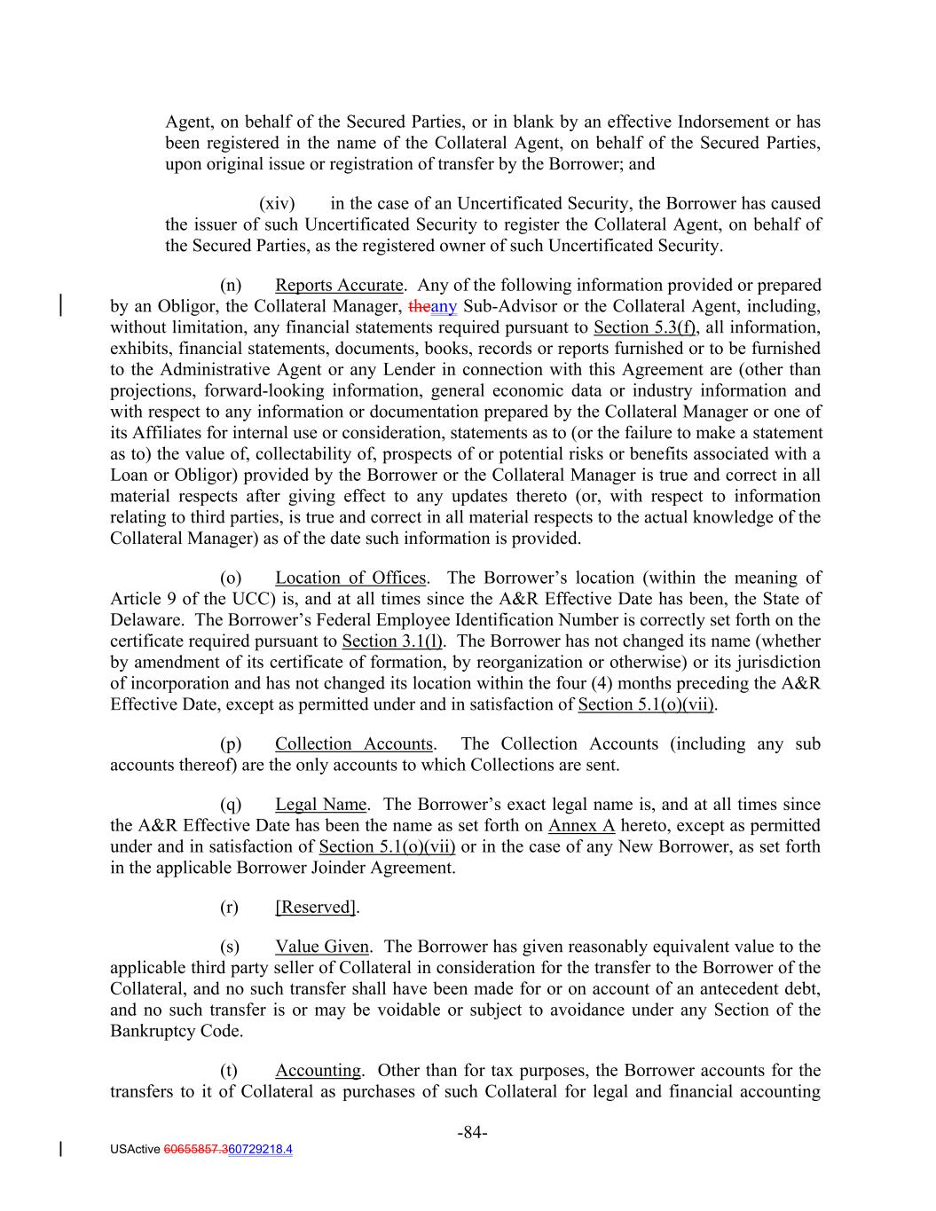Agent, on behalf of the Secured Parties, or in blank by an effective Indorsement or has been registered in the name of the Collateral Agent, on behalf of the Secured Parties, upon original issue or registration of transfer by the Borrower; and (xiv) in the case of an Uncertificated Security, the Borrower has caused the issuer of such Uncertificated Security to register the Collateral Agent, on behalf of the Secured Parties, as the registered owner of such Uncertificated Security. (n) Reports Accurate. Any of the following information provided or prepared by an Obligor, the Collateral Manager, theany Sub-Advisor or the Collateral Agent, including, without limitation, any financial statements required pursuant to Section 5.3(f), all information, exhibits, financial statements, documents, books, records or reports furnished or to be furnished to the Administrative Agent or any Lender in connection with this Agreement are (other than projections, forward-looking information, general economic data or industry information and with respect to any information or documentation prepared by the Collateral Manager or one of its Affiliates for internal use or consideration, statements as to (or the failure to make a statement as to) the value of, collectability of, prospects of or potential risks or benefits associated with a Loan or Obligor) provided by the Borrower or the Collateral Manager is true and correct in all material respects after giving effect to any updates thereto (or, with respect to information relating to third parties, is true and correct in all material respects to the actual knowledge of the Collateral Manager) as of the date such information is provided. (o) Location of Offices. The Borrower’s location (within the meaning of Article 9 of the UCC) is, and at all times since the A&R Effective Date has been, the State of Delaware. The Borrower’s Federal Employee Identification Number is correctly set forth on the certificate required pursuant to Section 3.1(l). The Borrower has not changed its name (whether by amendment of its certificate of formation, by reorganization or otherwise) or its jurisdiction of incorporation and has not changed its location within the four (4) months preceding the A&R Effective Date, except as permitted under and in satisfaction of Section 5.1(o)(vii). (p) Collection Accounts. The Collection Accounts (including any sub accounts thereof) are the only accounts to which Collections are sent. (q) Legal Name. The Borrower’s exact legal name is, and at all times since the A&R Effective Date has been the name as set forth on Annex A hereto, except as permitted under and in satisfaction of Section 5.1(o)(vii) or in the case of any New Borrower, as set forth in the applicable Borrower Joinder Agreement. (r) [Reserved]. (s) Value Given. The Borrower has given reasonably equivalent value to the applicable third party seller of Collateral in consideration for the transfer to the Borrower of the Collateral, and no such transfer shall have been made for or on account of an antecedent debt, and no such transfer is or may be voidable or subject to avoidance under any Section of the Bankruptcy Code. (t) Accounting. Other than for tax purposes, the Borrower accounts for the transfers to it of Collateral as purchases of such Collateral for legal and financial accounting -84- USActive 60655857.360729218.4