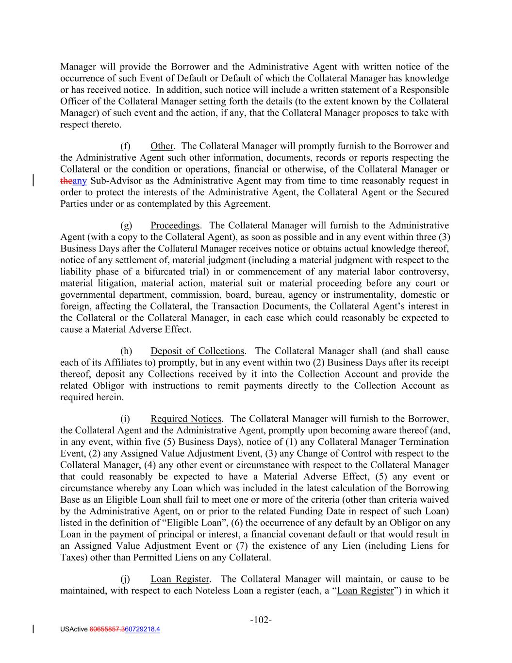 Manager will provide the Borrower and the Administrative Agent with written notice of the occurrence of such Event of Default or Default of which the Collateral Manager has knowledge or has received notice. In addition, such notice will include a written statement of a Responsible Officer of the Collateral Manager setting forth the details (to the extent known by the Collateral Manager) of such event and the action, if any, that the Collateral Manager proposes to take with respect thereto. (f) Other. The Collateral Manager will promptly furnish to the Borrower and the Administrative Agent such other information, documents, records or reports respecting the Collateral or the condition or operations, financial or otherwise, of the Collateral Manager or theany Sub-Advisor as the Administrative Agent may from time to time reasonably request in order to protect the interests of the Administrative Agent, the Collateral Agent or the Secured Parties under or as contemplated by this Agreement. (g) Proceedings. The Collateral Manager will furnish to the Administrative Agent (with a copy to the Collateral Agent), as soon as possible and in any event within three (3) Business Days after the Collateral Manager receives notice or obtains actual knowledge thereof, notice of any settlement of, material judgment (including a material judgment with respect to the liability phase of a bifurcated trial) in or commencement of any material labor controversy, material litigation, material action, material suit or material proceeding before any court or governmental department, commission, board, bureau, agency or instrumentality, domestic or foreign, affecting the Collateral, the Transaction Documents, the Collateral Agent’s interest in the Collateral or the Collateral Manager, in each case which could reasonably be expected to cause a Material Adverse Effect. (h) Deposit of Collections. The Collateral Manager shall (and shall cause each of its Affiliates to) promptly, but in any event within two (2) Business Days after its receipt thereof, deposit any Collections received by it into the Collection Account and provide the related Obligor with instructions to remit payments directly to the Collection Account as required herein. (i) Required Notices. The Collateral Manager will furnish to the Borrower, the Collateral Agent and the Administrative Agent, promptly upon becoming aware thereof (and, in any event, within five (5) Business Days), notice of (1) any Collateral Manager Termination Event, (2) any Assigned Value Adjustment Event, (3) any Change of Control with respect to the Collateral Manager, (4) any other event or circumstance with respect to the Collateral Manager that could reasonably be expected to have a Material Adverse Effect, (5) any event or circumstance whereby any Loan which was included in the latest calculation of the Borrowing Base as an Eligible Loan shall fail to meet one or more of the criteria (other than criteria waived by the Administrative Agent, on or prior to the related Funding Date in respect of such Loan) listed in the definition of “Eligible Loan”, (6) the occurrence of any default by an Obligor on any Loan in the payment of principal or interest, a financial covenant default or that would result in an Assigned Value Adjustment Event or (7) the existence of any Lien (including Liens for Taxes) other than Permitted Liens on any Collateral. (j) Loan Register. The Collateral Manager will maintain, or cause to be maintained, with respect to each Noteless Loan a register (each, a “Loan Register”) in which it -102- USActive 60655857.360729218.4