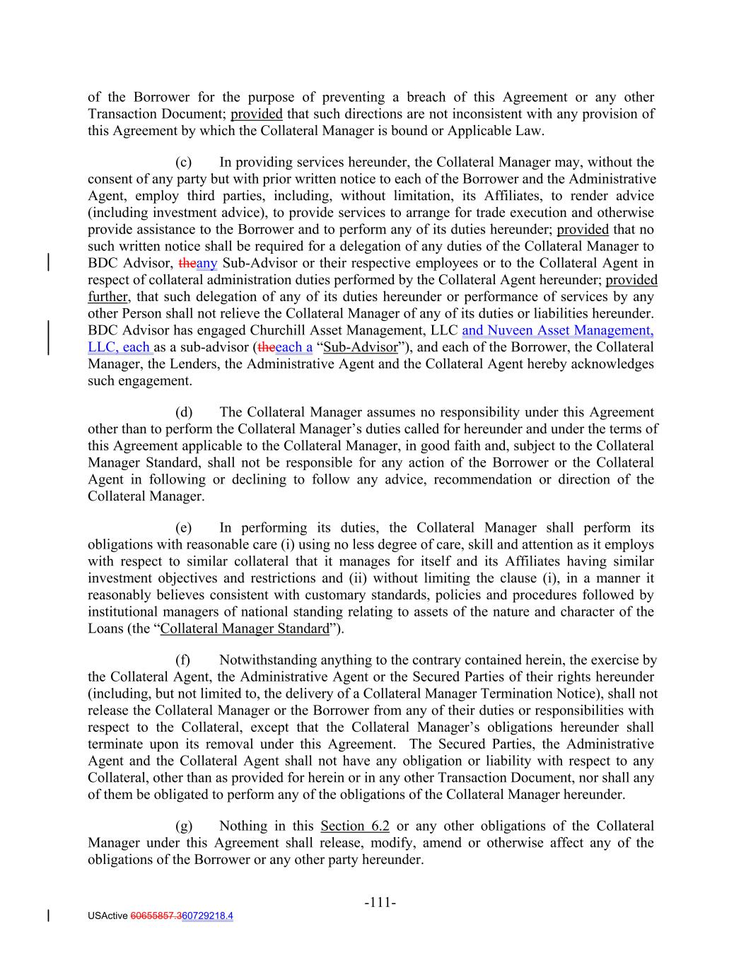 of the Borrower for the purpose of preventing a breach of this Agreement or any other Transaction Document; provided that such directions are not inconsistent with any provision of this Agreement by which the Collateral Manager is bound or Applicable Law. (c) In providing services hereunder, the Collateral Manager may, without the consent of any party but with prior written notice to each of the Borrower and the Administrative Agent, employ third parties, including, without limitation, its Affiliates, to render advice (including investment advice), to provide services to arrange for trade execution and otherwise provide assistance to the Borrower and to perform any of its duties hereunder; provided that no such written notice shall be required for a delegation of any duties of the Collateral Manager to BDC Advisor, theany Sub-Advisor or their respective employees or to the Collateral Agent in respect of collateral administration duties performed by the Collateral Agent hereunder; provided further, that such delegation of any of its duties hereunder or performance of services by any other Person shall not relieve the Collateral Manager of any of its duties or liabilities hereunder. BDC Advisor has engaged Churchill Asset Management, LLC and Nuveen Asset Management, LLC, each as a sub-advisor (theeach a “Sub-Advisor”), and each of the Borrower, the Collateral Manager, the Lenders, the Administrative Agent and the Collateral Agent hereby acknowledges such engagement. (d) The Collateral Manager assumes no responsibility under this Agreement other than to perform the Collateral Manager’s duties called for hereunder and under the terms of this Agreement applicable to the Collateral Manager, in good faith and, subject to the Collateral Manager Standard, shall not be responsible for any action of the Borrower or the Collateral Agent in following or declining to follow any advice, recommendation or direction of the Collateral Manager. (e) In performing its duties, the Collateral Manager shall perform its obligations with reasonable care (i) using no less degree of care, skill and attention as it employs with respect to similar collateral that it manages for itself and its Affiliates having similar investment objectives and restrictions and (ii) without limiting the clause (i), in a manner it reasonably believes consistent with customary standards, policies and procedures followed by institutional managers of national standing relating to assets of the nature and character of the Loans (the “Collateral Manager Standard”). (f) Notwithstanding anything to the contrary contained herein, the exercise by the Collateral Agent, the Administrative Agent or the Secured Parties of their rights hereunder (including, but not limited to, the delivery of a Collateral Manager Termination Notice), shall not release the Collateral Manager or the Borrower from any of their duties or responsibilities with respect to the Collateral, except that the Collateral Manager’s obligations hereunder shall terminate upon its removal under this Agreement. The Secured Parties, the Administrative Agent and the Collateral Agent shall not have any obligation or liability with respect to any Collateral, other than as provided for herein or in any other Transaction Document, nor shall any of them be obligated to perform any of the obligations of the Collateral Manager hereunder. (g) Nothing in this Section 6.2 or any other obligations of the Collateral Manager under this Agreement shall release, modify, amend or otherwise affect any of the obligations of the Borrower or any other party hereunder. -111- USActive 60655857.360729218.4
