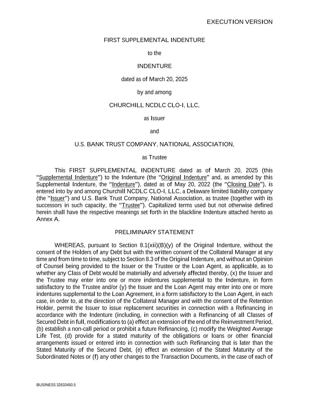EXECUTION VERSION FIRST SUPPLEMENTAL INDENTURE to the INDENTURE dated as of March 20, 2025 by and among CHURCHILL NCDLC CLO-I, LLC, as Issuer and U.S. BANK TRUST COMPANY, NATIONAL ASSOCIATION, as Trustee This FIRST SUPPLEMENTAL INDENTURE dated as of March 20, 2025 (this “Supplemental Indenture”) to the Indenture (the “Original Indenture” and, as amended by this Supplemental Indenture, the “Indenture”), dated as of May 20, 2022 (the “Closing Date”), is entered into by and among Churchill NCDLC CLO-I, LLC, a Delaware limited liability company (the “Issuer”) and U.S. Bank Trust Company, National Association, as trustee (together with its successors in such capacity, the “Trustee”). Capitalized terms used but not otherwise defined herein shall have the respective meanings set forth in the blackline Indenture attached hereto as Annex A. PRELIMINARY STATEMENT WHEREAS, pursuant to Section 8.1(xii)(B)(y) of the Original Indenture, without the consent of the Holders of any Debt but with the written consent of the Collateral Manager at any time and from time to time, subject to Section 8.3 of the Original Indenture, and without an Opinion of Counsel being provided to the Issuer or the Trustee or the Loan Agent, as applicable, as to whether any Class of Debt would be materially and adversely affected thereby, (x) the Issuer and the Trustee may enter into one or more indentures supplemental to the Indenture, in form satisfactory to the Trustee and/or (y) the Issuer and the Loan Agent may enter into one or more indentures supplemental to the Loan Agreement, in a form satisfactory to the Loan Agent, in each case, in order to, at the direction of the Collateral Manager and with the consent of the Retention Holder, permit the Issuer to issue replacement securities in connection with a Refinancing in accordance with the Indenture (including, in connection with a Refinancing of all Classes of Secured Debt in full, modifications to (a) effect an extension of the end of the Reinvestment Period, (b) establish a non-call period or prohibit a future Refinancing, (c) modify the Weighted Average Life Test, (d) provide for a stated maturity of the obligations or loans or other financial arrangements issued or entered into in connection with such Refinancing that is later than the Stated Maturity of the Secured Debt, (e) effect an extension of the Stated Maturity of the Subordinated Notes or (f) any other changes to the Transaction Documents, in the case of each of BUSINESS.32633450.5
