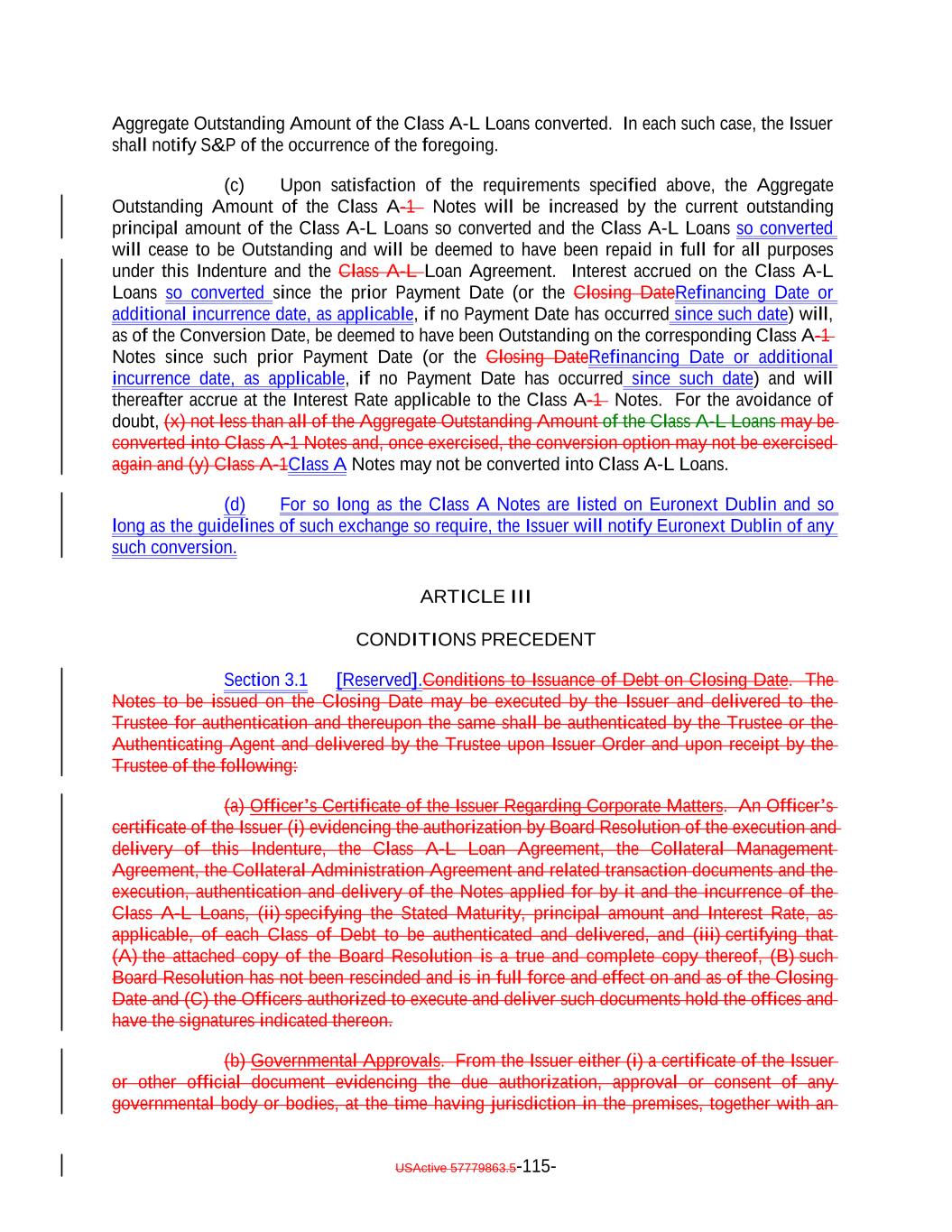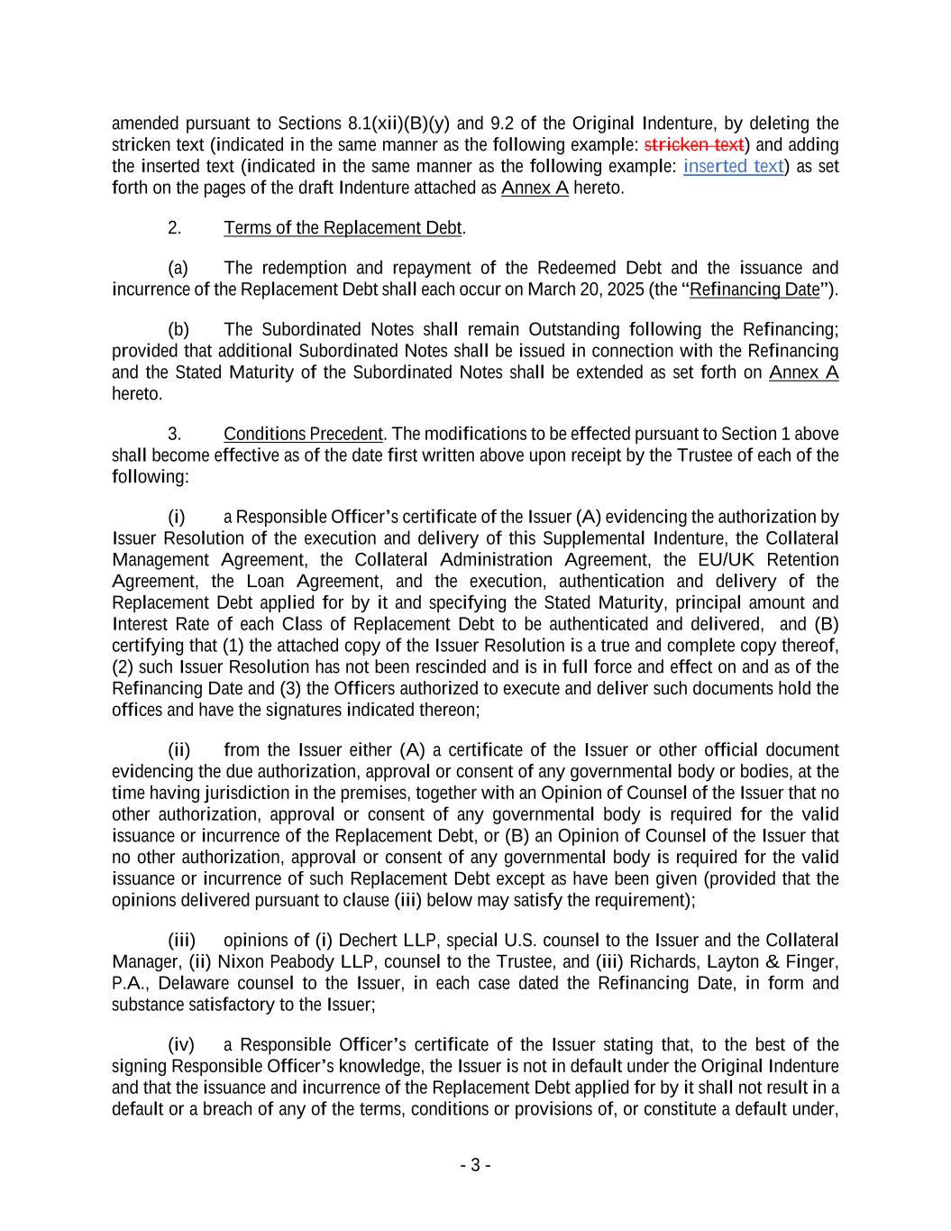 - 3 - amended pursuant to Sections 8.1(xii)(B)(y) and 9.2 of the Original Indenture, by deleting the stricken text (indicated in the same manner as the following example: stricken text) and adding the inserted text (indicated in the same manner as the following example: inserted text) as set forth on the pages of the draft Indenture attached as Annex A hereto. 2. Terms of the Replacement Debt. (a) The redemption and repayment of the Redeemed Debt and the issuance and incurrence of the Replacement Debt shall each occur on March 20, 2025 (the “Refinancing Date”). (b) The Subordinated Notes shall remain Outstanding following the Refinancing; provided that additional Subordinated Notes shall be issued in connection with the Refinancing and the Stated Maturity of the Subordinated Notes shall be extended as set forth on Annex A hereto. 3. Conditions Precedent. The modifications to be effected pursuant to Section 1 above shall become effective as of the date first written above upon receipt by the Trustee of each of the following: (i) a Responsible Officer’s certificate of the Issuer (A) evidencing the authorization by Issuer Resolution of the execution and delivery of this Supplemental Indenture, the Collateral Management Agreement, the Collateral Administration Agreement, the EU/UK Retention Agreement, the Loan Agreement, and the execution, authentication and delivery of the Replacement Debt applied for by it and specifying the Stated Maturity, principal amount and Interest Rate of each Class of Replacement Debt to be authenticated and delivered, and (B) certifying that (1) the attached copy of the Issuer Resolution is a true and complete copy thereof, (2) such Issuer Resolution has not been rescinded and is in full force and effect on and as of the Refinancing Date and (3) the Officers authorized to execute and deliver such documents hold the offices and have the signatures indicated thereon; (ii) from the Issuer either (A) a certificate of the Issuer or other official document evidencing the due authorization, approval or consent of any governmental body or bodies, at the time having jurisdiction in the premises, together with an Opinion of Counsel of the Issuer that no other authorization, approval or consent of any governmental body is required for the valid issuance or incurrence of the Replacement Debt, or (B) an Opinion of Counsel of the Issuer that no other authorization, approval or consent of any governmental body is required for the valid issuance or incurrence of such Replacement Debt except as have been given (provided that the opinions delivered pursuant to clause (iii) below may satisfy the requirement); (iii) opinions of (i) Dechert LLP, special U.S. counsel to the Issuer and the Collateral Manager, (ii) Nixon Peabody LLP, counsel to the Trustee, and (iii) Richards, Layton & Finger, P.A., Delaware counsel to the Issuer, in each case dated the Refinancing Date, in form and substance satisfactory to the Issuer; (iv) a Responsible Officer’s certificate of the Issuer stating that, to the best of the signing Responsible Officer’s knowledge, the Issuer is not in default under the Original Indenture and that the issuance and incurrence of the Replacement Debt applied for by it shall not result in a default or a breach of any of the terms, conditions or provisions of, or constitute a default under,