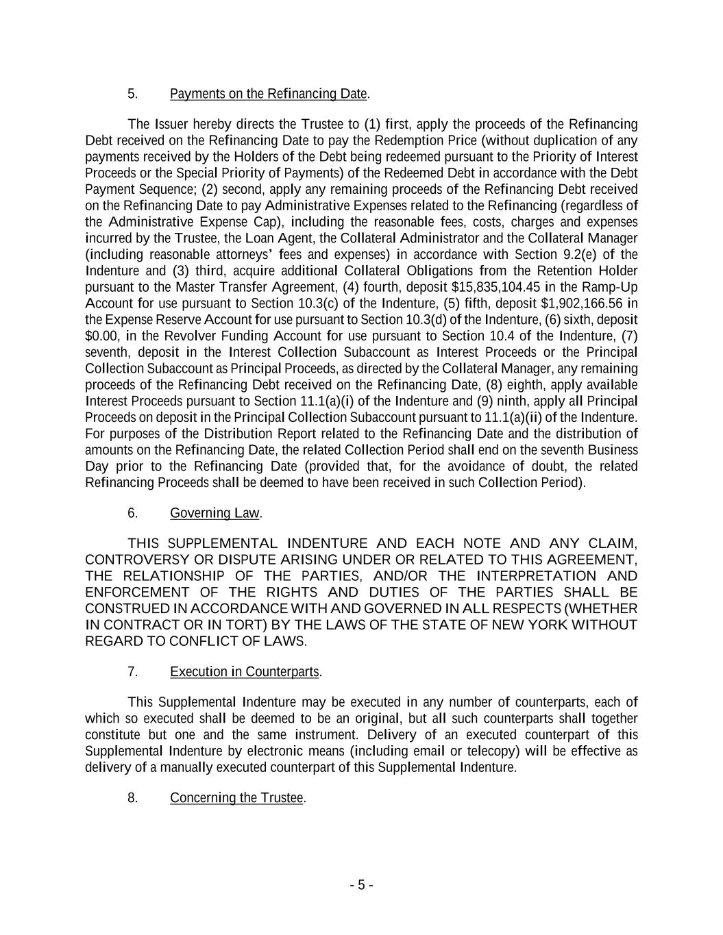 - 5 - 5. Payments on the Refinancing Date. The Issuer hereby directs the Trustee to (1) first, apply the proceeds of the Refinancing Debt received on the Refinancing Date to pay the Redemption Price (without duplication of any payments received by the Holders of the Debt being redeemed pursuant to the Priority of Interest Proceeds or the Special Priority of Payments) of the Redeemed Debt in accordance with the Debt Payment Sequence; (2) second, apply any remaining proceeds of the Refinancing Debt received on the Refinancing Date to pay Administrative Expenses related to the Refinancing (regardless of the Administrative Expense Cap), including the reasonable fees, costs, charges and expenses incurred by the Trustee, the Loan Agent, the Collateral Administrator and the Collateral Manager (including reasonable attorneys’ fees and expenses) in accordance with Section 9.2(e) of the Indenture and (3) third, acquire additional Collateral Obligations from the Retention Holder pursuant to the Master Transfer Agreement, (4) fourth, deposit $15,835,104.45 in the Ramp-Up Account for use pursuant to Section 10.3(c) of the Indenture, (5) fifth, deposit $1,902,166.56 in the Expense Reserve Account for use pursuant to Section 10.3(d) of the Indenture, (6) sixth, deposit $0.00, in the Revolver Funding Account for use pursuant to Section 10.4 of the Indenture, (7) seventh, deposit in the Interest Collection Subaccount as Interest Proceeds or the Principal Collection Subaccount as Principal Proceeds, as directed by the Collateral Manager, any remaining proceeds of the Refinancing Debt received on the Refinancing Date, (8) eighth, apply available Interest Proceeds pursuant to Section 11.1(a)(i) of the Indenture and (9) ninth, apply all Principal Proceeds on deposit in the Principal Collection Subaccount pursuant to 11.1(a)(ii) of the Indenture. For purposes of the Distribution Report related to the Refinancing Date and the distribution of amounts on the Refinancing Date, the related Collection Period shall end on the seventh Business Day prior to the Refinancing Date (provided that, for the avoidance of doubt, the related Refinancing Proceeds shall be deemed to have been received in such Collection Period). 6. Governing Law. THIS SUPPLEMENTAL INDENTURE AND EACH NOTE AND ANY CLAIM, CONTROVERSY OR DISPUTE ARISING UNDER OR RELATED TO THIS AGREEMENT, THE RELATIONSHIP OF THE PARTIES, AND/OR THE INTERPRETATION AND ENFORCEMENT OF THE RIGHTS AND DUTIES OF THE PARTIES SHALL BE CONSTRUED IN ACCORDANCE WITH AND GOVERNED IN ALL RESPECTS (WHETHER IN CONTRACT OR IN TORT) BY THE LAWS OF THE STATE OF NEW YORK WITHOUT REGARD TO CONFLICT OF LAWS. 7. Execution in Counterparts. This Supplemental Indenture may be executed in any number of counterparts, each of which so executed shall be deemed to be an original, but all such counterparts shall together constitute but one and the same instrument. Delivery of an executed counterpart of this Supplemental Indenture by electronic means (including email or telecopy) will be effective as delivery of a manually executed counterpart of this Supplemental Indenture. 8. Concerning the Trustee.