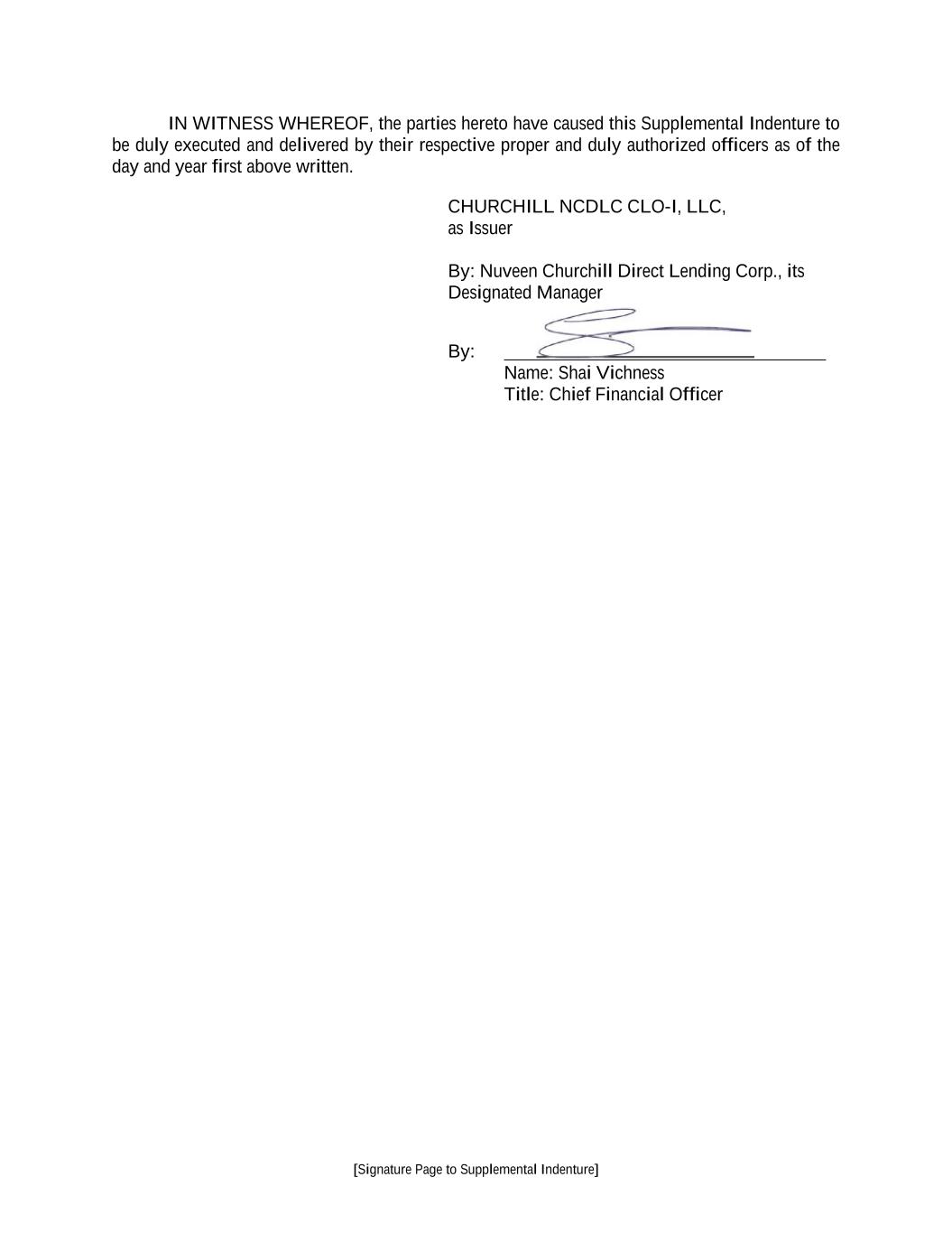[Signature Page to Supplemental Indenture] IN WITNESS WHEREOF, the parties hereto have caused this Supplemental Indenture to be duly executed and delivered by their respective proper and duly authorized officers as of the day and year first above written. CHURCHILL NCDLC CLO-I, LLC, as Issuer By: Nuveen Churchill Direct Lending Corp., its Designated Manager By: Name: Shai Vichness Title: Chief Financial Officer