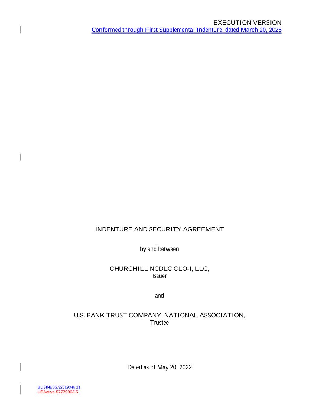 EXECUTION VERSION Conformed through First Supplemental Indenture, dated March 20, 2025 USActive 57779863.5 INDENTURE AND SECURITY AGREEMENT by and between CHURCHILL NCDLC CLO-I, LLC, Issuer and U.S. BANK TRUST COMPANY, NATIONAL ASSOCIATION, Trustee Dated as of May 20, 2022 BUSINESS.32619346.11