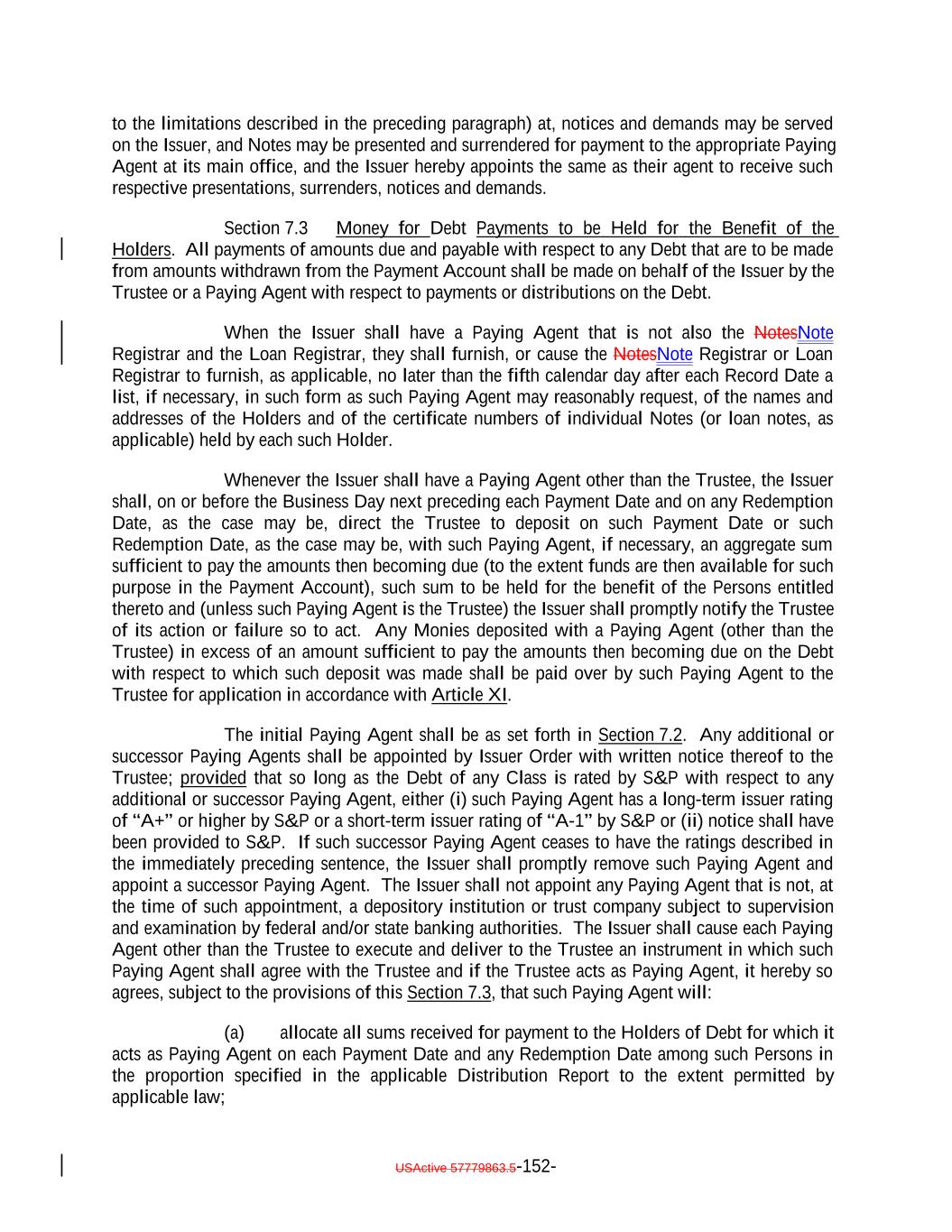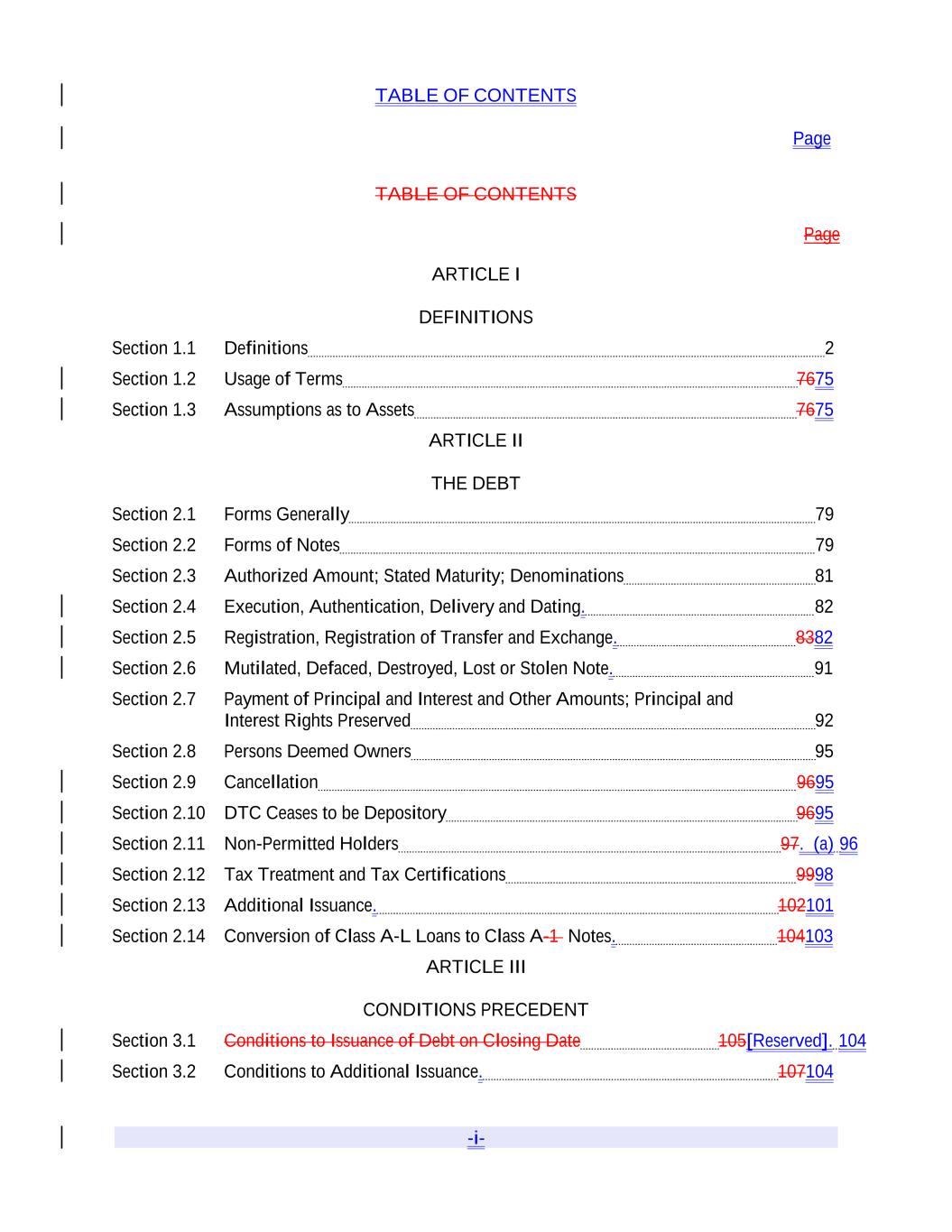 TABLE OF CONTENTS Page -i- TABLE OF CONTENTS Page ARTICLE I DEFINITIONS Section 1.1 Definitions 2 Section 1.2 Usage of Terms 7675 Section 1.3 Assumptions as to Assets 7675 ARTICLE II THE DEBT Section 2.1 Forms Generally 79 Section 2.2 Forms of Notes 79 Section 2.3 Authorized Amount; Stated Maturity; Denominations 81 Section 2.4 Execution, Authentication, Delivery and Dating. 82 Section 2.5 Registration, Registration of Transfer and Exchange. 8382 Section 2.6 Mutilated, Defaced, Destroyed, Lost or Stolen Note. 91 Section 2.7 Payment of Principal and Interest and Other Amounts; Principal and Interest Rights Preserved 92 Section 2.8 Persons Deemed Owners 95 Section 2.9 Cancellation 9695 Section 2.10 DTC Ceases to be Depository 9695 Section 2.11 Non-Permitted Holders 97. (a) 96 Section 2.12 Tax Treatment and Tax Certifications 9998 Section 2.13 Additional Issuance. 102101 Section 2.14 Conversion of Class A-L Loans to Class A-1 Notes. 104103 ARTICLE III CONDITIONS PRECEDENT Section 3.1 Conditions to Issuance of Debt on Closing Date 105[Reserved]. 104 Section 3.2 Conditions to Additional Issuance. 107104