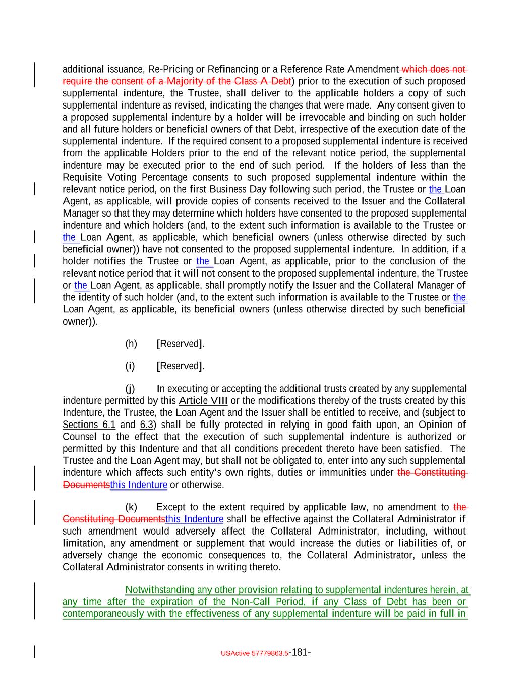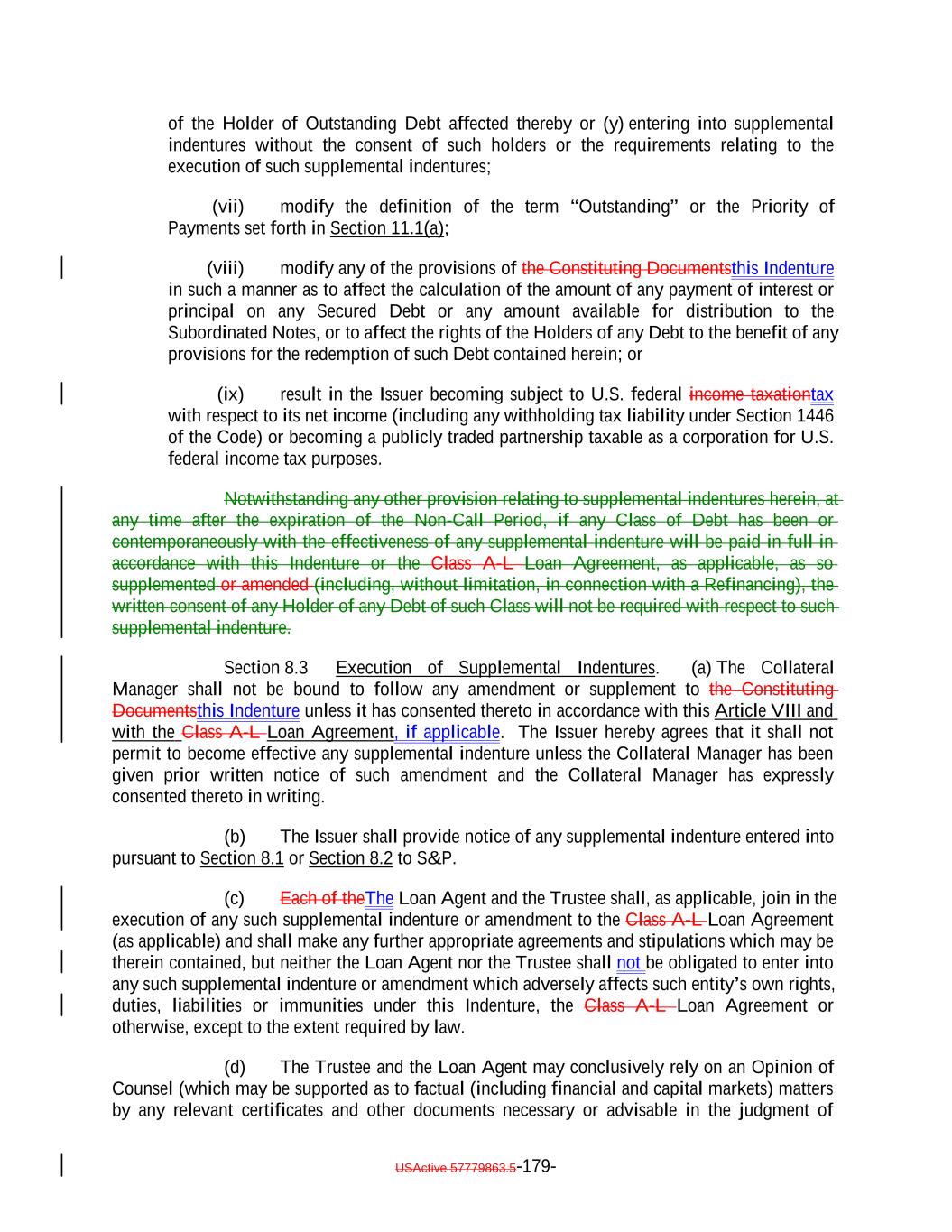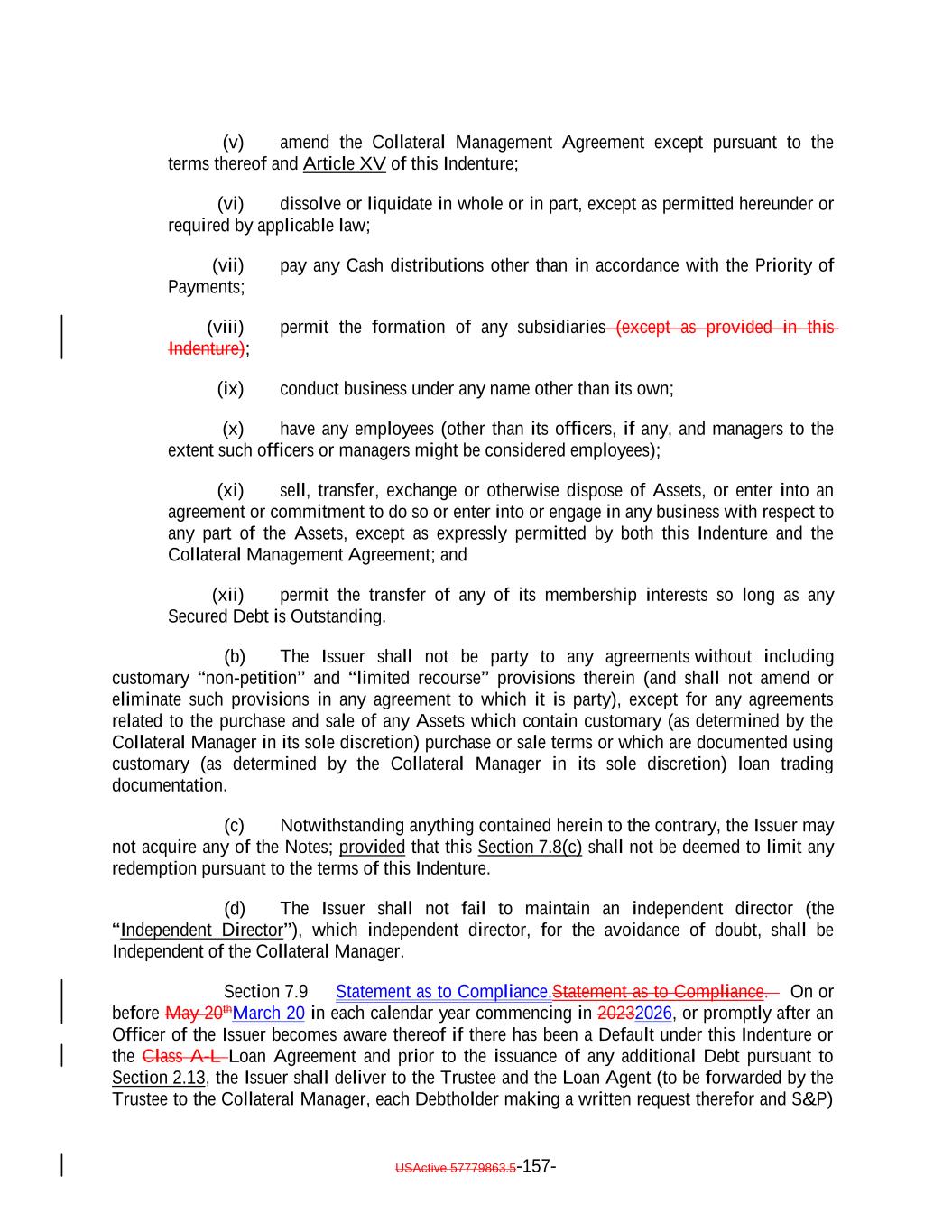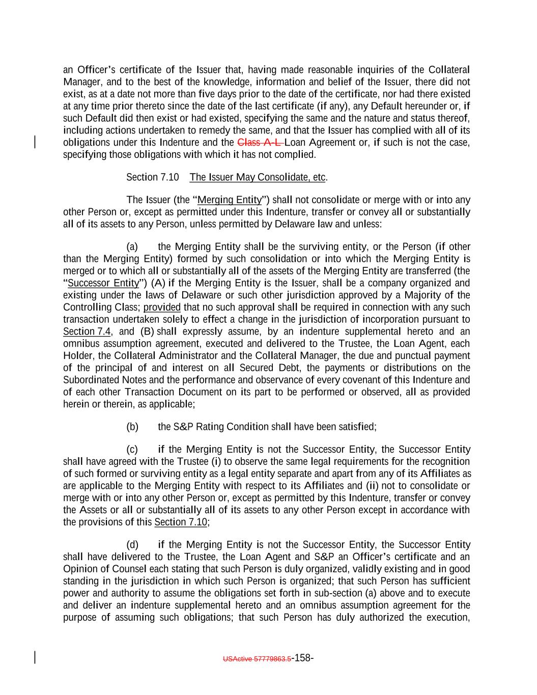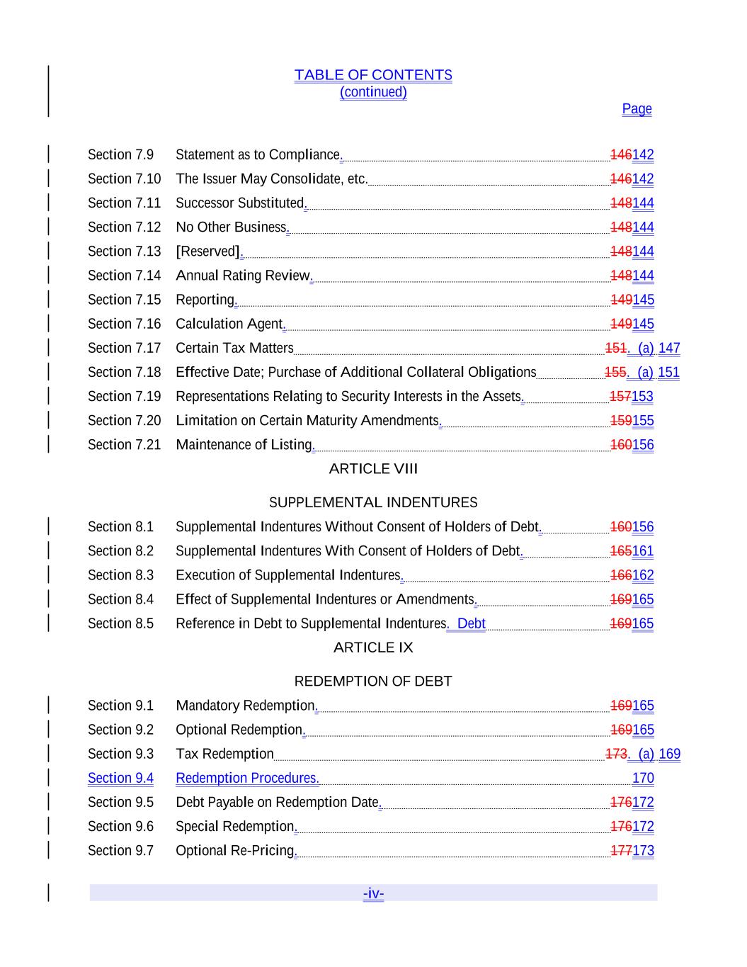 TABLE OF CONTENTS (continued) Page -iv- Section 7.9 Statement as to Compliance. 146142 Section 7.10 The Issuer May Consolidate, etc. 146142 Section 7.11 Successor Substituted. 148144 Section 7.12 No Other Business. 148144 Section 7.13 [Reserved]. 148144 Section 7.14 Annual Rating Review. 148144 Section 7.15 Reporting. 149145 Section 7.16 Calculation Agent. 149145 Section 7.17 Certain Tax Matters 151. (a) 147 Section 7.18 Effective Date; Purchase of Additional Collateral Obligations 155. (a) 151 Section 7.19 Representations Relating to Security Interests in the Assets. 157153 Section 7.20 Limitation on Certain Maturity Amendments. 159155 Section 7.21 Maintenance of Listing. 160156 ARTICLE VIII SUPPLEMENTAL INDENTURES Section 8.1 Supplemental Indentures Without Consent of Holders of Debt. 160156 Section 8.2 Supplemental Indentures With Consent of Holders of Debt. 165161 Section 8.3 Execution of Supplemental Indentures. 166162 Section 8.4 Effect of Supplemental Indentures or Amendments. 169165 Section 8.5 Reference in Debt to Supplemental Indentures. Debt 169165 ARTICLE IX REDEMPTION OF DEBT Section 9.1 Mandatory Redemption. 169165 Section 9.2 Optional Redemption. 169165 Section 9.3 Tax Redemption 173. (a) 169 Section 9.4 Redemption Procedures. 170 Section 9.5 Debt Payable on Redemption Date. 176172 Section 9.6 Special Redemption. 176172 Section 9.7 Optional Re-Pricing. 177173