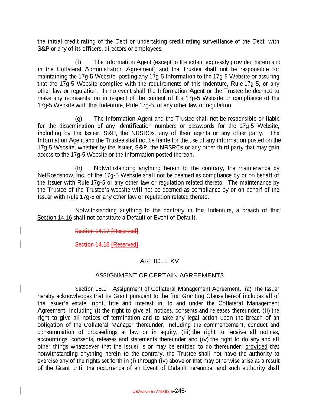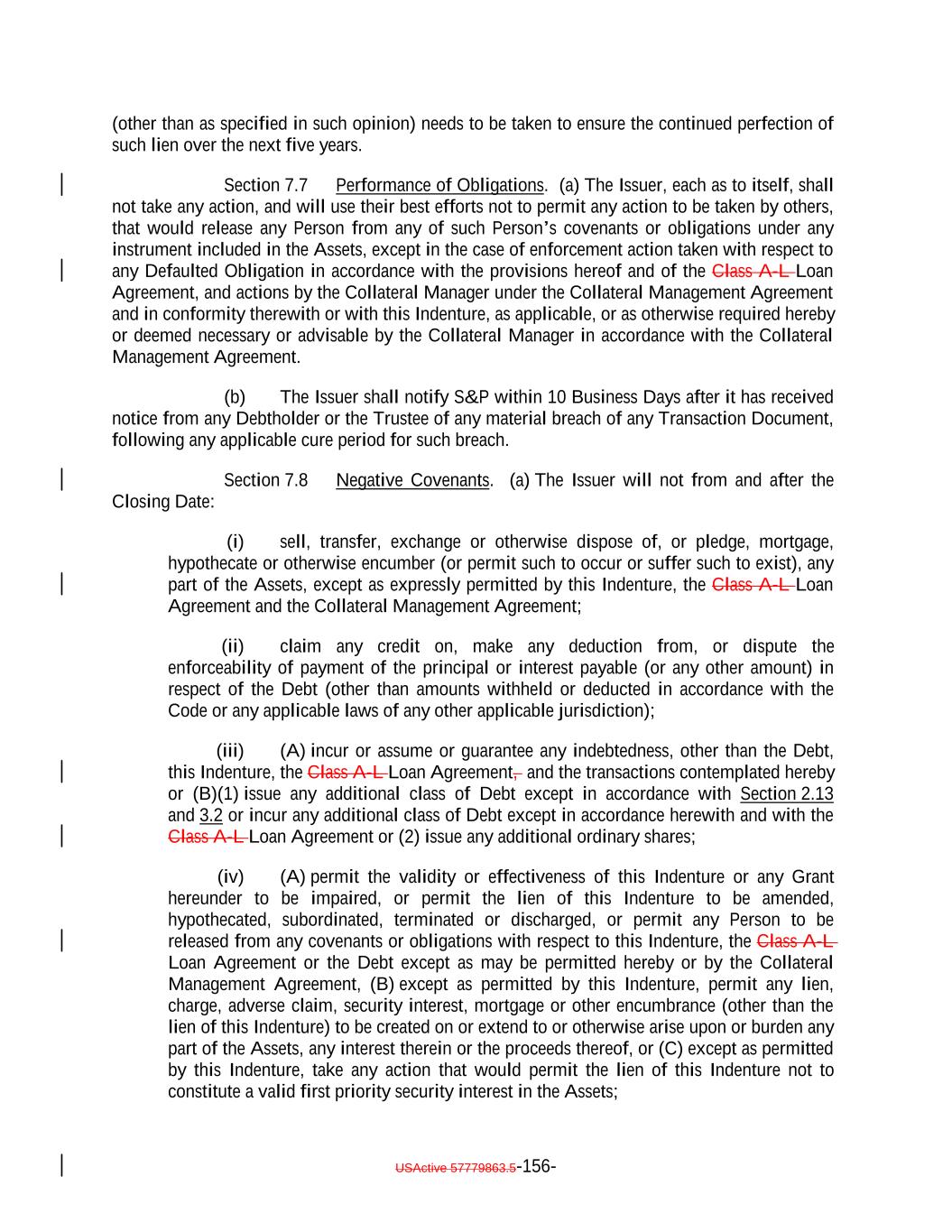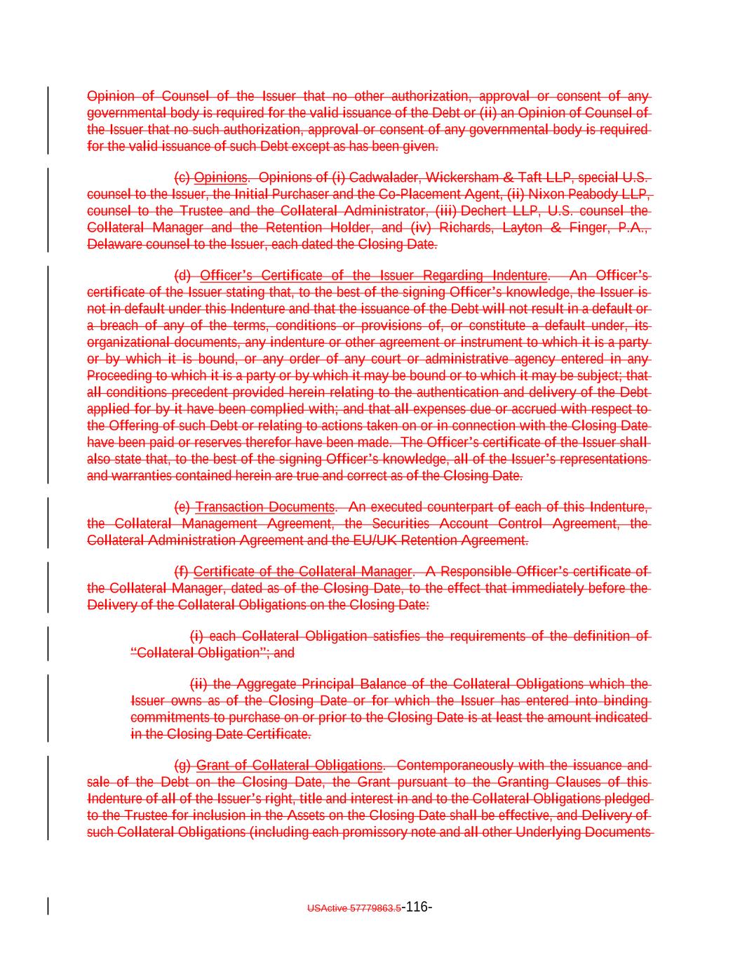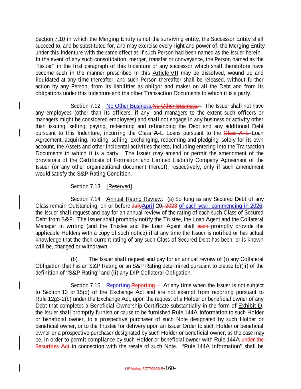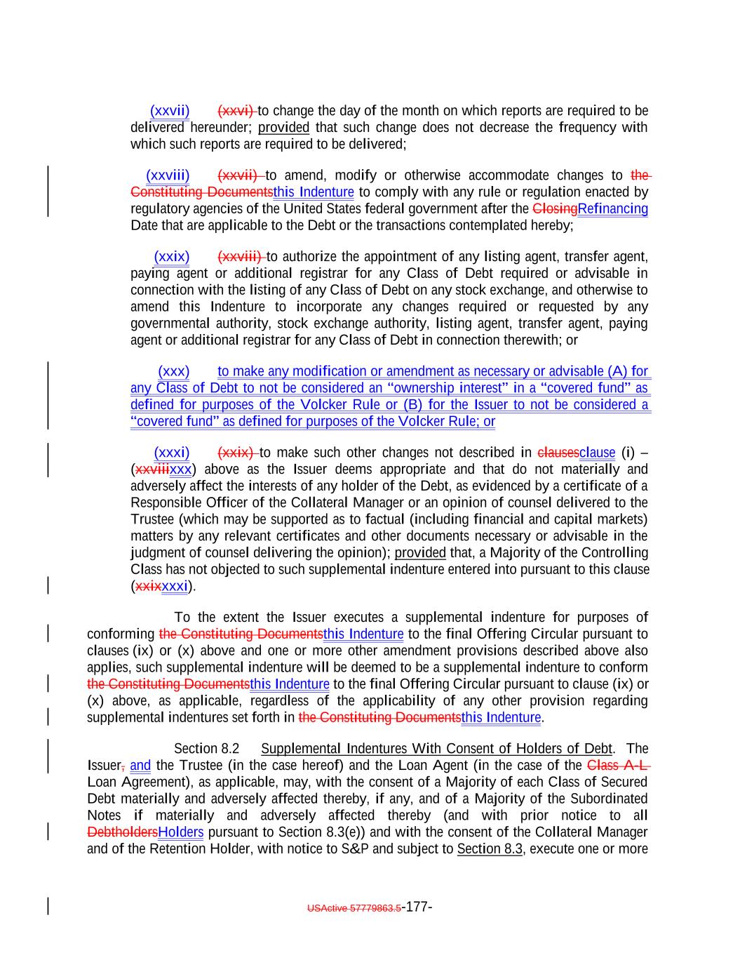 TABLE OF CONTENTS (continued) Page -iv- Section 7.9 Statement as to Compliance. 146142 Section 7.10 The Issuer May Consolidate, etc. 146142 Section 7.11 Successor Substituted. 148144 Section 7.12 No Other Business. 148144 Section 7.13 [Reserved]. 148144 Section 7.14 Annual Rating Review. 148144 Section 7.15 Reporting. 149145 Section 7.16 Calculation Agent. 149145 Section 7.17 Certain Tax Matters 151. (a) 147 Section 7.18 Effective Date; Purchase of Additional Collateral Obligations 155. (a) 151 Section 7.19 Representations Relating to Security Interests in the Assets. 157153 Section 7.20 Limitation on Certain Maturity Amendments. 159155 Section 7.21 Maintenance of Listing. 160156 ARTICLE VIII SUPPLEMENTAL INDENTURES Section 8.1 Supplemental Indentures Without Consent of Holders of Debt. 160156 Section 8.2 Supplemental Indentures With Consent of Holders of Debt. 165161 Section 8.3 Execution of Supplemental Indentures. 166162 Section 8.4 Effect of Supplemental Indentures or Amendments. 169165 Section 8.5 Reference in Debt to Supplemental Indentures. Debt 169165 ARTICLE IX REDEMPTION OF DEBT Section 9.1 Mandatory Redemption. 169165 Section 9.2 Optional Redemption. 169165 Section 9.3 Tax Redemption 173. (a) 169 Section 9.4 Redemption Procedures. 170 Section 9.5 Debt Payable on Redemption Date. 176172 Section 9.6 Special Redemption. 176172 Section 9.7 Optional Re-Pricing. 177173