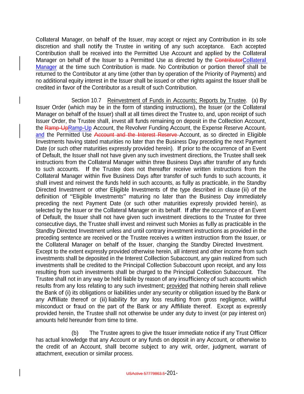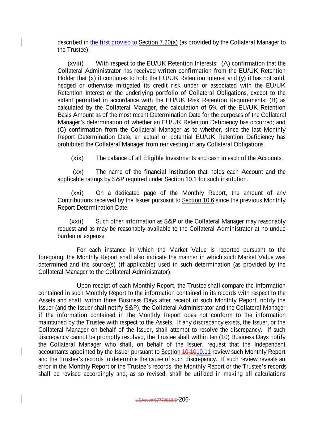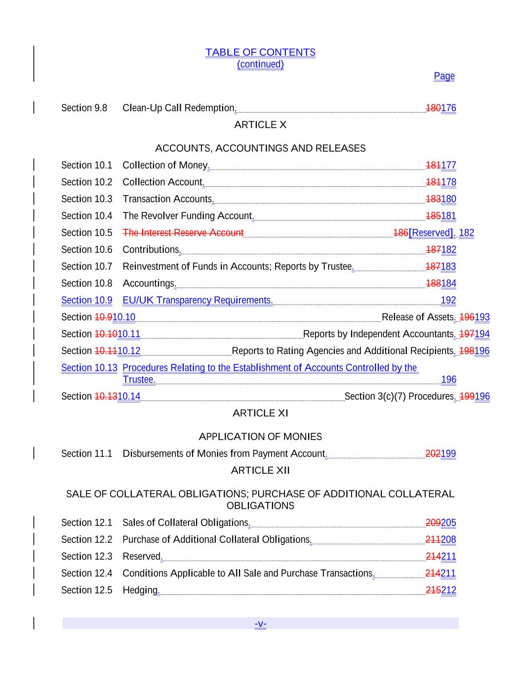 TABLE OF CONTENTS (continued) Page -v- Section 9.8 Clean-Up Call Redemption. 180176 ARTICLE X ACCOUNTS, ACCOUNTINGS AND RELEASES Section 10.1 Collection of Money. 181177 Section 10.2 Collection Account. 181178 Section 10.3 Transaction Accounts. 183180 Section 10.4 The Revolver Funding Account. 185181 Section 10.5 The Interest Reserve Account 186[Reserved]. 182 Section 10.6 Contributions. 187182 Section 10.7 Reinvestment of Funds in Accounts; Reports by Trustee. 187183 Section 10.8 Accountings. 188184 Section 10.9 EU/UK Transparency Requirements. 192 Section 10.910.10 Release of Assets. 196193 Section 10.1010.11 Reports by Independent Accountants. 197194 Section 10.1110.12 Reports to Rating Agencies and Additional Recipients. 198196 Section 10.13 Procedures Relating to the Establishment of Accounts Controlled by the Trustee. 196 Section 10.1310.14 Section 3(c)(7) Procedures. 199196 ARTICLE XI APPLICATION OF MONIES Section 11.1 Disbursements of Monies from Payment Account. 202199 ARTICLE XII SALE OF COLLATERAL OBLIGATIONS; PURCHASE OF ADDITIONAL COLLATERAL OBLIGATIONS Section 12.1 Sales of Collateral Obligations. 209205 Section 12.2 Purchase of Additional Collateral Obligations. 211208 Section 12.3 Reserved. 214211 Section 12.4 Conditions Applicable to All Sale and Purchase Transactions. 214211 Section 12.5 Hedging. 215212