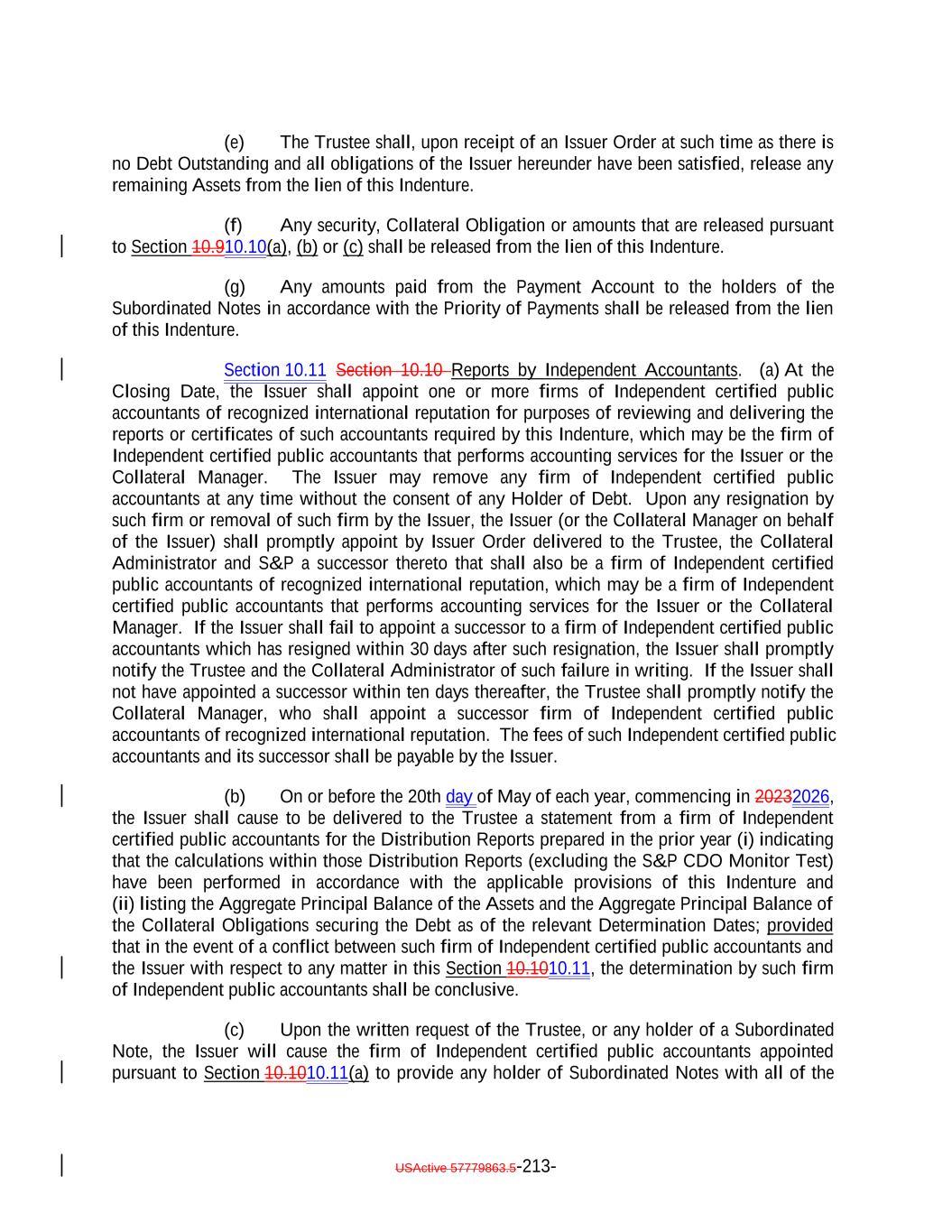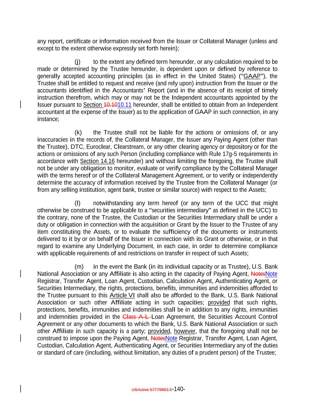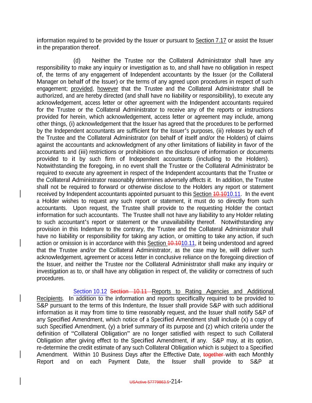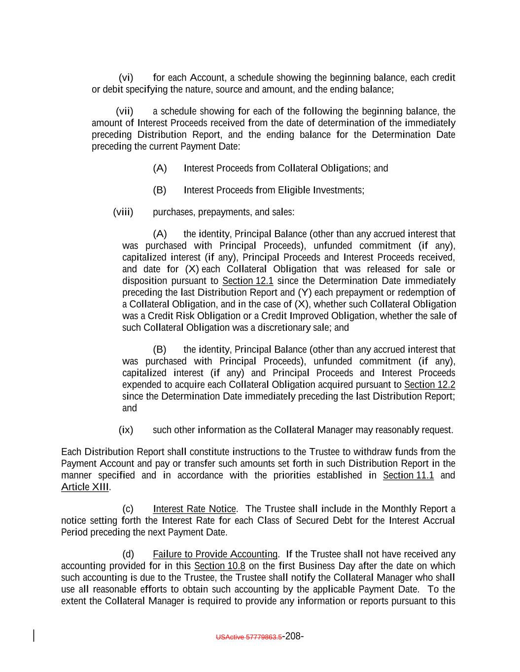 TABLE OF CONTENTS (continued) Page -v- Section 9.8 Clean-Up Call Redemption. 180176 ARTICLE X ACCOUNTS, ACCOUNTINGS AND RELEASES Section 10.1 Collection of Money. 181177 Section 10.2 Collection Account. 181178 Section 10.3 Transaction Accounts. 183180 Section 10.4 The Revolver Funding Account. 185181 Section 10.5 The Interest Reserve Account 186[Reserved]. 182 Section 10.6 Contributions. 187182 Section 10.7 Reinvestment of Funds in Accounts; Reports by Trustee. 187183 Section 10.8 Accountings. 188184 Section 10.9 EU/UK Transparency Requirements. 192 Section 10.910.10 Release of Assets. 196193 Section 10.1010.11 Reports by Independent Accountants. 197194 Section 10.1110.12 Reports to Rating Agencies and Additional Recipients. 198196 Section 10.13 Procedures Relating to the Establishment of Accounts Controlled by the Trustee. 196 Section 10.1310.14 Section 3(c)(7) Procedures. 199196 ARTICLE XI APPLICATION OF MONIES Section 11.1 Disbursements of Monies from Payment Account. 202199 ARTICLE XII SALE OF COLLATERAL OBLIGATIONS; PURCHASE OF ADDITIONAL COLLATERAL OBLIGATIONS Section 12.1 Sales of Collateral Obligations. 209205 Section 12.2 Purchase of Additional Collateral Obligations. 211208 Section 12.3 Reserved. 214211 Section 12.4 Conditions Applicable to All Sale and Purchase Transactions. 214211 Section 12.5 Hedging. 215212