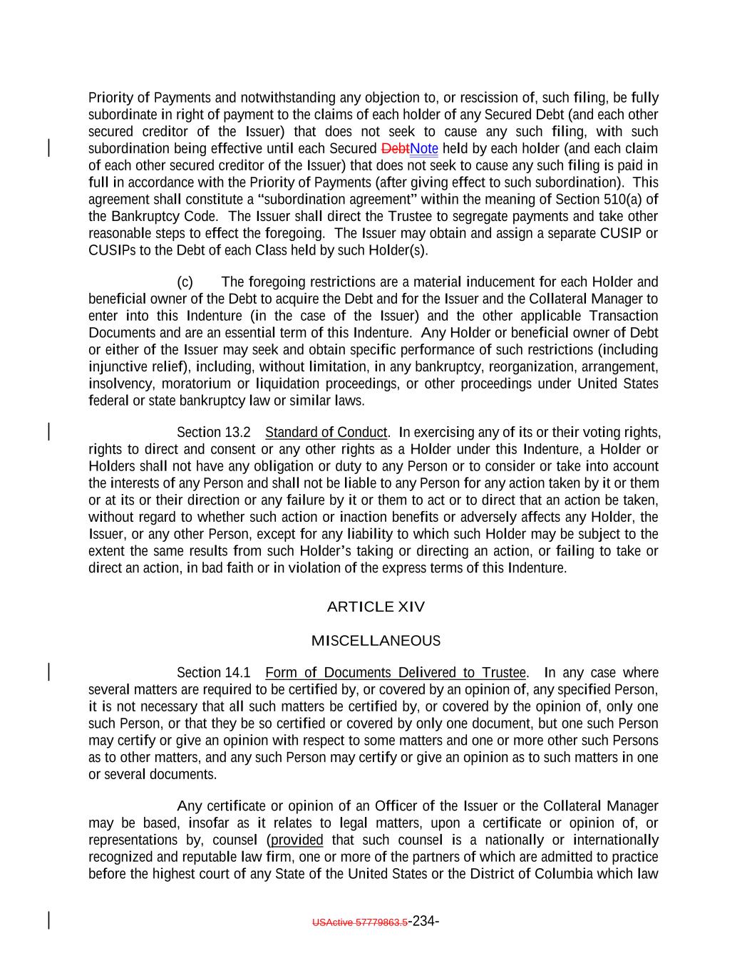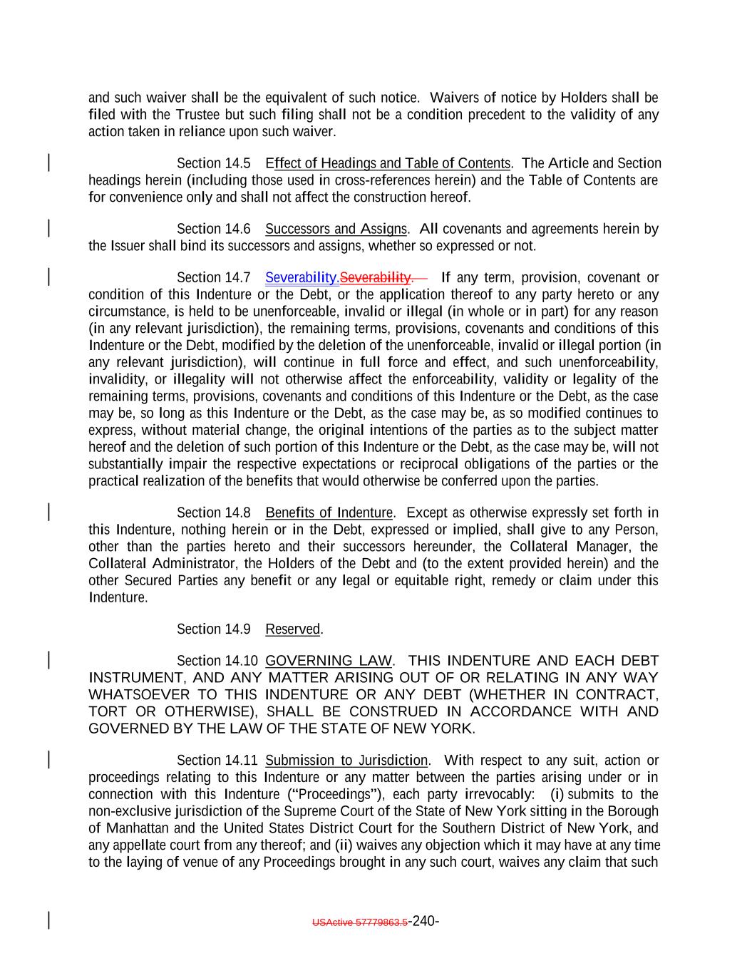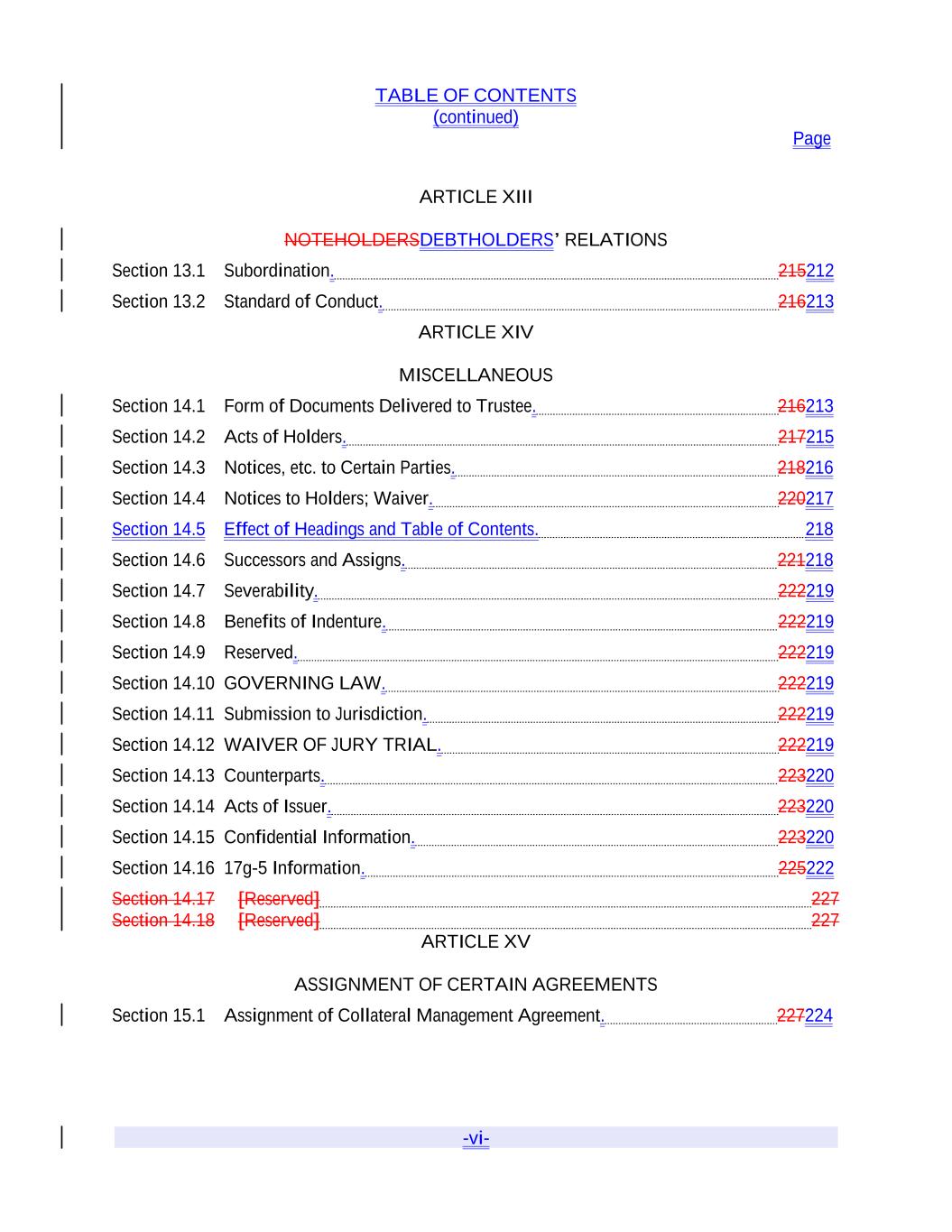 TABLE OF CONTENTS (continued) Page -vi- ARTICLE XIII NOTEHOLDERSDEBTHOLDERS’ RELATIONS Section 13.1 Subordination. 215212 Section 13.2 Standard of Conduct. 216213 ARTICLE XIV MISCELLANEOUS Section 14.1 Form of Documents Delivered to Trustee. 216213 Section 14.2 Acts of Holders. 217215 Section 14.3 Notices, etc. to Certain Parties. 218216 Section 14.4 Notices to Holders; Waiver. 220217 Section 14.5 Effect of Headings and Table of Contents. 218 Section 14.6 Successors and Assigns. 221218 Section 14.7 Severability. 222219 Section 14.8 Benefits of Indenture. 222219 Section 14.9 Reserved. 222219 Section 14.10 GOVERNING LAW. 222219 Section 14.11 Submission to Jurisdiction. 222219 Section 14.12 WAIVER OF JURY TRIAL. 222219 Section 14.13 Counterparts. 223220 Section 14.14 Acts of Issuer. 223220 Section 14.15 Confidential Information. 223220 Section 14.16 17g-5 Information. 225222 Section 14.17 [Reserved] 227 Section 14.18 [Reserved] 227 ARTICLE XV ASSIGNMENT OF CERTAIN AGREEMENTS Section 15.1 Assignment of Collateral Management Agreement. 227224