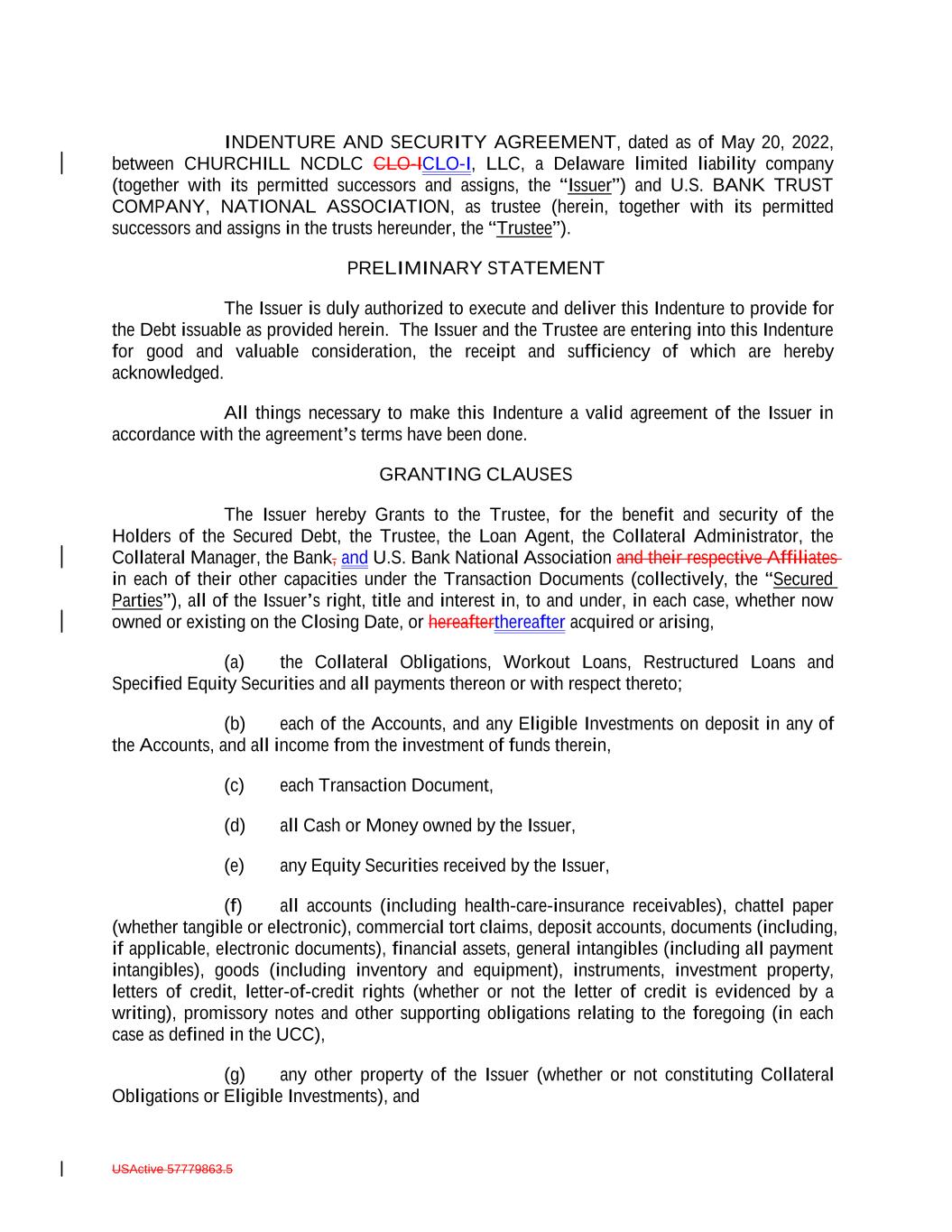 INDENTURE AND SECURITY AGREEMENT, dated as of May 20, 2022, between CHURCHILL NCDLC CLO-ICLO-I, LLC, a Delaware limited liability company (together with its permitted successors and assigns, the “Issuer”) and U.S. BANK TRUST COMPANY, NATIONAL ASSOCIATION, as trustee (herein, together with its permitted successors and assigns in the trusts hereunder, the “Trustee”). PRELIMINARY STATEMENT The Issuer is duly authorized to execute and deliver this Indenture to provide for the Debt issuable as provided herein. The Issuer and the Trustee are entering into this Indenture for good and valuable consideration, the receipt and sufficiency of which are hereby acknowledged. All things necessary to make this Indenture a valid agreement of the Issuer in accordance with the agreement’s terms have been done. GRANTING CLAUSES The Issuer hereby Grants to the Trustee, for the benefit and security of the Holders of the Secured Debt, the Trustee, the Loan Agent, the Collateral Administrator, the Collateral Manager, the Bank, and U.S. Bank National Association and their respective Affiliates in each of their other capacities under the Transaction Documents (collectively, the “Secured Parties”), all of the Issuer’s right, title and interest in, to and under, in each case, whether now owned or existing on the Closing Date, or hereafterthereafter acquired or arising, (a) the Collateral Obligations, Workout Loans, Restructured Loans and Specified Equity Securities and all payments thereon or with respect thereto; (b) each of the Accounts, and any Eligible Investments on deposit in any of the Accounts, and all income from the investment of funds therein, (c) each Transaction Document, (d) all Cash or Money owned by the Issuer, (e) any Equity Securities received by the Issuer, (f) all accounts (including health-care-insurance receivables), chattel paper (whether tangible or electronic), commercial tort claims, deposit accounts, documents (including, if applicable, electronic documents), financial assets, general intangibles (including all payment intangibles), goods (including inventory and equipment), instruments, investment property, letters of credit, letter-of-credit rights (whether or not the letter of credit is evidenced by a writing), promissory notes and other supporting obligations relating to the foregoing (in each case as defined in the UCC), (g) any other property of the Issuer (whether or not constituting Collateral Obligations or Eligible Investments), and USActive 57779863.5