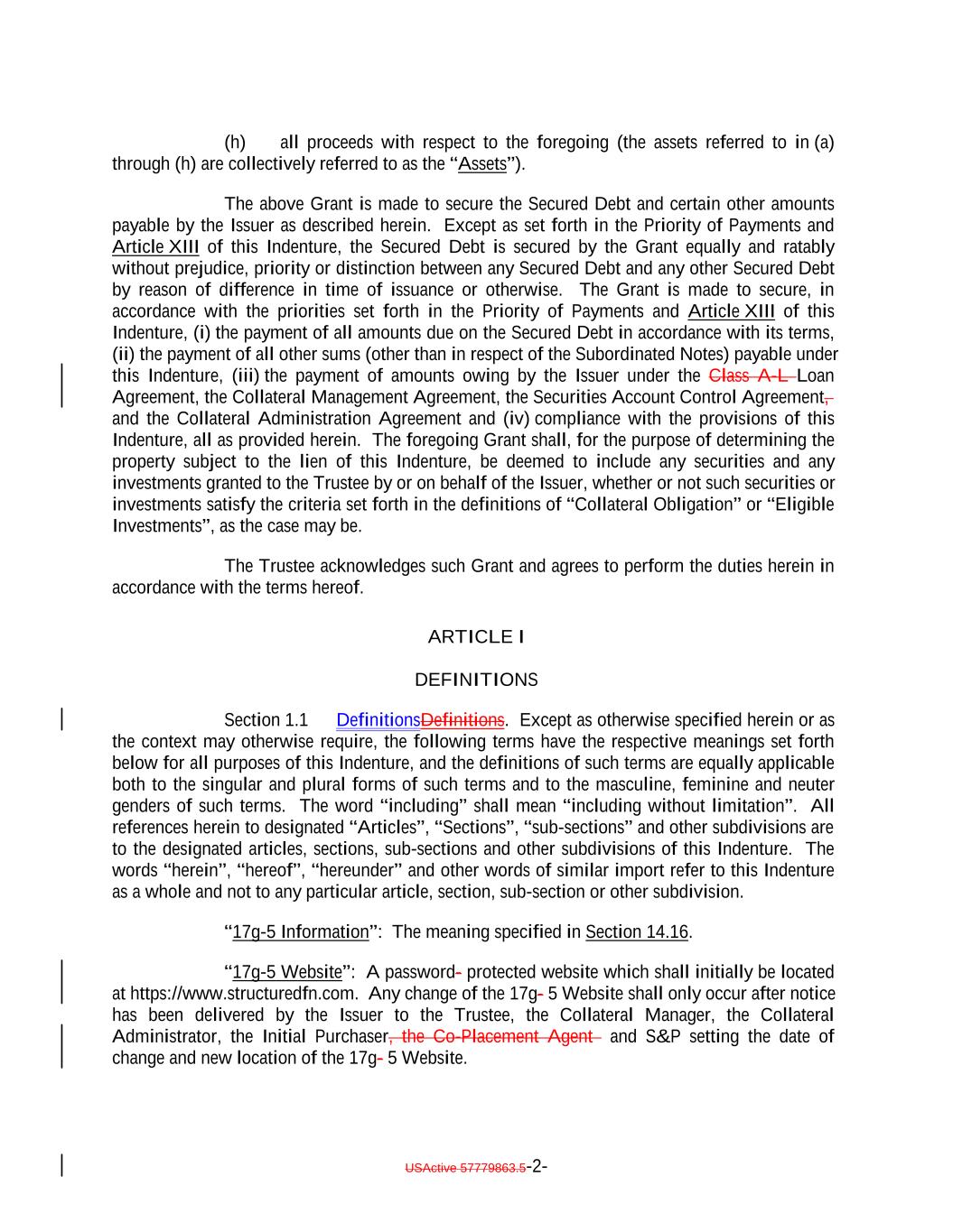 (h) all proceeds with respect to the foregoing (the assets referred to in (a) through (h) are collectively referred to as the “Assets”). The above Grant is made to secure the Secured Debt and certain other amounts payable by the Issuer as described herein. Except as set forth in the Priority of Payments and Article XIII of this Indenture, the Secured Debt is secured by the Grant equally and ratably without prejudice, priority or distinction between any Secured Debt and any other Secured Debt by reason of difference in time of issuance or otherwise. The Grant is made to secure, in accordance with the priorities set forth in the Priority of Payments and Article XIII of this Indenture, (i) the payment of all amounts due on the Secured Debt in accordance with its terms, (ii) the payment of all other sums (other than in respect of the Subordinated Notes) payable under this Indenture, (iii) the payment of amounts owing by the Issuer under the Class A-L Loan Agreement, the Collateral Management Agreement, the Securities Account Control Agreement, and the Collateral Administration Agreement and (iv) compliance with the provisions of this Indenture, all as provided herein. The foregoing Grant shall, for the purpose of determining the property subject to the lien of this Indenture, be deemed to include any securities and any investments granted to the Trustee by or on behalf of the Issuer, whether or not such securities or investments satisfy the criteria set forth in the definitions of “Collateral Obligation” or “Eligible Investments”, as the case may be. The Trustee acknowledges such Grant and agrees to perform the duties herein in accordance with the terms hereof. ARTICLE I DEFINITIONS Section 1.1 DefinitionsDefinitions. Except as otherwise specified herein or as the context may otherwise require, the following terms have the respective meanings set forth below for all purposes of this Indenture, and the definitions of such terms are equally applicable both to the singular and plural forms of such terms and to the masculine, feminine and neuter genders of such terms. The word “including” shall mean “including without limitation”. All references herein to designated “Articles”, “Sections”, “sub-sections” and other subdivisions are to the designated articles, sections, sub-sections and other subdivisions of this Indenture. The words “herein”, “hereof”, “hereunder” and other words of similar import refer to this Indenture as a whole and not to any particular article, section, sub-section or other subdivision. “17g-5 Information”: The meaning specified in Section 14.16. “17g-5 Website”: A password- protected website which shall initially be located at https://www.structuredfn.com. Any change of the 17g- 5 Website shall only occur after notice has been delivered by the Issuer to the Trustee, the Collateral Manager, the Collateral Administrator, the Initial Purchaser, the Co-Placement Agent and S&P setting the date of change and new location of the 17g- 5 Website. USActive 57779863.5-2-