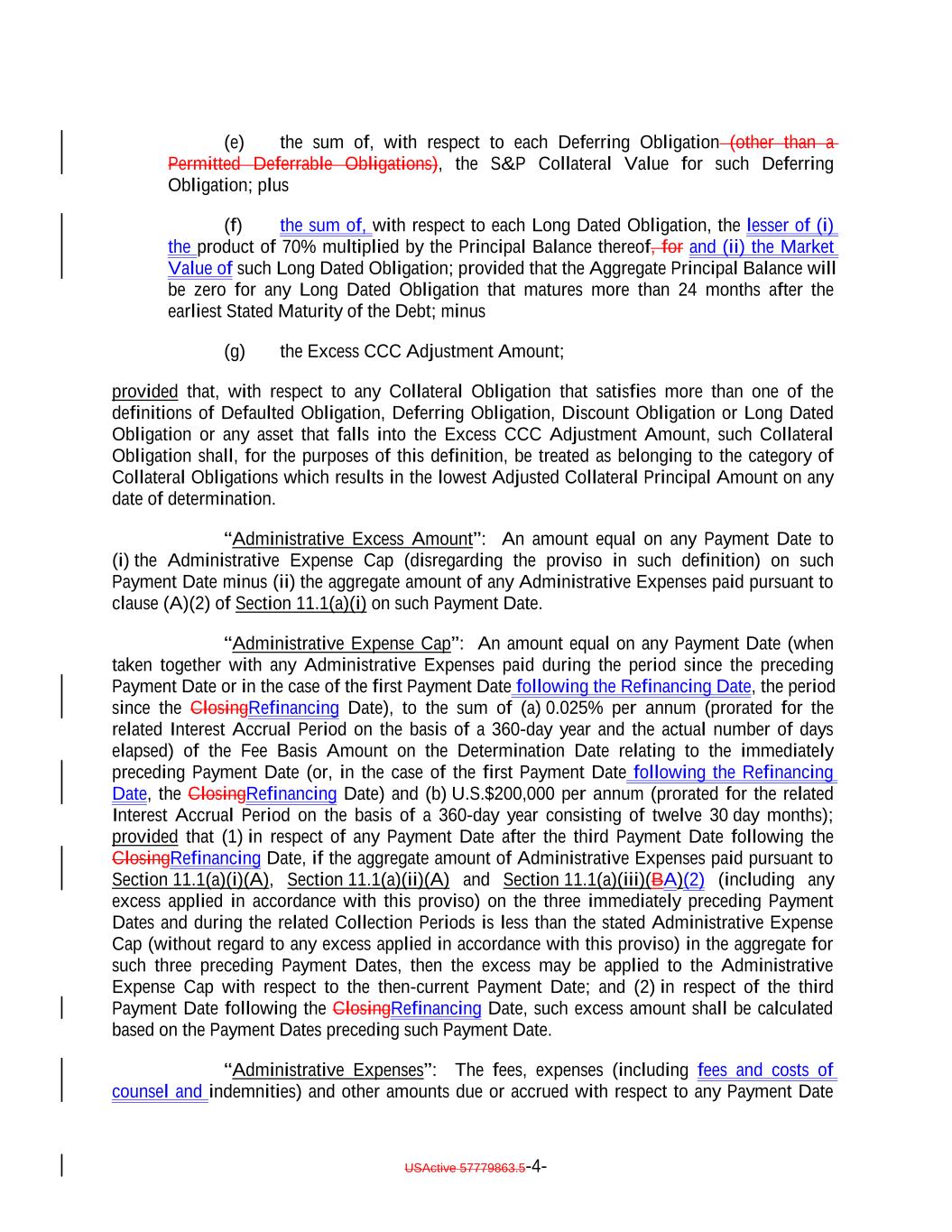 (e) the sum of, with respect to each Deferring Obligation (other than a Permitted Deferrable Obligations), the S&P Collateral Value for such Deferring Obligation; plus (f) the sum of, with respect to each Long Dated Obligation, the lesser of (i) the product of 70% multiplied by the Principal Balance thereof, for and (ii) the Market Value of such Long Dated Obligation; provided that the Aggregate Principal Balance will be zero for any Long Dated Obligation that matures more than 24 months after the earliest Stated Maturity of the Debt; minus (g) the Excess CCC Adjustment Amount; provided that, with respect to any Collateral Obligation that satisfies more than one of the definitions of Defaulted Obligation, Deferring Obligation, Discount Obligation or Long Dated Obligation or any asset that falls into the Excess CCC Adjustment Amount, such Collateral Obligation shall, for the purposes of this definition, be treated as belonging to the category of Collateral Obligations which results in the lowest Adjusted Collateral Principal Amount on any date of determination. “Administrative Excess Amount”: An amount equal on any Payment Date to (i) the Administrative Expense Cap (disregarding the proviso in such definition) on such Payment Date minus (ii) the aggregate amount of any Administrative Expenses paid pursuant to clause (A)(2) of Section 11.1(a)(i) on such Payment Date. “Administrative Expense Cap”: An amount equal on any Payment Date (when taken together with any Administrative Expenses paid during the period since the preceding Payment Date or in the case of the first Payment Date following the Refinancing Date, the period since the ClosingRefinancing Date), to the sum of (a) 0.025% per annum (prorated for the related Interest Accrual Period on the basis of a 360-day year and the actual number of days elapsed) of the Fee Basis Amount on the Determination Date relating to the immediately preceding Payment Date (or, in the case of the first Payment Date following the Refinancing Date, the ClosingRefinancing Date) and (b) U.S.$200,000 per annum (prorated for the related Interest Accrual Period on the basis of a 360-day year consisting of twelve 30 day months); provided that (1) in respect of any Payment Date after the third Payment Date following the ClosingRefinancing Date, if the aggregate amount of Administrative Expenses paid pursuant to Section 11.1(a)(i)(A), Section 11.1(a)(ii)(A) and Section 11.1(a)(iii)(BA)(2) (including any excess applied in accordance with this proviso) on the three immediately preceding Payment Dates and during the related Collection Periods is less than the stated Administrative Expense Cap (without regard to any excess applied in accordance with this proviso) in the aggregate for such three preceding Payment Dates, then the excess may be applied to the Administrative Expense Cap with respect to the then-current Payment Date; and (2) in respect of the third Payment Date following the ClosingRefinancing Date, such excess amount shall be calculated based on the Payment Dates preceding such Payment Date. “Administrative Expenses”: The fees, expenses (including fees and costs of counsel and indemnities) and other amounts due or accrued with respect to any Payment Date USActive 57779863.5-4-