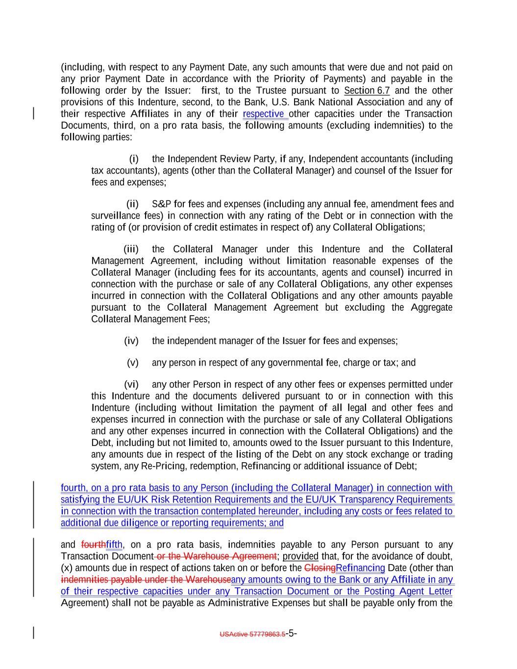 (including, with respect to any Payment Date, any such amounts that were due and not paid on any prior Payment Date in accordance with the Priority of Payments) and payable in the following order by the Issuer: first, to the Trustee pursuant to Section 6.7 and the other provisions of this Indenture, second, to the Bank, U.S. Bank National Association and any of their respective Affiliates in any of their respective other capacities under the Transaction Documents, third, on a pro rata basis, the following amounts (excluding indemnities) to the following parties: (i) the Independent Review Party, if any, Independent accountants (including tax accountants), agents (other than the Collateral Manager) and counsel of the Issuer for fees and expenses; (ii) S&P for fees and expenses (including any annual fee, amendment fees and surveillance fees) in connection with any rating of the Debt or in connection with the rating of (or provision of credit estimates in respect of) any Collateral Obligations; (iii) the Collateral Manager under this Indenture and the Collateral Management Agreement, including without limitation reasonable expenses of the Collateral Manager (including fees for its accountants, agents and counsel) incurred in connection with the purchase or sale of any Collateral Obligations, any other expenses incurred in connection with the Collateral Obligations and any other amounts payable pursuant to the Collateral Management Agreement but excluding the Aggregate Collateral Management Fees; (iv) the independent manager of the Issuer for fees and expenses; (v) any person in respect of any governmental fee, charge or tax; and (vi) any other Person in respect of any other fees or expenses permitted under this Indenture and the documents delivered pursuant to or in connection with this Indenture (including without limitation the payment of all legal and other fees and expenses incurred in connection with the purchase or sale of any Collateral Obligations and any other expenses incurred in connection with the Collateral Obligations) and the Debt, including but not limited to, amounts owed to the Issuer pursuant to this Indenture, any amounts due in respect of the listing of the Debt on any stock exchange or trading system, any Re-Pricing, redemption, Refinancing or additional issuance of Debt; fourth, on a pro rata basis to any Person (including the Collateral Manager) in connection with satisfying the EU/UK Risk Retention Requirements and the EU/UK Transparency Requirements in connection with the transaction contemplated hereunder, including any costs or fees related to additional due diligence or reporting requirements; and and fourthfifth, on a pro rata basis, indemnities payable to any Person pursuant to any Transaction Document or the Warehouse Agreement; provided that, for the avoidance of doubt, (x) amounts due in respect of actions taken on or before the ClosingRefinancing Date (other than indemnities payable under the Warehouseany amounts owing to the Bank or any Affiliate in any of their respective capacities under any Transaction Document or the Posting Agent Letter Agreement) shall not be payable as Administrative Expenses but shall be payable only from the USActive 57779863.5-5-