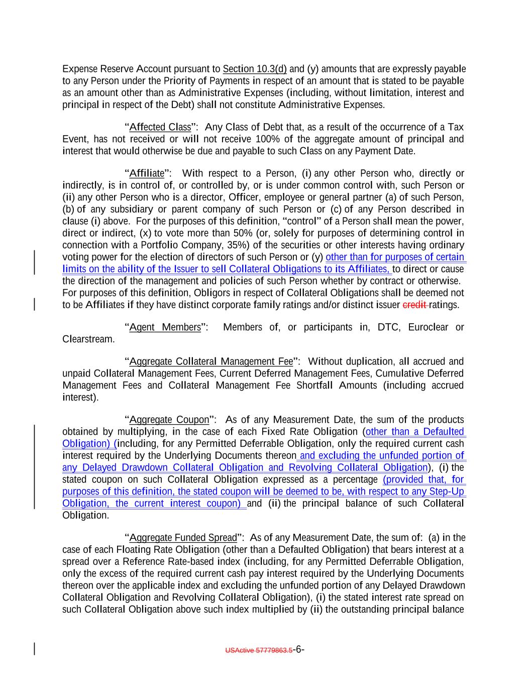 Expense Reserve Account pursuant to Section 10.3(d) and (y) amounts that are expressly payable to any Person under the Priority of Payments in respect of an amount that is stated to be payable as an amount other than as Administrative Expenses (including, without limitation, interest and principal in respect of the Debt) shall not constitute Administrative Expenses. “Affected Class”: Any Class of Debt that, as a result of the occurrence of a Tax Event, has not received or will not receive 100% of the aggregate amount of principal and interest that would otherwise be due and payable to such Class on any Payment Date. “Affiliate”: With respect to a Person, (i) any other Person who, directly or indirectly, is in control of, or controlled by, or is under common control with, such Person or (ii) any other Person who is a director, Officer, employee or general partner (a) of such Person, (b) of any subsidiary or parent company of such Person or (c) of any Person described in clause (i) above. For the purposes of this definition, “control” of a Person shall mean the power, direct or indirect, (x) to vote more than 50% (or, solely for purposes of determining control in connection with a Portfolio Company, 35%) of the securities or other interests having ordinary voting power for the election of directors of such Person or (y) other than for purposes of certain limits on the ability of the Issuer to sell Collateral Obligations to its Affiliates, to direct or cause the direction of the management and policies of such Person whether by contract or otherwise. For purposes of this definition, Obligors in respect of Collateral Obligations shall be deemed not to be Affiliates if they have distinct corporate family ratings and/or distinct issuer credit ratings. “Agent Members”: Members of, or participants in, DTC, Euroclear or Clearstream. “Aggregate Collateral Management Fee”: Without duplication, all accrued and unpaid Collateral Management Fees, Current Deferred Management Fees, Cumulative Deferred Management Fees and Collateral Management Fee Shortfall Amounts (including accrued interest). “Aggregate Coupon”: As of any Measurement Date, the sum of the products obtained by multiplying, in the case of each Fixed Rate Obligation (other than a Defaulted Obligation) (including, for any Permitted Deferrable Obligation, only the required current cash interest required by the Underlying Documents thereon and excluding the unfunded portion of any Delayed Drawdown Collateral Obligation and Revolving Collateral Obligation), (i) the stated coupon on such Collateral Obligation expressed as a percentage (provided that, for purposes of this definition, the stated coupon will be deemed to be, with respect to any Step-Up Obligation, the current interest coupon) and (ii) the principal balance of such Collateral Obligation. “Aggregate Funded Spread”: As of any Measurement Date, the sum of: (a) in the case of each Floating Rate Obligation (other than a Defaulted Obligation) that bears interest at a spread over a Reference Rate-based index (including, for any Permitted Deferrable Obligation, only the excess of the required current cash pay interest required by the Underlying Documents thereon over the applicable index and excluding the unfunded portion of any Delayed Drawdown Collateral Obligation and Revolving Collateral Obligation), (i) the stated interest rate spread on such Collateral Obligation above such index multiplied by (ii) the outstanding principal balance USActive 57779863.5-6-