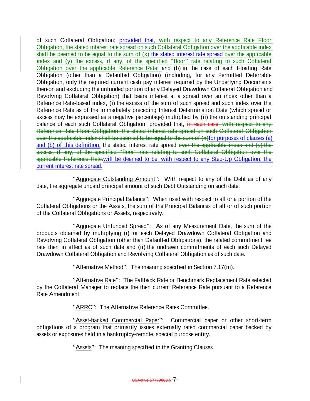 of such Collateral Obligation; provided that, with respect to any Reference Rate Floor Obligation, the stated interest rate spread on such Collateral Obligation over the applicable index shall be deemed to be equal to the sum of (x) the stated interest rate spread over the applicable index and (y) the excess, if any, of the specified “floor” rate relating to such Collateral Obligation over the applicable Reference Rate; and (b) in the case of each Floating Rate Obligation (other than a Defaulted Obligation) (including, for any Permitted Deferrable Obligation, only the required current cash pay interest required by the Underlying Documents thereon and excluding the unfunded portion of any Delayed Drawdown Collateral Obligation and Revolving Collateral Obligation) that bears interest at a spread over an index other than a Reference Rate-based index, (i) the excess of the sum of such spread and such index over the Reference Rate as of the immediately preceding Interest Determination Date (which spread or excess may be expressed as a negative percentage) multiplied by (ii) the outstanding principal balance of each such Collateral Obligation; provided that, in each case, with respect to any Reference Rate Floor Obligation, the stated interest rate spread on such Collateral Obligation over the applicable index shall be deemed to be equal to the sum of (x)for purposes of clauses (a) and (b) of this definition, the stated interest rate spread over the applicable index and (y) the excess, if any, of the specified “floor” rate relating to such Collateral Obligation over the applicable Reference Rate.will be deemed to be, with respect to any Step-Up Obligation, the current interest rate spread. “Aggregate Outstanding Amount”: With respect to any of the Debt as of any date, the aggregate unpaid principal amount of such Debt Outstanding on such date. “Aggregate Principal Balance”: When used with respect to all or a portion of the Collateral Obligations or the Assets, the sum of the Principal Balances of all or of such portion of the Collateral Obligations or Assets, respectively. “Aggregate Unfunded Spread”: As of any Measurement Date, the sum of the products obtained by multiplying (i) for each Delayed Drawdown Collateral Obligation and Revolving Collateral Obligation (other than Defaulted Obligations), the related commitment fee rate then in effect as of such date and (ii) the undrawn commitments of each such Delayed Drawdown Collateral Obligation and Revolving Collateral Obligation as of such date. “Alternative Method”: The meaning specified in Section 7.17(m). “Alternative Rate”: The Fallback Rate or Benchmark Replacement Rate selected by the Collateral Manager to replace the then current Reference Rate pursuant to a Reference Rate Amendment. “ARRC”: The Alternative Reference Rates Committee. “Asset-backed Commercial Paper”: Commercial paper or other short-term obligations of a program that primarily issues externally rated commercial paper backed by assets or exposures held in a bankruptcy-remote, special purpose entity. “Assets”: The meaning specified in the Granting Clauses. USActive 57779863.5-7-