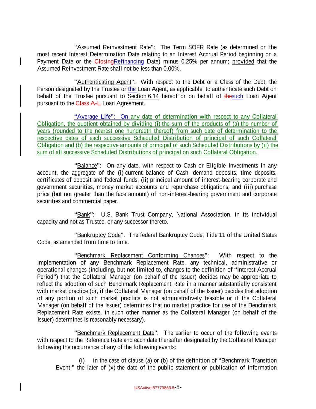 “Assumed Reinvestment Rate”: The Term SOFR Rate (as determined on the most recent Interest Determination Date relating to an Interest Accrual Period beginning on a Payment Date or the ClosingRefinancing Date) minus 0.25% per annum; provided that the Assumed Reinvestment Rate shall not be less than 0.00%. “Authenticating Agent”: With respect to the Debt or a Class of the Debt, the Person designated by the Trustee or the Loan Agent, as applicable, to authenticate such Debt on behalf of the Trustee pursuant to Section 6.14 hereof or on behalf of thesuch Loan Agent pursuant to the Class A-L Loan Agreement. “Average Life”: On any date of determination with respect to any Collateral Obligation, the quotient obtained by dividing (i) the sum of the products of (a) the number of years (rounded to the nearest one hundredth thereof) from such date of determination to the respective dates of each successive Scheduled Distribution of principal of such Collateral Obligation and (b) the respective amounts of principal of such Scheduled Distributions by (ii) the sum of all successive Scheduled Distributions of principal on such Collateral Obligation. “Balance”: On any date, with respect to Cash or Eligible Investments in any account, the aggregate of the (i) current balance of Cash, demand deposits, time deposits, certificates of deposit and federal funds; (ii) principal amount of interest-bearing corporate and government securities, money market accounts and repurchase obligations; and (iii) purchase price (but not greater than the face amount) of non-interest-bearing government and corporate securities and commercial paper. “Bank”: U.S. Bank Trust Company, National Association, in its individual capacity and not as Trustee, or any successor thereto. “Bankruptcy Code”: The federal Bankruptcy Code, Title 11 of the United States Code, as amended from time to time. “Benchmark Replacement Conforming Changes”: With respect to the implementation of any Benchmark Replacement Rate, any technical, administrative or operational changes (including, but not limited to, changes to the definition of “Interest Accrual Period”) that the Collateral Manager (on behalf of the Issuer) decides may be appropriate to reflect the adoption of such Benchmark Replacement Rate in a manner substantially consistent with market practice (or, if the Collateral Manager (on behalf of the Issuer) decides that adoption of any portion of such market practice is not administratively feasible or if the Collateral Manager (on behalf of the Issuer) determines that no market practice for use of the Benchmark Replacement Rate exists, in such other manner as the Collateral Manager (on behalf of the Issuer) determines is reasonably necessary). “Benchmark Replacement Date”: The earlier to occur of the following events with respect to the Reference Rate and each date thereafter designated by the Collateral Manager following the occurrence of any of the following events: (i) in the case of clause (a) or (b) of the definition of “Benchmark Transition Event,” the later of (x) the date of the public statement or publication of information USActive 57779863.5-8-