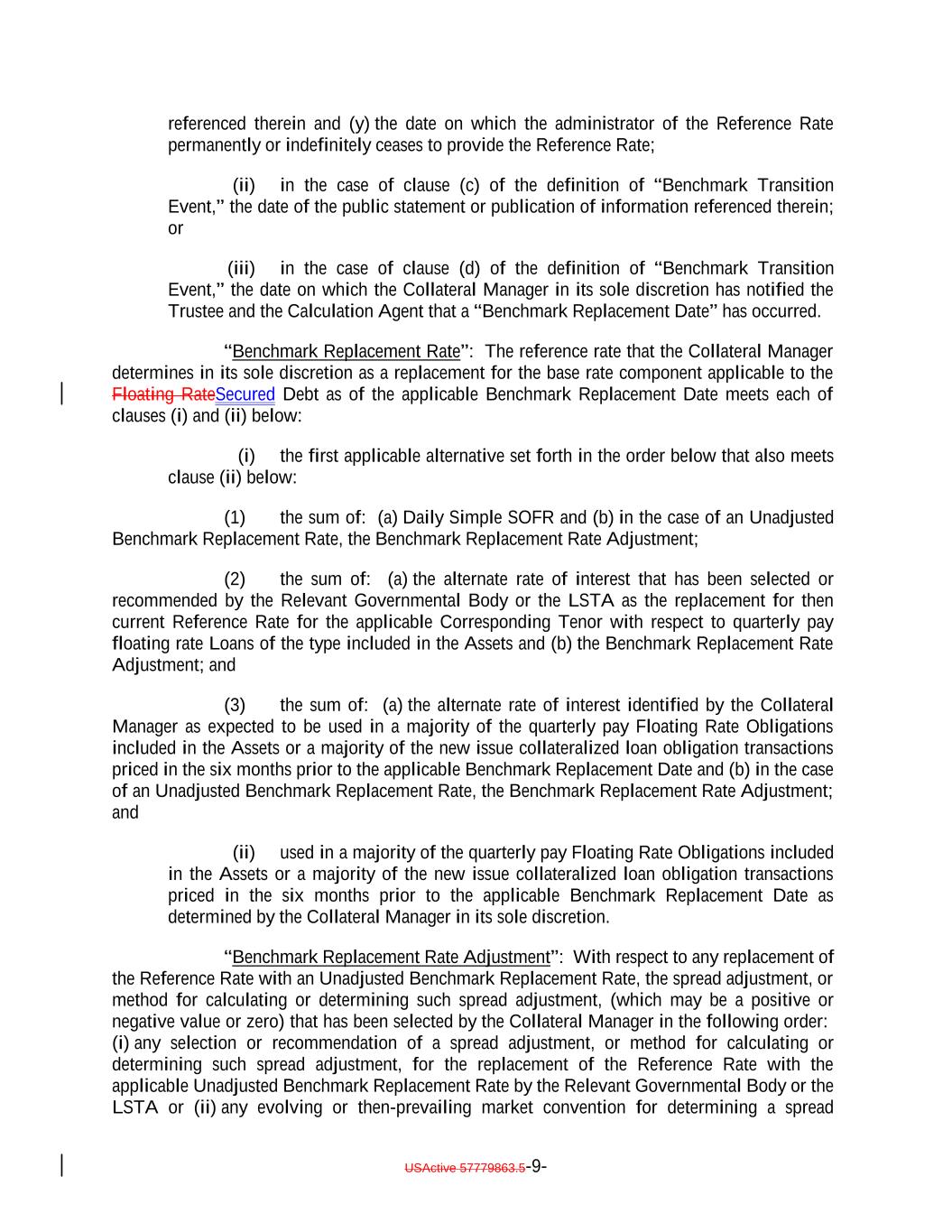 referenced therein and (y) the date on which the administrator of the Reference Rate permanently or indefinitely ceases to provide the Reference Rate; (ii) in the case of clause (c) of the definition of “Benchmark Transition Event,” the date of the public statement or publication of information referenced therein; or (iii) in the case of clause (d) of the definition of “Benchmark Transition Event,” the date on which the Collateral Manager in its sole discretion has notified the Trustee and the Calculation Agent that a “Benchmark Replacement Date” has occurred. “Benchmark Replacement Rate”: The reference rate that the Collateral Manager determines in its sole discretion as a replacement for the base rate component applicable to the Floating RateSecured Debt as of the applicable Benchmark Replacement Date meets each of clauses (i) and (ii) below: (i) the first applicable alternative set forth in the order below that also meets clause (ii) below: (1) the sum of: (a) Daily Simple SOFR and (b) in the case of an Unadjusted Benchmark Replacement Rate, the Benchmark Replacement Rate Adjustment; (2) the sum of: (a) the alternate rate of interest that has been selected or recommended by the Relevant Governmental Body or the LSTA as the replacement for then current Reference Rate for the applicable Corresponding Tenor with respect to quarterly pay floating rate Loans of the type included in the Assets and (b) the Benchmark Replacement Rate Adjustment; and (3) the sum of: (a) the alternate rate of interest identified by the Collateral Manager as expected to be used in a majority of the quarterly pay Floating Rate Obligations included in the Assets or a majority of the new issue collateralized loan obligation transactions priced in the six months prior to the applicable Benchmark Replacement Date and (b) in the case of an Unadjusted Benchmark Replacement Rate, the Benchmark Replacement Rate Adjustment; and (ii) used in a majority of the quarterly pay Floating Rate Obligations included in the Assets or a majority of the new issue collateralized loan obligation transactions priced in the six months prior to the applicable Benchmark Replacement Date as determined by the Collateral Manager in its sole discretion. “Benchmark Replacement Rate Adjustment”: With respect to any replacement of the Reference Rate with an Unadjusted Benchmark Replacement Rate, the spread adjustment, or method for calculating or determining such spread adjustment, (which may be a positive or negative value or zero) that has been selected by the Collateral Manager in the following order: (i) any selection or recommendation of a spread adjustment, or method for calculating or determining such spread adjustment, for the replacement of the Reference Rate with the applicable Unadjusted Benchmark Replacement Rate by the Relevant Governmental Body or the LSTA or (ii) any evolving or then-prevailing market convention for determining a spread USActive 57779863.5-9-