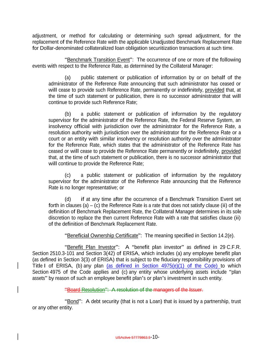 adjustment, or method for calculating or determining such spread adjustment, for the replacement of the Reference Rate with the applicable Unadjusted Benchmark Replacement Rate for Dollar-denominated collateralized loan obligation securitization transactions at such time. “Benchmark Transition Event”: The occurrence of one or more of the following events with respect to the Reference Rate, as determined by the Collateral Manager: (a) public statement or publication of information by or on behalf of the administrator of the Reference Rate announcing that such administrator has ceased or will cease to provide such Reference Rate, permanently or indefinitely, provided that, at the time of such statement or publication, there is no successor administrator that will continue to provide such Reference Rate; (b) a public statement or publication of information by the regulatory supervisor for the administrator of the Reference Rate, the Federal Reserve System, an insolvency official with jurisdiction over the administrator for the Reference Rate, a resolution authority with jurisdiction over the administrator for the Reference Rate or a court or an entity with similar insolvency or resolution authority over the administrator for the Reference Rate, which states that the administrator of the Reference Rate has ceased or will cease to provide the Reference Rate permanently or indefinitely, provided that, at the time of such statement or publication, there is no successor administrator that will continue to provide the Reference Rate; (c) a public statement or publication of information by the regulatory supervisor for the administrator of the Reference Rate announcing that the Reference Rate is no longer representative; or (d) if at any time after the occurrence of a Benchmark Transition Event set forth in clauses (a) – (c) the Reference Rate is a rate that does not satisfy clause (ii) of the definition of Benchmark Replacement Rate, the Collateral Manager determines in its sole discretion to replace the then current Reference Rate with a rate that satisfies clause (ii) of the definition of Benchmark Replacement Rate. “Beneficial Ownership Certificate”: The meaning specified in Section 14.2(e). “Benefit Plan Investor”: A “benefit plan investor” as defined in 29 C.F.R. Section 2510.3-101 and Section 3(42) of ERISA, which includes (a) any employee benefit plan (as defined in Section 3(3) of ERISA) that is subject to the fiduciary responsibility provisions of Title I of ERISA, (b) any plan (as defined in Section 4975(e)(1) of the Code) to which Section 4975 of the Code applies and (c) any entity whose underlying assets include “plan assets” by reason of such an employee benefit plan’s or plan’s investment in such entity. “Board Resolution”: A resolution of the managers of the Issuer. “Bond”: A debt security (that is not a Loan) that is issued by a partnership, trust or any other entity. USActive 57779863.5-10-
