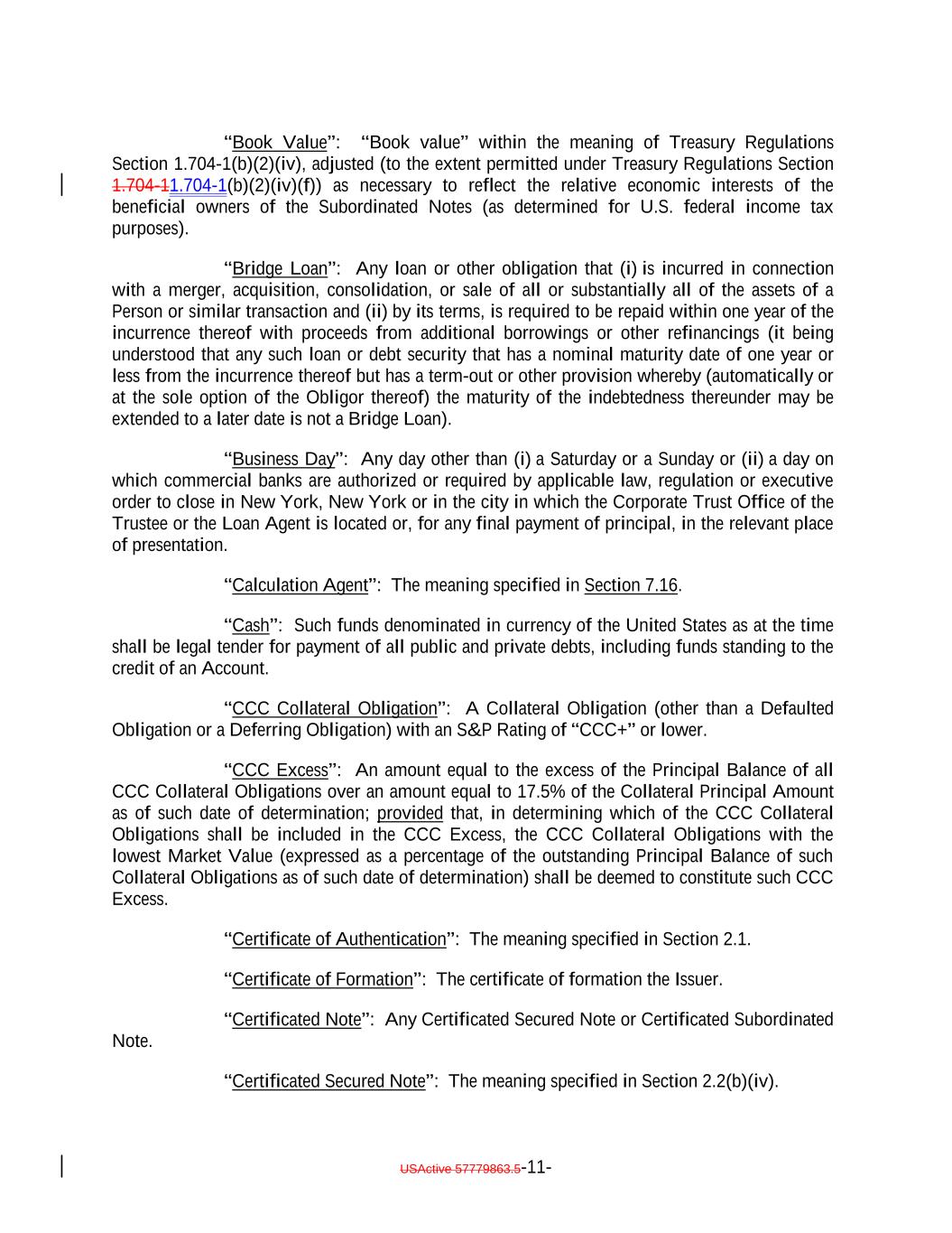 “Book Value”: “Book value” within the meaning of Treasury Regulations Section 1.704-1(b)(2)(iv), adjusted (to the extent permitted under Treasury Regulations Section 1.704-11.704-1(b)(2)(iv)(f)) as necessary to reflect the relative economic interests of the beneficial owners of the Subordinated Notes (as determined for U.S. federal income tax purposes). “Bridge Loan”: Any loan or other obligation that (i) is incurred in connection with a merger, acquisition, consolidation, or sale of all or substantially all of the assets of a Person or similar transaction and (ii) by its terms, is required to be repaid within one year of the incurrence thereof with proceeds from additional borrowings or other refinancings (it being understood that any such loan or debt security that has a nominal maturity date of one year or less from the incurrence thereof but has a term-out or other provision whereby (automatically or at the sole option of the Obligor thereof) the maturity of the indebtedness thereunder may be extended to a later date is not a Bridge Loan). “Business Day”: Any day other than (i) a Saturday or a Sunday or (ii) a day on which commercial banks are authorized or required by applicable law, regulation or executive order to close in New York, New York or in the city in which the Corporate Trust Office of the Trustee or the Loan Agent is located or, for any final payment of principal, in the relevant place of presentation. “Calculation Agent”: The meaning specified in Section 7.16. “Cash”: Such funds denominated in currency of the United States as at the time shall be legal tender for payment of all public and private debts, including funds standing to the credit of an Account. “CCC Collateral Obligation”: A Collateral Obligation (other than a Defaulted Obligation or a Deferring Obligation) with an S&P Rating of “CCC+” or lower. “CCC Excess”: An amount equal to the excess of the Principal Balance of all CCC Collateral Obligations over an amount equal to 17.5% of the Collateral Principal Amount as of such date of determination; provided that, in determining which of the CCC Collateral Obligations shall be included in the CCC Excess, the CCC Collateral Obligations with the lowest Market Value (expressed as a percentage of the outstanding Principal Balance of such Collateral Obligations as of such date of determination) shall be deemed to constitute such CCC Excess. “Certificate of Authentication”: The meaning specified in Section 2.1. “Certificate of Formation”: The certificate of formation the Issuer. “Certificated Note”: Any Certificated Secured Note or Certificated Subordinated Note. “Certificated Secured Note”: The meaning specified in Section 2.2(b)(iv). USActive 57779863.5-11-
