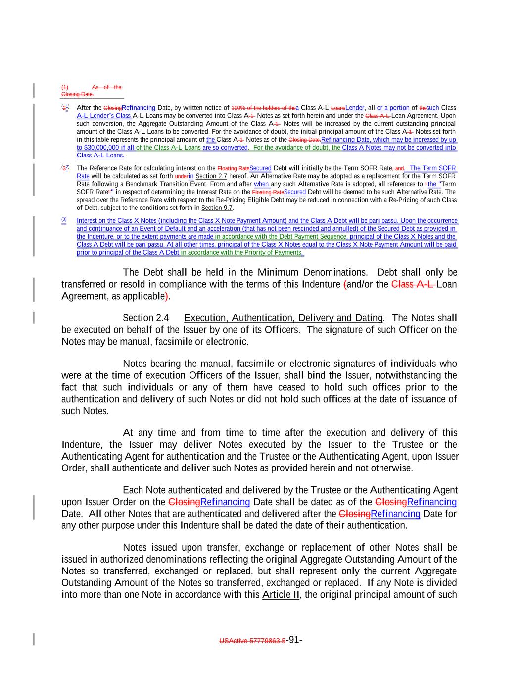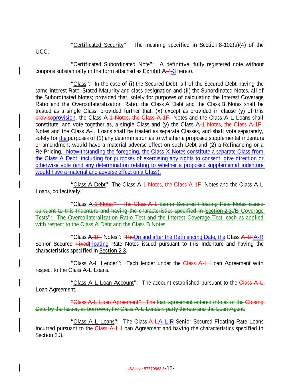 “Certificated Security”: The meaning specified in Section 8-102(a)(4) of the UCC. “Certificated Subordinated Note”: A definitive, fully registered note without coupons substantially in the form attached as Exhibit A-4-3 hereto. “Class”: In the case of (i) the Secured Debt, all of the Secured Debt having the same Interest Rate, Stated Maturity and class designation and (ii) the Subordinated Notes, all of the Subordinated Notes; provided that, solely for purposes of calculating the Interest Coverage Ratio and the Overcollateralization Ratio, the Class A Debt and the Class B Notes shall be treated as a single Class; provided further that, (x) except as provided in clause (y) of this provisoprovision, the Class A-1 Notes, the Class A-1F Notes and the Class A-L Loans shall constitute, and vote together as, a single Class and (y) the Class A-1 Notes, the Class A-1F Notes and the Class A-L Loans shall be treated as separate Classes, and shall vote separately, solely for the purposes of (1) any determination as to whether a proposed supplemental indenture or amendment would have a material adverse effect on such Debt and (2) a Refinancing or a Re-Pricing. Notwithstanding the foregoing, the Class X Notes constitute a separate Class from the Class A Debt, including for purposes of exercising any rights to consent, give direction or otherwise vote (and any determination relating to whether a proposed supplemental indenture would have a material and adverse effect on a Class). “Class A Debt”: The Class A-1 Notes, the Class A-1F Notes and the Class A-L Loans, collectively. “Class A-1 Notes”: The Class A-1 Senior Secured Floating Rate Notes issued pursuant to this Indenture and having the characteristics specified in Section 2.3./B Coverage Tests”: The Overcollateralization Ratio Test and the Interest Coverage Test, each as applied with respect to the Class A Debt and the Class B Notes. “Class A-1F Notes”: TheOn and after the Refinancing Date, the Class A-1FA-R Senior Secured FixedFloating Rate Notes issued pursuant to this Indenture and having the characteristics specified in Section 2.3. “Class A-L Lender”: Each lender under the Class A-L Loan Agreement with respect to the Class A-L Loans. “Class A-L Loan Account”: The account established pursuant to the Class A-L Loan Agreement. “Class A-L Loan Agreement”: The loan agreement entered into as of the Closing Date by the Issuer, as borrower, the Class A-L Lenders party thereto and the Loan Agent. “Class A-L Loans”: The Class A-LA-L-R Senior Secured Floating Rate Loans incurred pursuant to the Class A-L Loan Agreement and having the characteristics specified in Section 2.3. USActive 57779863.5-12-