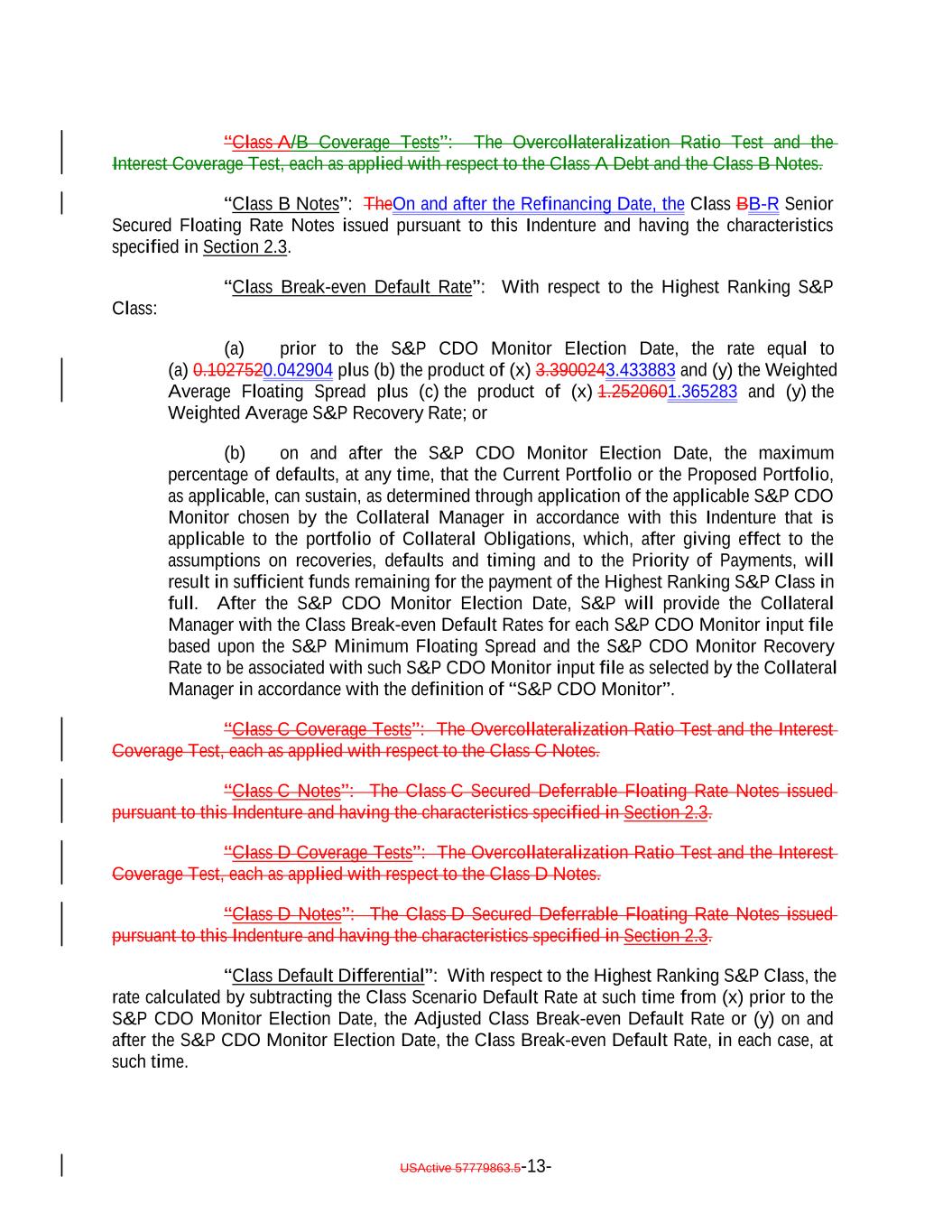 “Class A/B Coverage Tests”: The Overcollateralization Ratio Test and the Interest Coverage Test, each as applied with respect to the Class A Debt and the Class B Notes. “Class B Notes”: TheOn and after the Refinancing Date, the Class BB-R Senior Secured Floating Rate Notes issued pursuant to this Indenture and having the characteristics specified in Section 2.3. “Class Break-even Default Rate”: With respect to the Highest Ranking S&P Class: (a) prior to the S&P CDO Monitor Election Date, the rate equal to (a) 0.1027520.042904 plus (b) the product of (x) 3.3900243.433883 and (y) the Weighted Average Floating Spread plus (c) the product of (x) 1.2520601.365283 and (y) the Weighted Average S&P Recovery Rate; or (b) on and after the S&P CDO Monitor Election Date, the maximum percentage of defaults, at any time, that the Current Portfolio or the Proposed Portfolio, as applicable, can sustain, as determined through application of the applicable S&P CDO Monitor chosen by the Collateral Manager in accordance with this Indenture that is applicable to the portfolio of Collateral Obligations, which, after giving effect to the assumptions on recoveries, defaults and timing and to the Priority of Payments, will result in sufficient funds remaining for the payment of the Highest Ranking S&P Class in full. After the S&P CDO Monitor Election Date, S&P will provide the Collateral Manager with the Class Break-even Default Rates for each S&P CDO Monitor input file based upon the S&P Minimum Floating Spread and the S&P CDO Monitor Recovery Rate to be associated with such S&P CDO Monitor input file as selected by the Collateral Manager in accordance with the definition of “S&P CDO Monitor”. “Class C Coverage Tests”: The Overcollateralization Ratio Test and the Interest Coverage Test, each as applied with respect to the Class C Notes. “Class C Notes”: The Class C Secured Deferrable Floating Rate Notes issued pursuant to this Indenture and having the characteristics specified in Section 2.3. “Class D Coverage Tests”: The Overcollateralization Ratio Test and the Interest Coverage Test, each as applied with respect to the Class D Notes. “Class D Notes”: The Class D Secured Deferrable Floating Rate Notes issued pursuant to this Indenture and having the characteristics specified in Section 2.3. “Class Default Differential”: With respect to the Highest Ranking S&P Class, the rate calculated by subtracting the Class Scenario Default Rate at such time from (x) prior to the S&P CDO Monitor Election Date, the Adjusted Class Break-even Default Rate or (y) on and after the S&P CDO Monitor Election Date, the Class Break-even Default Rate, in each case, at such time. USActive 57779863.5-13-