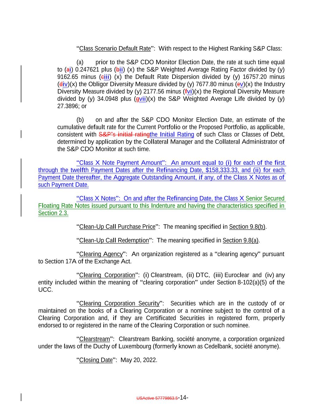 “Class Scenario Default Rate”: With respect to the Highest Ranking S&P Class: (a) prior to the S&P CDO Monitor Election Date, the rate at such time equal to (ai) 0.247621 plus (bii) (x) the S&P Weighted Average Rating Factor divided by (y) 9162.65 minus (ciii) (x) the Default Rate Dispersion divided by (y) 16757.20 minus (div)(x) the Obligor Diversity Measure divided by (y) 7677.80 minus (ev)(x) the Industry Diversity Measure divided by (y) 2177.56 minus (fvi)(x) the Regional Diversity Measure divided by (y) 34.0948 plus (gvii)(x) the S&P Weighted Average Life divided by (y) 27.3896; or (b) on and after the S&P CDO Monitor Election Date, an estimate of the cumulative default rate for the Current Portfolio or the Proposed Portfolio, as applicable, consistent with S&P’s initial ratingthe Initial Rating of such Class or Classes of Debt, determined by application by the Collateral Manager and the Collateral Administrator of the S&P CDO Monitor at such time. “Class X Note Payment Amount”: An amount equal to (i) for each of the first through the twelfth Payment Dates after the Refinancing Date, $158,333.33, and (ii) for each Payment Date thereafter, the Aggregate Outstanding Amount, if any, of the Class X Notes as of such Payment Date. “Class X Notes”: On and after the Refinancing Date, the Class X Senior Secured Floating Rate Notes issued pursuant to this Indenture and having the characteristics specified in Section 2.3. “Clean-Up Call Purchase Price”: The meaning specified in Section 9.8(b). “Clean-Up Call Redemption”: The meaning specified in Section 9.8(a). “Clearing Agency”: An organization registered as a “clearing agency” pursuant to Section 17A of the Exchange Act. “Clearing Corporation”: (i) Clearstream, (ii) DTC, (iii) Euroclear and (iv) any entity included within the meaning of “clearing corporation” under Section 8-102(a)(5) of the UCC. “Clearing Corporation Security”: Securities which are in the custody of or maintained on the books of a Clearing Corporation or a nominee subject to the control of a Clearing Corporation and, if they are Certificated Securities in registered form, properly endorsed to or registered in the name of the Clearing Corporation or such nominee. “Clearstream”: Clearstream Banking, société anonyme, a corporation organized under the laws of the Duchy of Luxembourg (formerly known as Cedelbank, société anonyme). “Closing Date”: May 20, 2022. USActive 57779863.5-14-