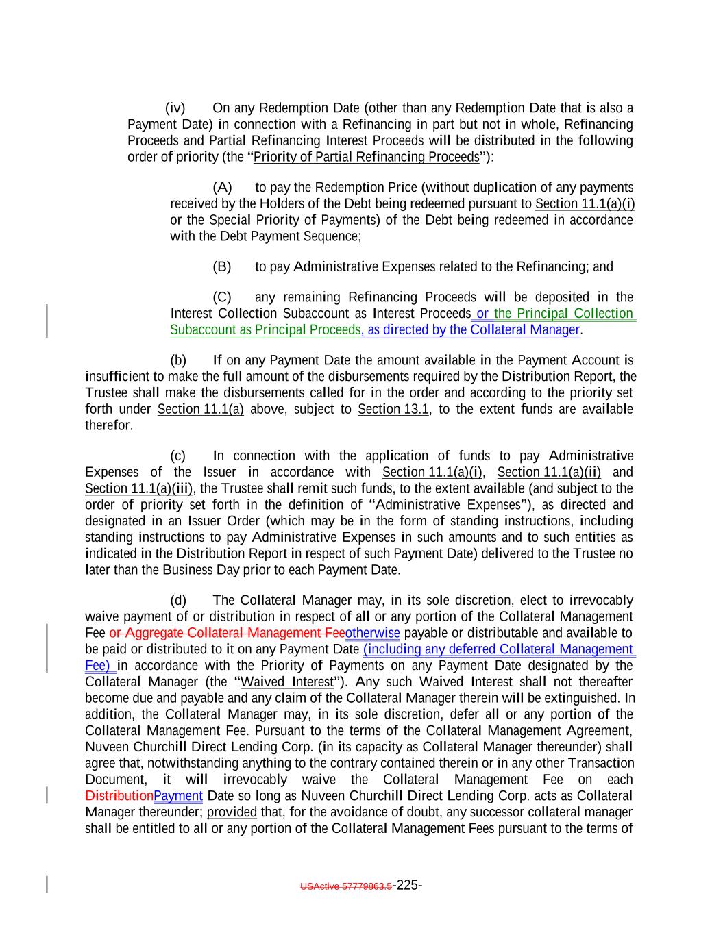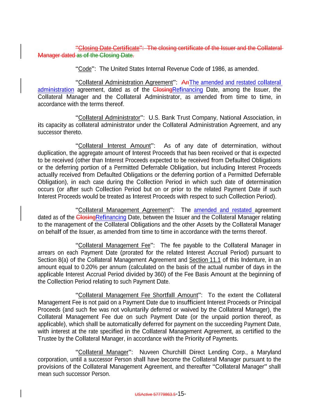 “Closing Date Certificate”: The closing certificate of the Issuer and the Collateral Manager dated as of the Closing Date. “Code”: The United States Internal Revenue Code of 1986, as amended. “Collateral Administration Agreement”: AnThe amended and restated collateral administration agreement, dated as of the ClosingRefinancing Date, among the Issuer, the Collateral Manager and the Collateral Administrator, as amended from time to time, in accordance with the terms thereof. “Collateral Administrator”: U.S. Bank Trust Company, National Association, in its capacity as collateral administrator under the Collateral Administration Agreement, and any successor thereto. “Collateral Interest Amount”: As of any date of determination, without duplication, the aggregate amount of Interest Proceeds that has been received or that is expected to be received (other than Interest Proceeds expected to be received from Defaulted Obligations or the deferring portion of a Permitted Deferrable Obligation, but including Interest Proceeds actually received from Defaulted Obligations or the deferring portion of a Permitted Deferrable Obligation), in each case during the Collection Period in which such date of determination occurs (or after such Collection Period but on or prior to the related Payment Date if such Interest Proceeds would be treated as Interest Proceeds with respect to such Collection Period). “Collateral Management Agreement”: The amended and restated agreement dated as of the ClosingRefinancing Date, between the Issuer and the Collateral Manager relating to the management of the Collateral Obligations and the other Assets by the Collateral Manager on behalf of the Issuer, as amended from time to time in accordance with the terms thereof. “Collateral Management Fee”: The fee payable to the Collateral Manager in arrears on each Payment Date (prorated for the related Interest Accrual Period) pursuant to Section 8(a) of the Collateral Management Agreement and Section 11.1 of this Indenture, in an amount equal to 0.20% per annum (calculated on the basis of the actual number of days in the applicable Interest Accrual Period divided by 360) of the Fee Basis Amount at the beginning of the Collection Period relating to such Payment Date. “Collateral Management Fee Shortfall Amount”: To the extent the Collateral Management Fee is not paid on a Payment Date due to insufficient Interest Proceeds or Principal Proceeds (and such fee was not voluntarily deferred or waived by the Collateral Manager), the Collateral Management Fee due on such Payment Date (or the unpaid portion thereof, as applicable), which shall be automatically deferred for payment on the succeeding Payment Date, with interest at the rate specified in the Collateral Management Agreement, as certified to the Trustee by the Collateral Manager, in accordance with the Priority of Payments. “Collateral Manager”: Nuveen Churchill Direct Lending Corp., a Maryland corporation, until a successor Person shall have become the Collateral Manager pursuant to the provisions of the Collateral Management Agreement, and thereafter “Collateral Manager” shall mean such successor Person. USActive 57779863.5-15-