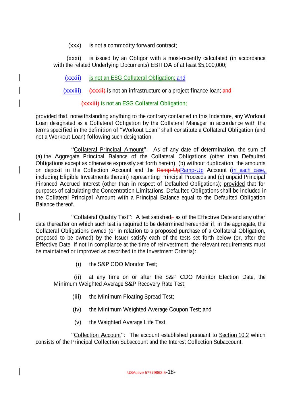 (xxx) is not a commodity forward contract; (xxxi) is issued by an Obligor with a most-recently calculated (in accordance with the related Underlying Documents) EBITDA of at least $5,000,000; (xxxii) is not an ESG Collateral Obligation; and (xxxiii) (xxxii) is not an infrastructure or a project finance loan; and (xxxiii) is not an ESG Collateral Obligation; provided that, notwithstanding anything to the contrary contained in this Indenture, any Workout Loan designated as a Collateral Obligation by the Collateral Manager in accordance with the terms specified in the definition of “Workout Loan” shall constitute a Collateral Obligation (and not a Workout Loan) following such designation. “Collateral Principal Amount”: As of any date of determination, the sum of (a) the Aggregate Principal Balance of the Collateral Obligations (other than Defaulted Obligations except as otherwise expressly set forth herein), (b) without duplication, the amounts on deposit in the Collection Account and the Ramp-UpRamp-Up Account (in each case, including Eligible Investments therein) representing Principal Proceeds and (c) unpaid Principal Financed Accrued Interest (other than in respect of Defaulted Obligations); provided that for purposes of calculating the Concentration Limitations, Defaulted Obligations shall be included in the Collateral Principal Amount with a Principal Balance equal to the Defaulted Obligation Balance thereof. “Collateral Quality Test”: A test satisfied, as of the Effective Date and any other date thereafter on which such test is required to be determined hereunder if, in the aggregate, the Collateral Obligations owned (or in relation to a proposed purchase of a Collateral Obligation, proposed to be owned) by the Issuer satisfy each of the tests set forth below (or, after the Effective Date, if not in compliance at the time of reinvestment, the relevant requirements must be maintained or improved as described in the Investment Criteria): (i) the S&P CDO Monitor Test; (ii) at any time on or after the S&P CDO Monitor Election Date, the Minimum Weighted Average S&P Recovery Rate Test; (iii) the Minimum Floating Spread Test; (iv) the Minimum Weighted Average Coupon Test; and (v) the Weighted Average Life Test. “Collection Account”: The account established pursuant to Section 10.2 which consists of the Principal Collection Subaccount and the Interest Collection Subaccount. USActive 57779863.5-18-