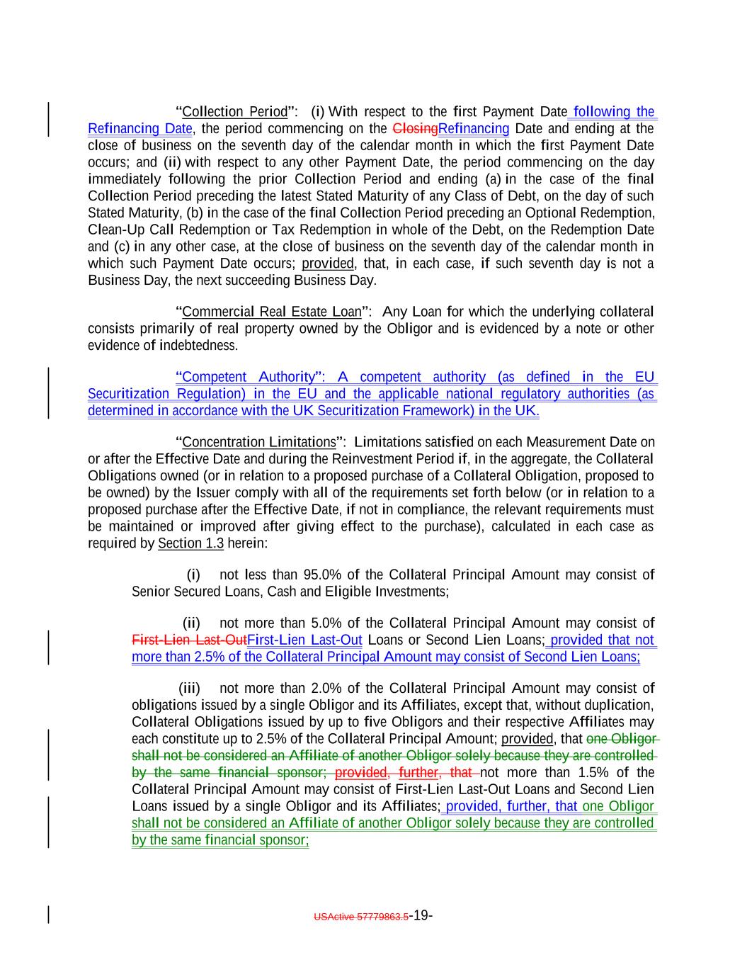 “Collection Period”: (i) With respect to the first Payment Date following the Refinancing Date, the period commencing on the ClosingRefinancing Date and ending at the close of business on the seventh day of the calendar month in which the first Payment Date occurs; and (ii) with respect to any other Payment Date, the period commencing on the day immediately following the prior Collection Period and ending (a) in the case of the final Collection Period preceding the latest Stated Maturity of any Class of Debt, on the day of such Stated Maturity, (b) in the case of the final Collection Period preceding an Optional Redemption, Clean-Up Call Redemption or Tax Redemption in whole of the Debt, on the Redemption Date and (c) in any other case, at the close of business on the seventh day of the calendar month in which such Payment Date occurs; provided, that, in each case, if such seventh day is not a Business Day, the next succeeding Business Day. “Commercial Real Estate Loan”: Any Loan for which the underlying collateral consists primarily of real property owned by the Obligor and is evidenced by a note or other evidence of indebtedness. “Competent Authority”: A competent authority (as defined in the EU Securitization Regulation) in the EU and the applicable national regulatory authorities (as determined in accordance with the UK Securitization Framework) in the UK. “Concentration Limitations”: Limitations satisfied on each Measurement Date on or after the Effective Date and during the Reinvestment Period if, in the aggregate, the Collateral Obligations owned (or in relation to a proposed purchase of a Collateral Obligation, proposed to be owned) by the Issuer comply with all of the requirements set forth below (or in relation to a proposed purchase after the Effective Date, if not in compliance, the relevant requirements must be maintained or improved after giving effect to the purchase), calculated in each case as required by Section 1.3 herein: (i) not less than 95.0% of the Collateral Principal Amount may consist of Senior Secured Loans, Cash and Eligible Investments; (ii) not more than 5.0% of the Collateral Principal Amount may consist of First-Lien Last-OutFirst-Lien Last-Out Loans or Second Lien Loans; provided that not more than 2.5% of the Collateral Principal Amount may consist of Second Lien Loans; (iii) not more than 2.0% of the Collateral Principal Amount may consist of obligations issued by a single Obligor and its Affiliates, except that, without duplication, Collateral Obligations issued by up to five Obligors and their respective Affiliates may each constitute up to 2.5% of the Collateral Principal Amount; provided, that one Obligor shall not be considered an Affiliate of another Obligor solely because they are controlled by the same financial sponsor; provided, further, that not more than 1.5% of the Collateral Principal Amount may consist of First-Lien Last-Out Loans and Second Lien Loans issued by a single Obligor and its Affiliates; provided, further, that one Obligor shall not be considered an Affiliate of another Obligor solely because they are controlled by the same financial sponsor; USActive 57779863.5-19-
