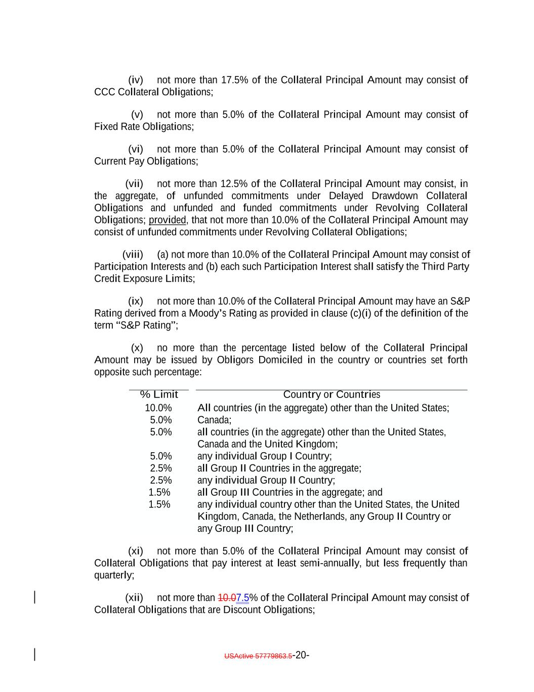USActive 57779863.5-20- 5.0% All countries (in the aggregate) other than the United States; any individual Group I Country; % Limit 2.5% all Group II Countries in the aggregate; 5.0% Country or Countries 2.5% Canada; any individual Group II Country; (iv) not more than 17.5% of the Collateral Principal Amount may consist of CCC Collateral Obligations; (v) not more than 5.0% of the Collateral Principal Amount may consist of Fixed Rate Obligations; (vi) not more than 5.0% of the Collateral Principal Amount may consist of Current Pay Obligations; (vii) not more than 12.5% of the Collateral Principal Amount may consist, in the aggregate, of unfunded commitments under Delayed Drawdown Collateral Obligations and unfunded and funded commitments under Revolving Collateral Obligations; provided, that not more than 10.0% of the Collateral Principal Amount may consist of unfunded commitments under Revolving Collateral Obligations; (viii) (a) not more than 10.0% of the Collateral Principal Amount may consist of Participation Interests and (b) each such Participation Interest shall satisfy the Third Party Credit Exposure Limits; (ix) not more than 10.0% of the Collateral Principal Amount may have an S&P Rating derived from a Moody’s Rating as provided in clause (c)(i) of the definition of the term “S&P Rating”; (x) no more than the percentage listed below of the Collateral Principal Amount may be issued by Obligors Domiciled in the country or countries set forth opposite such percentage: 1.5% all Group III Countries in the aggregate; and 5.0% 1.5% all countries (in the aggregate) other than the United States, Canada and the United Kingdom; any individual country other than the United States, the United Kingdom, Canada, the Netherlands, any Group II Country or any Group III Country; 10.0% (xi) not more than 5.0% of the Collateral Principal Amount may consist of Collateral Obligations that pay interest at least semi-annually, but less frequently than quarterly; (xii) not more than 10.07.5% of the Collateral Principal Amount may consist of Collateral Obligations that are Discount Obligations;
