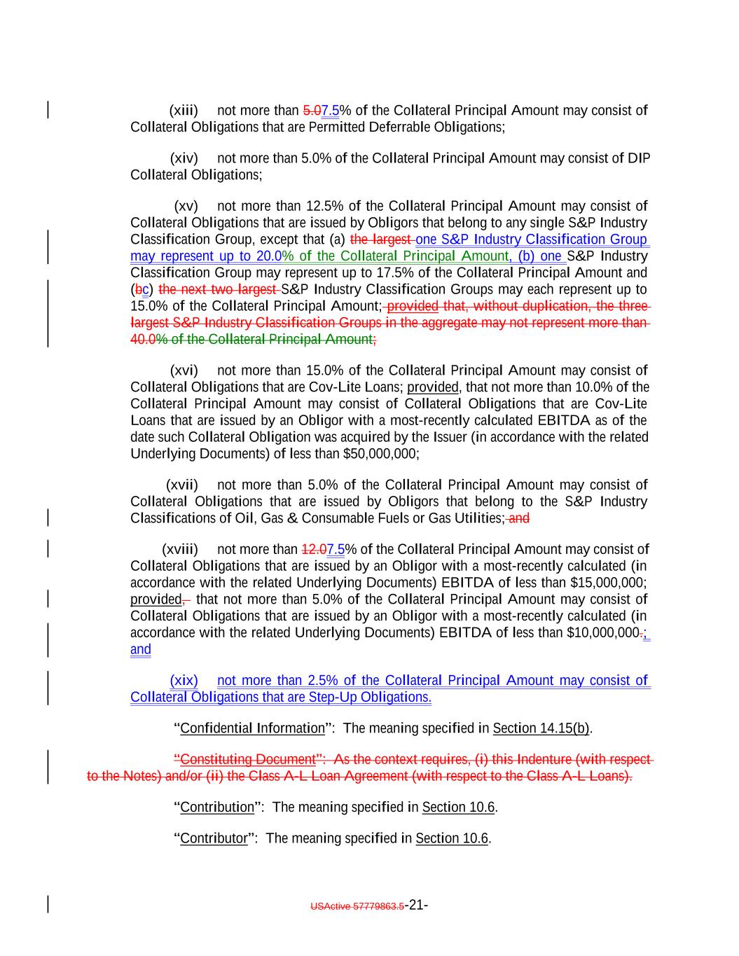 (xiii) not more than 5.07.5% of the Collateral Principal Amount may consist of Collateral Obligations that are Permitted Deferrable Obligations; (xiv) not more than 5.0% of the Collateral Principal Amount may consist of DIP Collateral Obligations; (xv) not more than 12.5% of the Collateral Principal Amount may consist of Collateral Obligations that are issued by Obligors that belong to any single S&P Industry Classification Group, except that (a) the largest one S&P Industry Classification Group may represent up to 20.0% of the Collateral Principal Amount, (b) one S&P Industry Classification Group may represent up to 17.5% of the Collateral Principal Amount and (bc) the next two largest S&P Industry Classification Groups may each represent up to 15.0% of the Collateral Principal Amount; provided that, without duplication, the three largest S&P Industry Classification Groups in the aggregate may not represent more than 40.0% of the Collateral Principal Amount; (xvi) not more than 15.0% of the Collateral Principal Amount may consist of Collateral Obligations that are Cov-Lite Loans; provided, that not more than 10.0% of the Collateral Principal Amount may consist of Collateral Obligations that are Cov-Lite Loans that are issued by an Obligor with a most-recently calculated EBITDA as of the date such Collateral Obligation was acquired by the Issuer (in accordance with the related Underlying Documents) of less than $50,000,000; (xvii) not more than 5.0% of the Collateral Principal Amount may consist of Collateral Obligations that are issued by Obligors that belong to the S&P Industry Classifications of Oil, Gas & Consumable Fuels or Gas Utilities; and (xviii) not more than 12.07.5% of the Collateral Principal Amount may consist of Collateral Obligations that are issued by an Obligor with a most-recently calculated (in accordance with the related Underlying Documents) EBITDA of less than $15,000,000; provided, that not more than 5.0% of the Collateral Principal Amount may consist of Collateral Obligations that are issued by an Obligor with a most-recently calculated (in accordance with the related Underlying Documents) EBITDA of less than $10,000,000.; and (xix) not more than 2.5% of the Collateral Principal Amount may consist of Collateral Obligations that are Step-Up Obligations. “Confidential Information”: The meaning specified in Section 14.15(b). “Constituting Document”: As the context requires, (i) this Indenture (with respect to the Notes) and/or (ii) the Class A-L Loan Agreement (with respect to the Class A-L Loans). “Contribution”: The meaning specified in Section 10.6. “Contributor”: The meaning specified in Section 10.6. USActive 57779863.5-21-
