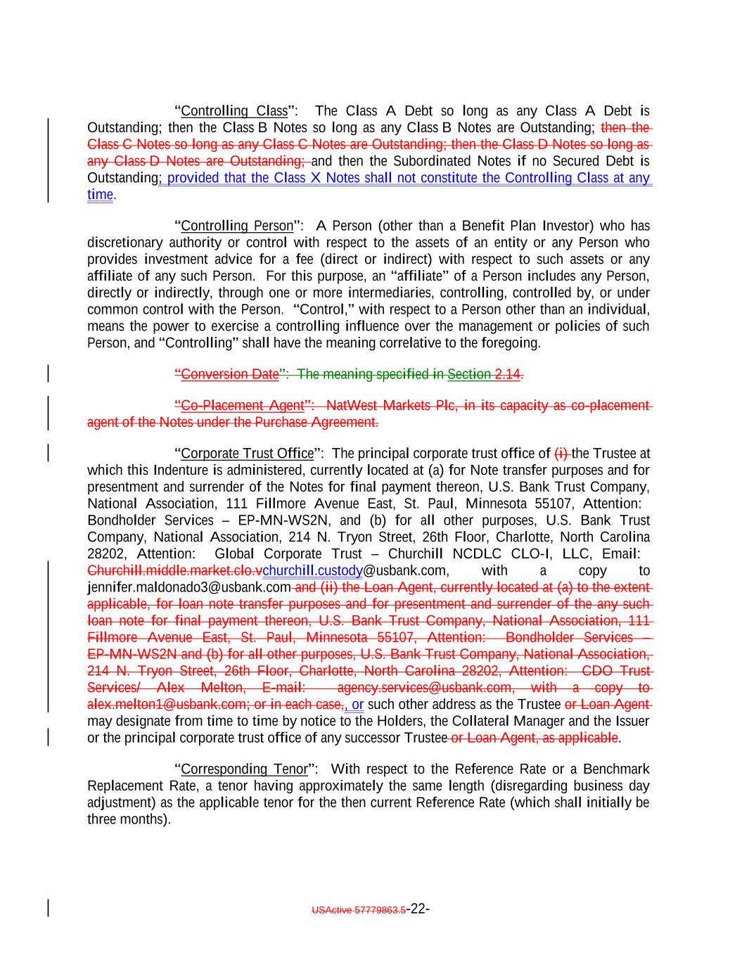 “Controlling Class”: The Class A Debt so long as any Class A Debt is Outstanding; then the Class B Notes so long as any Class B Notes are Outstanding; then the Class C Notes so long as any Class C Notes are Outstanding; then the Class D Notes so long as any Class D Notes are Outstanding; and then the Subordinated Notes if no Secured Debt is Outstanding; provided that the Class X Notes shall not constitute the Controlling Class at any time. “Controlling Person”: A Person (other than a Benefit Plan Investor) who has discretionary authority or control with respect to the assets of an entity or any Person who provides investment advice for a fee (direct or indirect) with respect to such assets or any affiliate of any such Person. For this purpose, an “affiliate” of a Person includes any Person, directly or indirectly, through one or more intermediaries, controlling, controlled by, or under common control with the Person. “Control,” with respect to a Person other than an individual, means the power to exercise a controlling influence over the management or policies of such Person, and “Controlling” shall have the meaning correlative to the foregoing. “Conversion Date”: The meaning specified in Section 2.14. “Co-Placement Agent”: NatWest Markets Plc, in its capacity as co-placement agent of the Notes under the Purchase Agreement. “Corporate Trust Office”: The principal corporate trust office of (i) the Trustee at which this Indenture is administered, currently located at (a) for Note transfer purposes and for presentment and surrender of the Notes for final payment thereon, U.S. Bank Trust Company, National Association, 111 Fillmore Avenue East, St. Paul, Minnesota 55107, Attention: Bondholder Services – EP-MN-WS2N, and (b) for all other purposes, U.S. Bank Trust Company, National Association, 214 N. Tryon Street, 26th Floor, Charlotte, North Carolina 28202, Attention: Global Corporate Trust – Churchill NCDLC CLO-I, LLC, Email: Churchill.middle.market.clo.vchurchill.custody@usbank.com, with a copy to jennifer.maldonado3@usbank.com and (ii) the Loan Agent, currently located at (a) to the extent applicable, for loan note transfer purposes and for presentment and surrender of the any such loan note for final payment thereon, U.S. Bank Trust Company, National Association, 111 Fillmore Avenue East, St. Paul, Minnesota 55107, Attention: Bondholder Services – EP-MN-WS2N and (b) for all other purposes, U.S. Bank Trust Company, National Association, 214 N. Tryon Street, 26th Floor, Charlotte, North Carolina 28202, Attention: CDO Trust Services/ Alex Melton, E-mail: agency.services@usbank.com, with a copy to alex.melton1@usbank.com; or in each case,, or such other address as the Trustee or Loan Agent may designate from time to time by notice to the Holders, the Collateral Manager and the Issuer or the principal corporate trust office of any successor Trustee or Loan Agent, as applicable. “Corresponding Tenor”: With respect to the Reference Rate or a Benchmark Replacement Rate, a tenor having approximately the same length (disregarding business day adjustment) as the applicable tenor for the then current Reference Rate (which shall initially be three months). USActive 57779863.5-22-