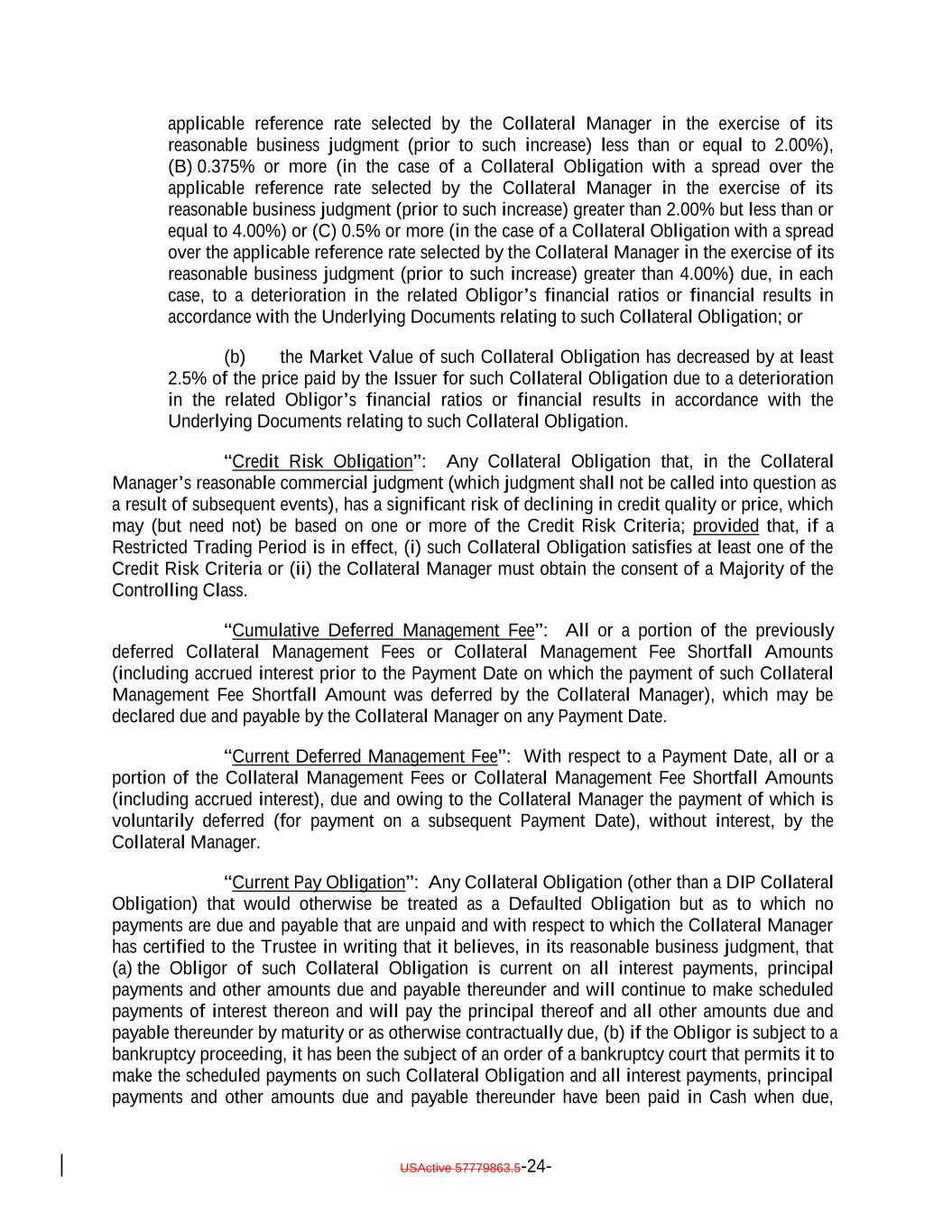 applicable reference rate selected by the Collateral Manager in the exercise of its reasonable business judgment (prior to such increase) less than or equal to 2.00%), (B) 0.375% or more (in the case of a Collateral Obligation with a spread over the applicable reference rate selected by the Collateral Manager in the exercise of its reasonable business judgment (prior to such increase) greater than 2.00% but less than or equal to 4.00%) or (C) 0.5% or more (in the case of a Collateral Obligation with a spread over the applicable reference rate selected by the Collateral Manager in the exercise of its reasonable business judgment (prior to such increase) greater than 4.00%) due, in each case, to a deterioration in the related Obligor’s financial ratios or financial results in accordance with the Underlying Documents relating to such Collateral Obligation; or (b) the Market Value of such Collateral Obligation has decreased by at least 2.5% of the price paid by the Issuer for such Collateral Obligation due to a deterioration in the related Obligor’s financial ratios or financial results in accordance with the Underlying Documents relating to such Collateral Obligation. “Credit Risk Obligation”: Any Collateral Obligation that, in the Collateral Manager’s reasonable commercial judgment (which judgment shall not be called into question as a result of subsequent events), has a significant risk of declining in credit quality or price, which may (but need not) be based on one or more of the Credit Risk Criteria; provided that, if a Restricted Trading Period is in effect, (i) such Collateral Obligation satisfies at least one of the Credit Risk Criteria or (ii) the Collateral Manager must obtain the consent of a Majority of the Controlling Class. “Cumulative Deferred Management Fee”: All or a portion of the previously deferred Collateral Management Fees or Collateral Management Fee Shortfall Amounts (including accrued interest prior to the Payment Date on which the payment of such Collateral Management Fee Shortfall Amount was deferred by the Collateral Manager), which may be declared due and payable by the Collateral Manager on any Payment Date. “Current Deferred Management Fee”: With respect to a Payment Date, all or a portion of the Collateral Management Fees or Collateral Management Fee Shortfall Amounts (including accrued interest), due and owing to the Collateral Manager the payment of which is voluntarily deferred (for payment on a subsequent Payment Date), without interest, by the Collateral Manager. “Current Pay Obligation”: Any Collateral Obligation (other than a DIP Collateral Obligation) that would otherwise be treated as a Defaulted Obligation but as to which no payments are due and payable that are unpaid and with respect to which the Collateral Manager has certified to the Trustee in writing that it believes, in its reasonable business judgment, that (a) the Obligor of such Collateral Obligation is current on all interest payments, principal payments and other amounts due and payable thereunder and will continue to make scheduled payments of interest thereon and will pay the principal thereof and all other amounts due and payable thereunder by maturity or as otherwise contractually due, (b) if the Obligor is subject to a bankruptcy proceeding, it has been the subject of an order of a bankruptcy court that permits it to make the scheduled payments on such Collateral Obligation and all interest payments, principal payments and other amounts due and payable thereunder have been paid in Cash when due, USActive 57779863.5-24-