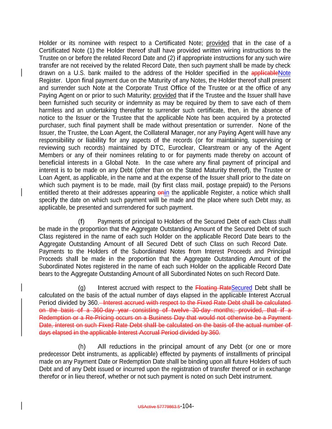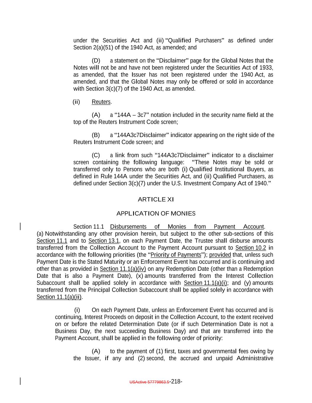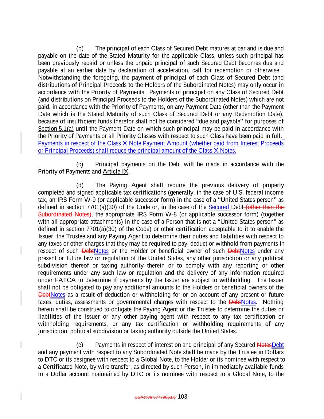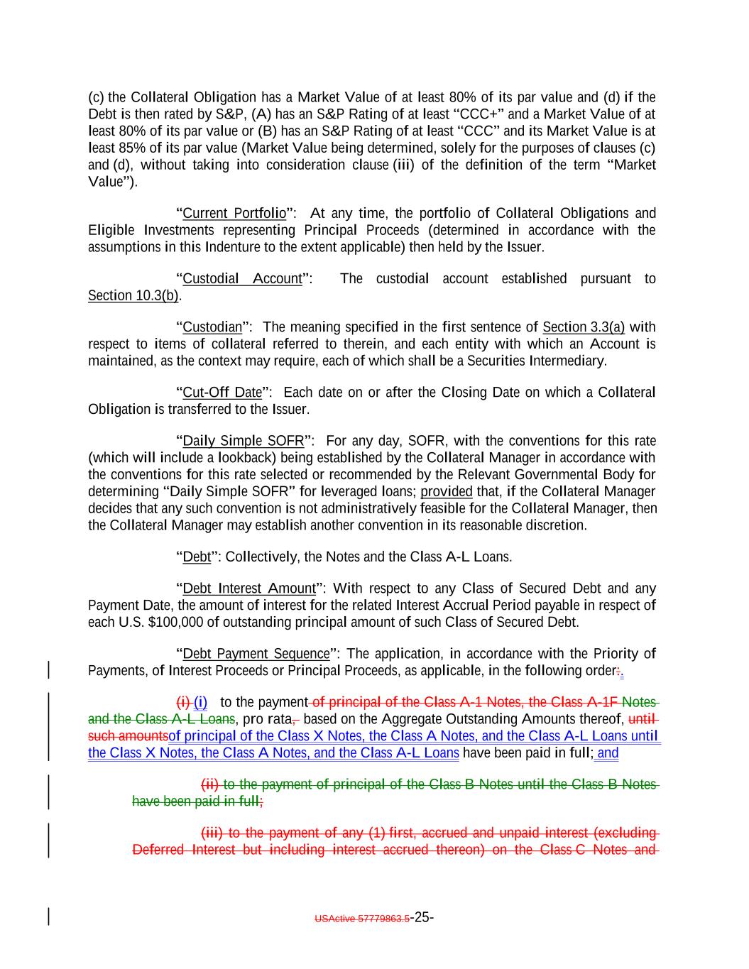(c) the Collateral Obligation has a Market Value of at least 80% of its par value and (d) if the Debt is then rated by S&P, (A) has an S&P Rating of at least “CCC+” and a Market Value of at least 80% of its par value or (B) has an S&P Rating of at least “CCC” and its Market Value is at least 85% of its par value (Market Value being determined, solely for the purposes of clauses (c) and (d), without taking into consideration clause (iii) of the definition of the term “Market Value”). “Current Portfolio”: At any time, the portfolio of Collateral Obligations and Eligible Investments representing Principal Proceeds (determined in accordance with the assumptions in this Indenture to the extent applicable) then held by the Issuer. “Custodial Account”: The custodial account established pursuant to Section 10.3(b). “Custodian”: The meaning specified in the first sentence of Section 3.3(a) with respect to items of collateral referred to therein, and each entity with which an Account is maintained, as the context may require, each of which shall be a Securities Intermediary. “Cut-Off Date”: Each date on or after the Closing Date on which a Collateral Obligation is transferred to the Issuer. “Daily Simple SOFR”: For any day, SOFR, with the conventions for this rate (which will include a lookback) being established by the Collateral Manager in accordance with the conventions for this rate selected or recommended by the Relevant Governmental Body for determining “Daily Simple SOFR” for leveraged loans; provided that, if the Collateral Manager decides that any such convention is not administratively feasible for the Collateral Manager, then the Collateral Manager may establish another convention in its reasonable discretion. “Debt”: Collectively, the Notes and the Class A-L Loans. “Debt Interest Amount”: With respect to any Class of Secured Debt and any Payment Date, the amount of interest for the related Interest Accrual Period payable in respect of each U.S. $100,000 of outstanding principal amount of such Class of Secured Debt. “Debt Payment Sequence”: The application, in accordance with the Priority of Payments, of Interest Proceeds or Principal Proceeds, as applicable, in the following order:. (i) (i) to the payment of principal of the Class A-1 Notes, the Class A-1F Notes and the Class A-L Loans, pro rata, based on the Aggregate Outstanding Amounts thereof, until such amountsof principal of the Class X Notes, the Class A Notes, and the Class A-L Loans until the Class X Notes, the Class A Notes, and the Class A-L Loans have been paid in full; and (ii) to the payment of principal of the Class B Notes until the Class B Notes have been paid in full; (iii) to the payment of any (1) first, accrued and unpaid interest (excluding Deferred Interest but including interest accrued thereon) on the Class C Notes and USActive 57779863.5-25-