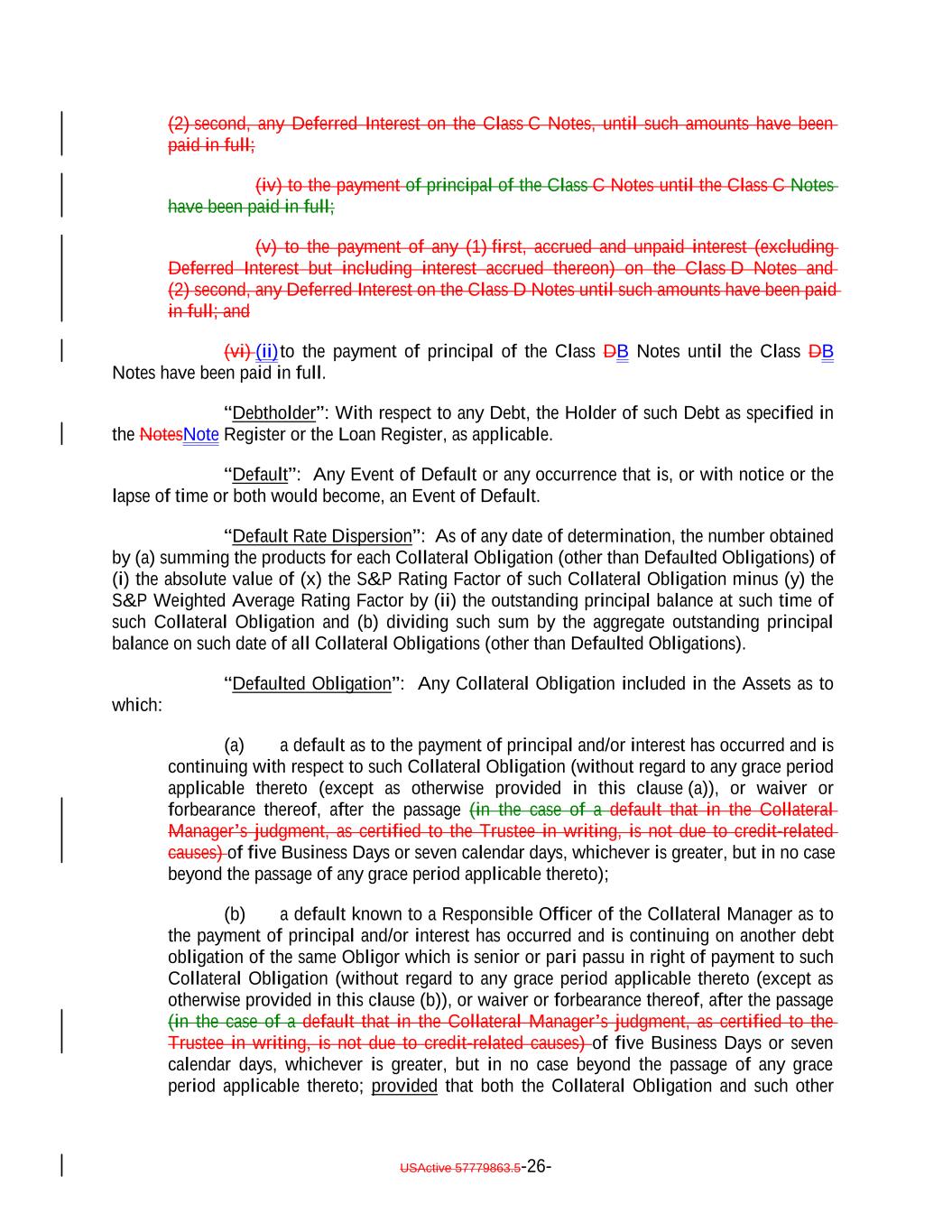 (2) second, any Deferred Interest on the Class C Notes, until such amounts have been paid in full; (iv) to the payment of principal of the Class C Notes until the Class C Notes have been paid in full; (v) to the payment of any (1) first, accrued and unpaid interest (excluding Deferred Interest but including interest accrued thereon) on the Class D Notes and (2) second, any Deferred Interest on the Class D Notes until such amounts have been paid in full; and (vi) (ii)to the payment of principal of the Class DB Notes until the Class DB Notes have been paid in full. “Debtholder”: With respect to any Debt, the Holder of such Debt as specified in the NotesNote Register or the Loan Register, as applicable. “Default”: Any Event of Default or any occurrence that is, or with notice or the lapse of time or both would become, an Event of Default. “Default Rate Dispersion”: As of any date of determination, the number obtained by (a) summing the products for each Collateral Obligation (other than Defaulted Obligations) of (i) the absolute value of (x) the S&P Rating Factor of such Collateral Obligation minus (y) the S&P Weighted Average Rating Factor by (ii) the outstanding principal balance at such time of such Collateral Obligation and (b) dividing such sum by the aggregate outstanding principal balance on such date of all Collateral Obligations (other than Defaulted Obligations). “Defaulted Obligation”: Any Collateral Obligation included in the Assets as to which: (a) a default as to the payment of principal and/or interest has occurred and is continuing with respect to such Collateral Obligation (without regard to any grace period applicable thereto (except as otherwise provided in this clause (a)), or waiver or forbearance thereof, after the passage (in the case of a default that in the Collateral Manager’s judgment, as certified to the Trustee in writing, is not due to credit-related causes) of five Business Days or seven calendar days, whichever is greater, but in no case beyond the passage of any grace period applicable thereto); (b) a default known to a Responsible Officer of the Collateral Manager as to the payment of principal and/or interest has occurred and is continuing on another debt obligation of the same Obligor which is senior or pari passu in right of payment to such Collateral Obligation (without regard to any grace period applicable thereto (except as otherwise provided in this clause (b)), or waiver or forbearance thereof, after the passage (in the case of a default that in the Collateral Manager’s judgment, as certified to the Trustee in writing, is not due to credit-related causes) of five Business Days or seven calendar days, whichever is greater, but in no case beyond the passage of any grace period applicable thereto; provided that both the Collateral Obligation and such other USActive 57779863.5-26-
