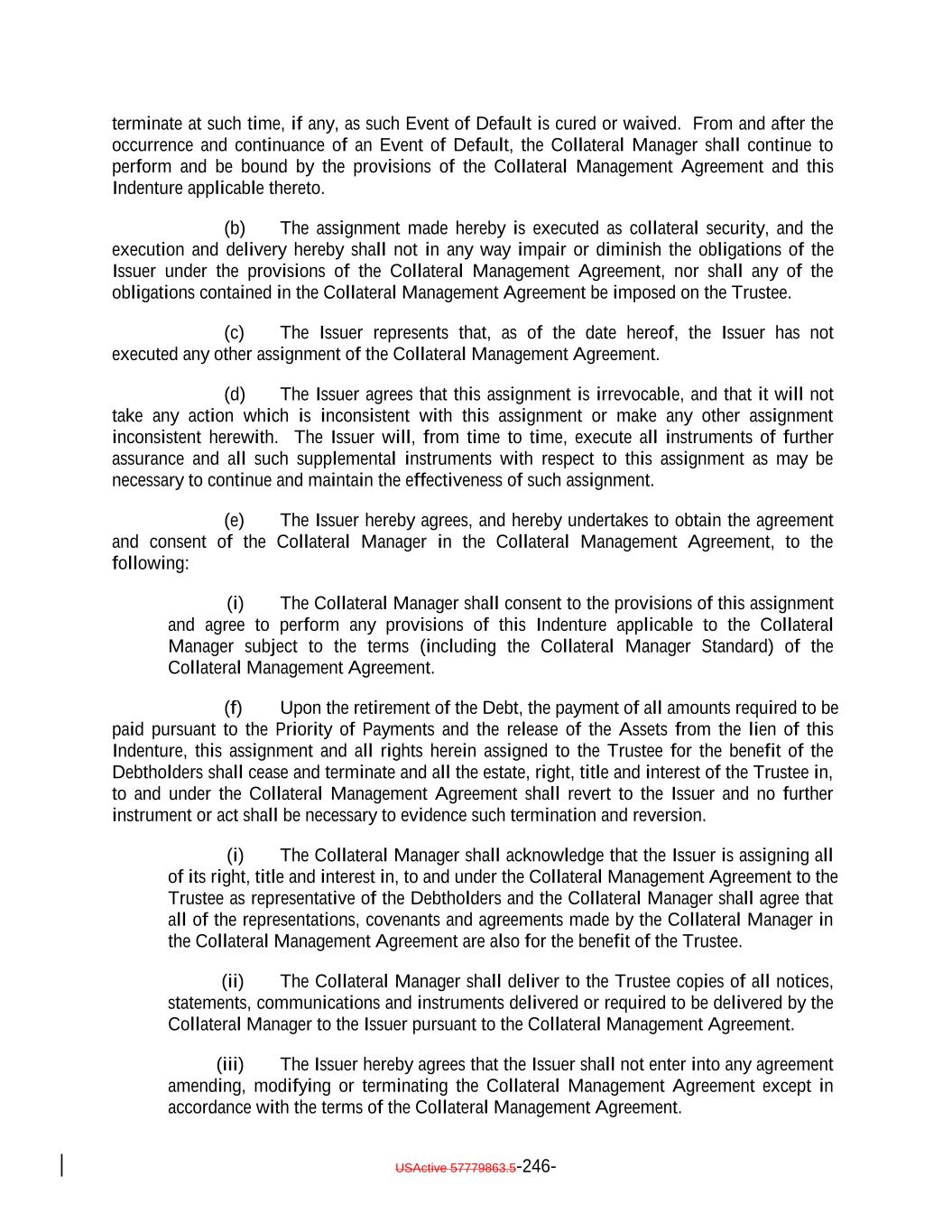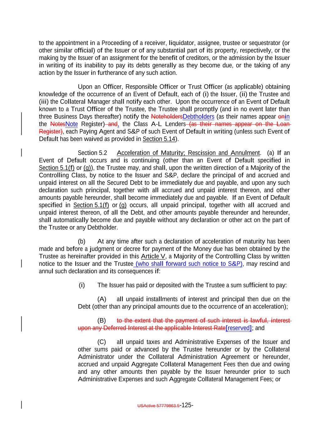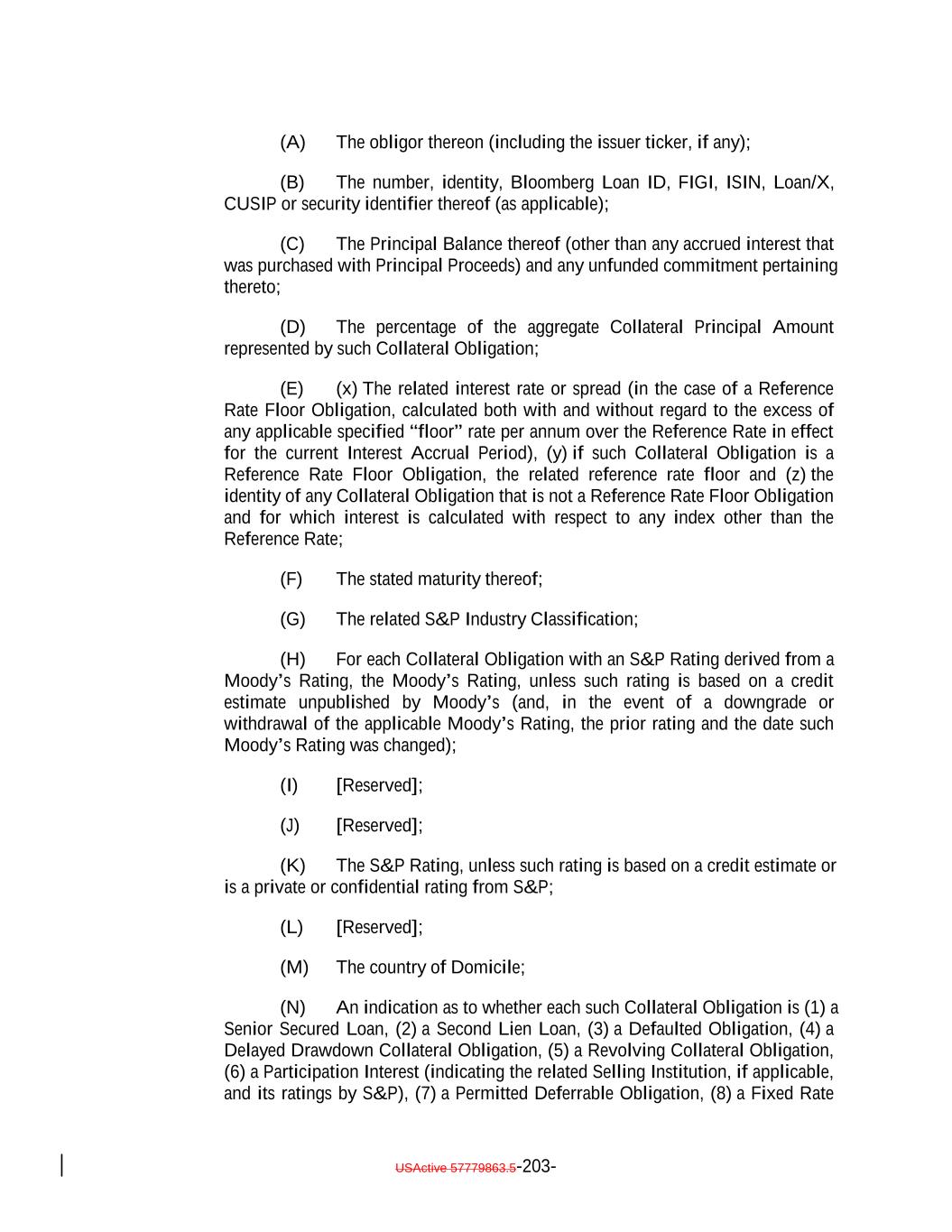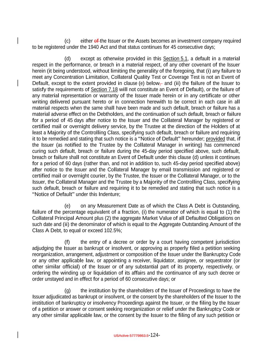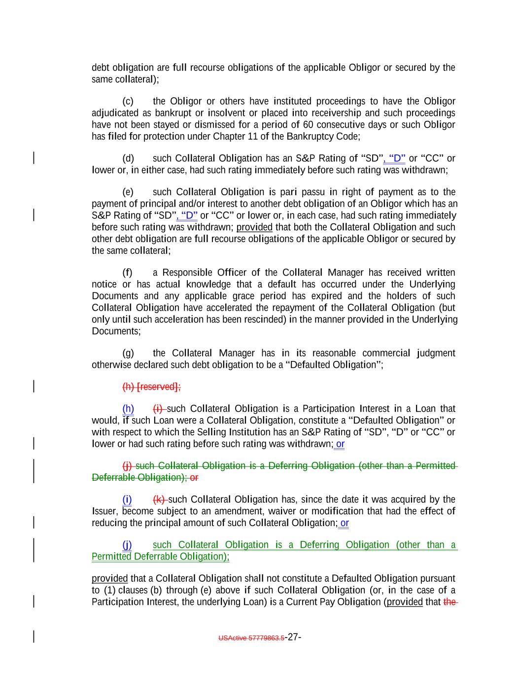 debt obligation are full recourse obligations of the applicable Obligor or secured by the same collateral); (c) the Obligor or others have instituted proceedings to have the Obligor adjudicated as bankrupt or insolvent or placed into receivership and such proceedings have not been stayed or dismissed for a period of 60 consecutive days or such Obligor has filed for protection under Chapter 11 of the Bankruptcy Code; (d) such Collateral Obligation has an S&P Rating of “SD”, “D” or “CC” or lower or, in either case, had such rating immediately before such rating was withdrawn; (e) such Collateral Obligation is pari passu in right of payment as to the payment of principal and/or interest to another debt obligation of an Obligor which has an S&P Rating of “SD”, “D” or “CC” or lower or, in each case, had such rating immediately before such rating was withdrawn; provided that both the Collateral Obligation and such other debt obligation are full recourse obligations of the applicable Obligor or secured by the same collateral; (f) a Responsible Officer of the Collateral Manager has received written notice or has actual knowledge that a default has occurred under the Underlying Documents and any applicable grace period has expired and the holders of such Collateral Obligation have accelerated the repayment of the Collateral Obligation (but only until such acceleration has been rescinded) in the manner provided in the Underlying Documents; (g) the Collateral Manager has in its reasonable commercial judgment otherwise declared such debt obligation to be a “Defaulted Obligation”; (h) [reserved]; (h) (i) such Collateral Obligation is a Participation Interest in a Loan that would, if such Loan were a Collateral Obligation, constitute a “Defaulted Obligation” or with respect to which the Selling Institution has an S&P Rating of “SD”, “D” or “CC” or lower or had such rating before such rating was withdrawn; or (j) such Collateral Obligation is a Deferring Obligation (other than a Permitted Deferrable Obligation); or (i) (k) such Collateral Obligation has, since the date it was acquired by the Issuer, become subject to an amendment, waiver or modification that had the effect of reducing the principal amount of such Collateral Obligation; or (j) such Collateral Obligation is a Deferring Obligation (other than a Permitted Deferrable Obligation); provided that a Collateral Obligation shall not constitute a Defaulted Obligation pursuant to (1) clauses (b) through (e) above if such Collateral Obligation (or, in the case of a Participation Interest, the underlying Loan) is a Current Pay Obligation (provided that the USActive 57779863.5-27-