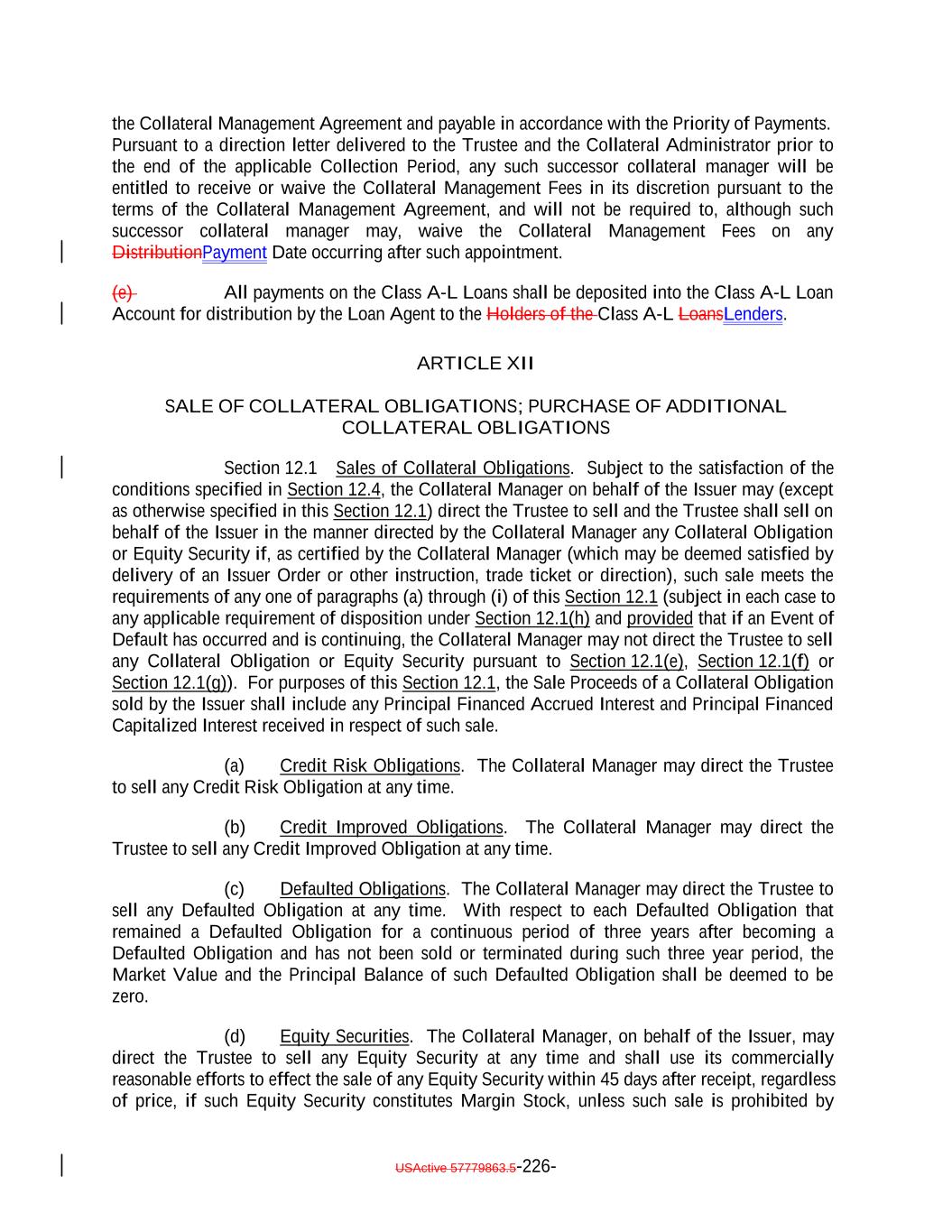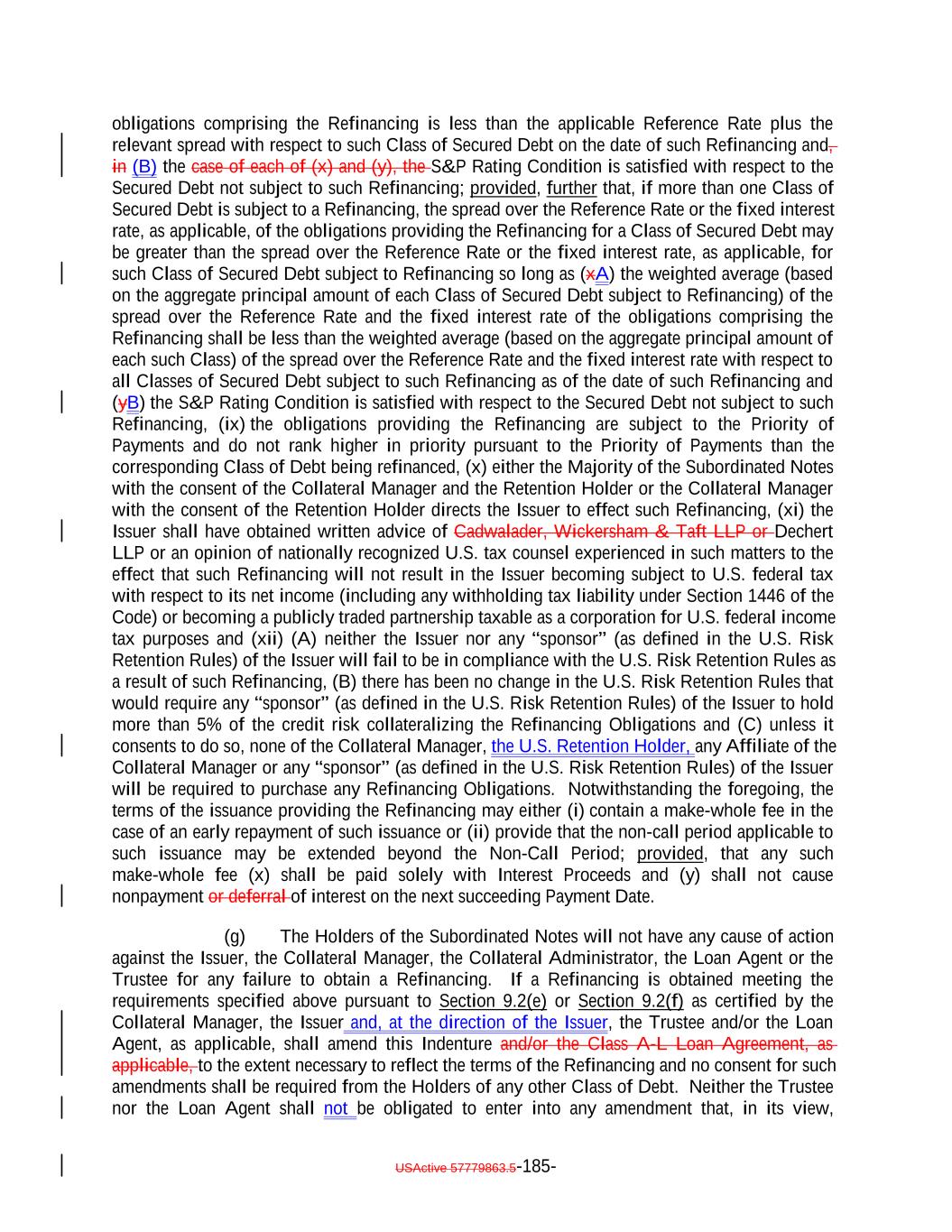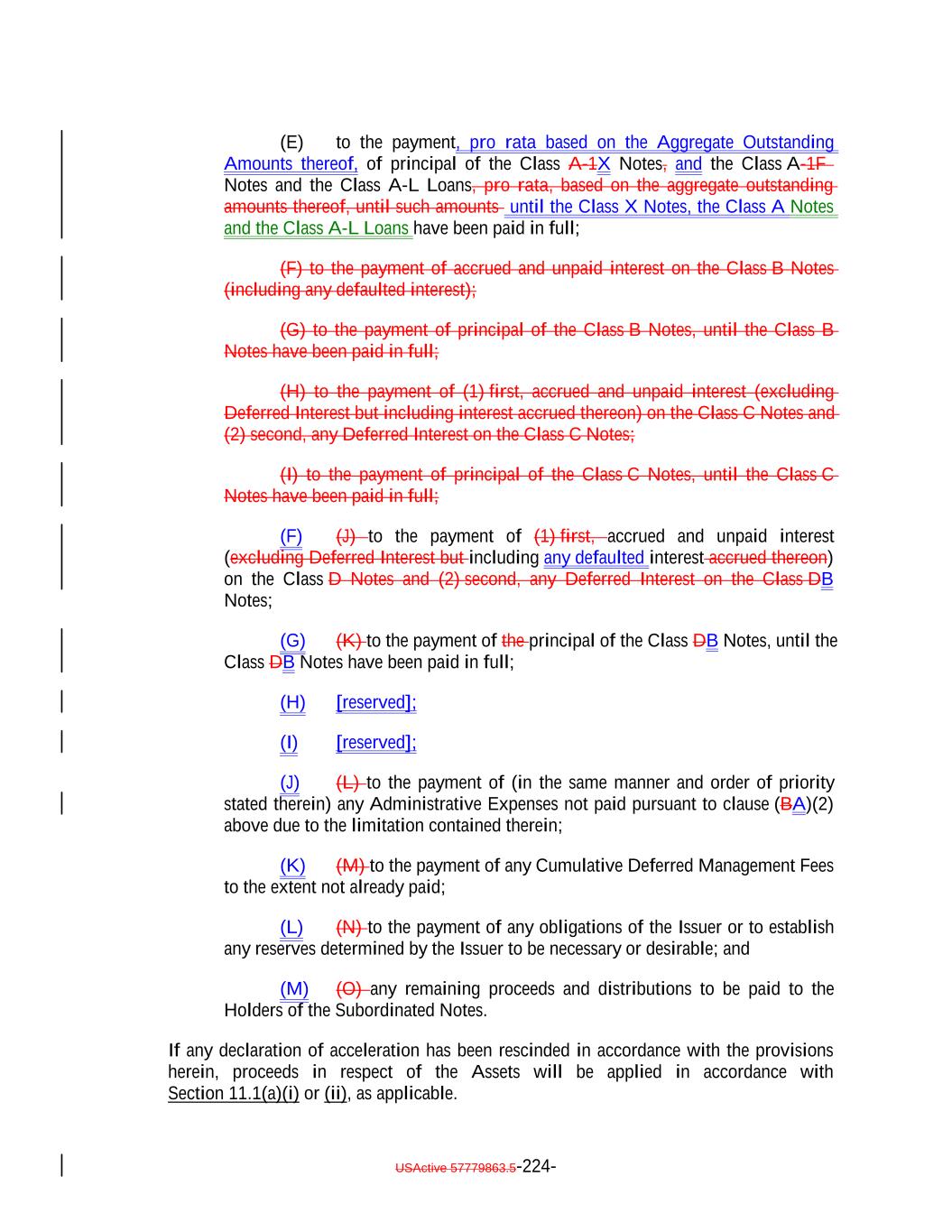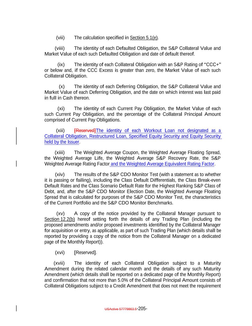 debt obligation are full recourse obligations of the applicable Obligor or secured by the same collateral); (c) the Obligor or others have instituted proceedings to have the Obligor adjudicated as bankrupt or insolvent or placed into receivership and such proceedings have not been stayed or dismissed for a period of 60 consecutive days or such Obligor has filed for protection under Chapter 11 of the Bankruptcy Code; (d) such Collateral Obligation has an S&P Rating of “SD”, “D” or “CC” or lower or, in either case, had such rating immediately before such rating was withdrawn; (e) such Collateral Obligation is pari passu in right of payment as to the payment of principal and/or interest to another debt obligation of an Obligor which has an S&P Rating of “SD”, “D” or “CC” or lower or, in each case, had such rating immediately before such rating was withdrawn; provided that both the Collateral Obligation and such other debt obligation are full recourse obligations of the applicable Obligor or secured by the same collateral; (f) a Responsible Officer of the Collateral Manager has received written notice or has actual knowledge that a default has occurred under the Underlying Documents and any applicable grace period has expired and the holders of such Collateral Obligation have accelerated the repayment of the Collateral Obligation (but only until such acceleration has been rescinded) in the manner provided in the Underlying Documents; (g) the Collateral Manager has in its reasonable commercial judgment otherwise declared such debt obligation to be a “Defaulted Obligation”; (h) [reserved]; (h) (i) such Collateral Obligation is a Participation Interest in a Loan that would, if such Loan were a Collateral Obligation, constitute a “Defaulted Obligation” or with respect to which the Selling Institution has an S&P Rating of “SD”, “D” or “CC” or lower or had such rating before such rating was withdrawn; or (j) such Collateral Obligation is a Deferring Obligation (other than a Permitted Deferrable Obligation); or (i) (k) such Collateral Obligation has, since the date it was acquired by the Issuer, become subject to an amendment, waiver or modification that had the effect of reducing the principal amount of such Collateral Obligation; or (j) such Collateral Obligation is a Deferring Obligation (other than a Permitted Deferrable Obligation); provided that a Collateral Obligation shall not constitute a Defaulted Obligation pursuant to (1) clauses (b) through (e) above if such Collateral Obligation (or, in the case of a Participation Interest, the underlying Loan) is a Current Pay Obligation (provided that the USActive 57779863.5-27-