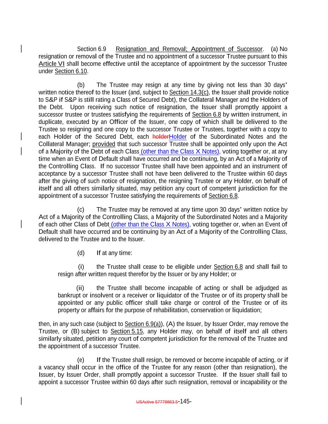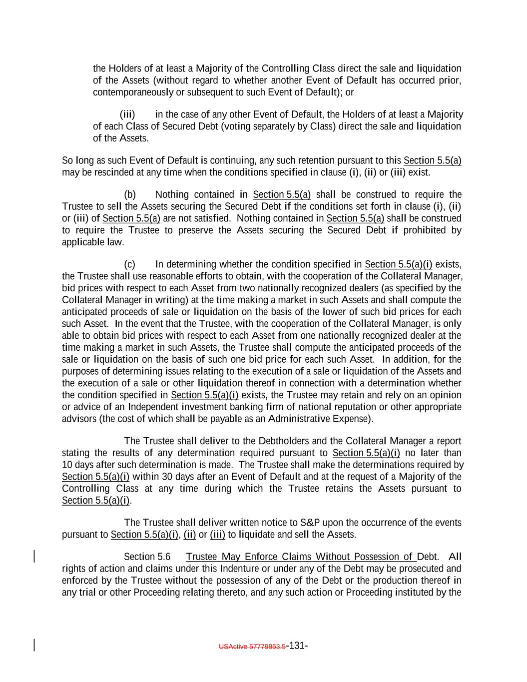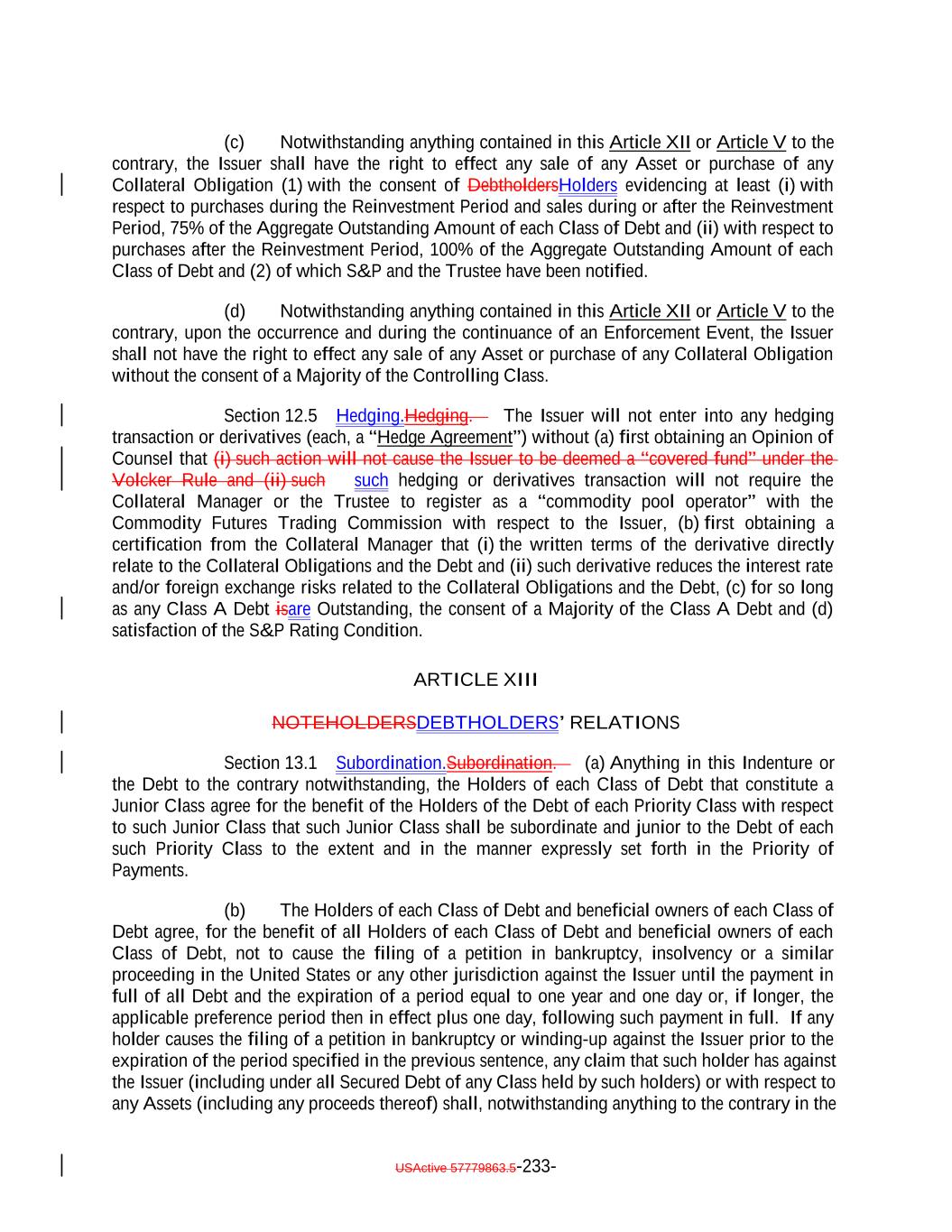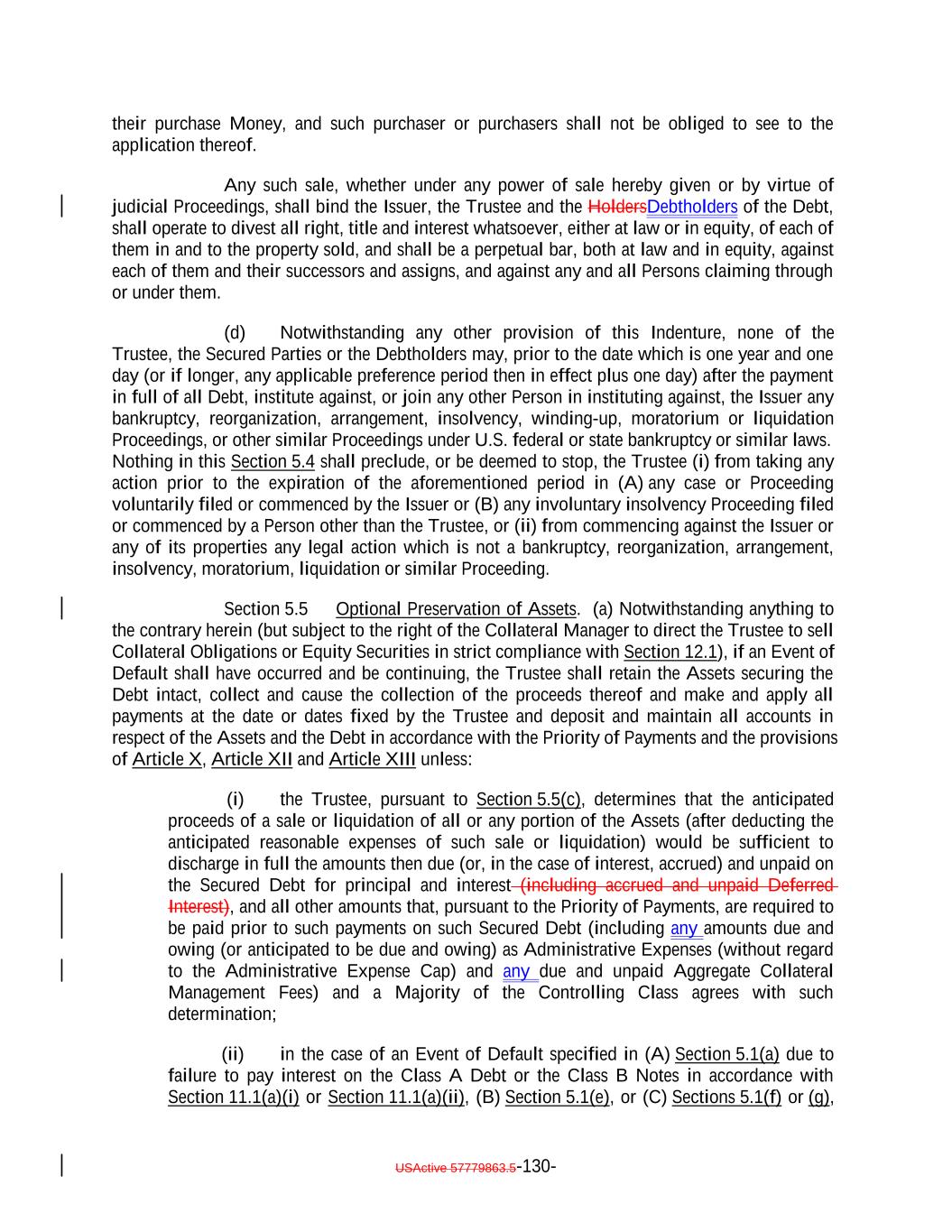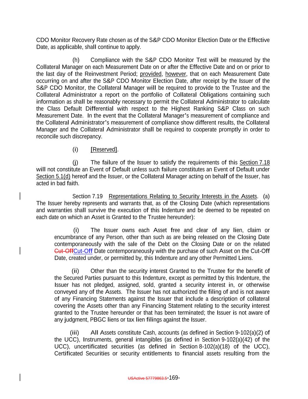 debt obligation are full recourse obligations of the applicable Obligor or secured by the same collateral); (c) the Obligor or others have instituted proceedings to have the Obligor adjudicated as bankrupt or insolvent or placed into receivership and such proceedings have not been stayed or dismissed for a period of 60 consecutive days or such Obligor has filed for protection under Chapter 11 of the Bankruptcy Code; (d) such Collateral Obligation has an S&P Rating of “SD”, “D” or “CC” or lower or, in either case, had such rating immediately before such rating was withdrawn; (e) such Collateral Obligation is pari passu in right of payment as to the payment of principal and/or interest to another debt obligation of an Obligor which has an S&P Rating of “SD”, “D” or “CC” or lower or, in each case, had such rating immediately before such rating was withdrawn; provided that both the Collateral Obligation and such other debt obligation are full recourse obligations of the applicable Obligor or secured by the same collateral; (f) a Responsible Officer of the Collateral Manager has received written notice or has actual knowledge that a default has occurred under the Underlying Documents and any applicable grace period has expired and the holders of such Collateral Obligation have accelerated the repayment of the Collateral Obligation (but only until such acceleration has been rescinded) in the manner provided in the Underlying Documents; (g) the Collateral Manager has in its reasonable commercial judgment otherwise declared such debt obligation to be a “Defaulted Obligation”; (h) [reserved]; (h) (i) such Collateral Obligation is a Participation Interest in a Loan that would, if such Loan were a Collateral Obligation, constitute a “Defaulted Obligation” or with respect to which the Selling Institution has an S&P Rating of “SD”, “D” or “CC” or lower or had such rating before such rating was withdrawn; or (j) such Collateral Obligation is a Deferring Obligation (other than a Permitted Deferrable Obligation); or (i) (k) such Collateral Obligation has, since the date it was acquired by the Issuer, become subject to an amendment, waiver or modification that had the effect of reducing the principal amount of such Collateral Obligation; or (j) such Collateral Obligation is a Deferring Obligation (other than a Permitted Deferrable Obligation); provided that a Collateral Obligation shall not constitute a Defaulted Obligation pursuant to (1) clauses (b) through (e) above if such Collateral Obligation (or, in the case of a Participation Interest, the underlying Loan) is a Current Pay Obligation (provided that the USActive 57779863.5-27-